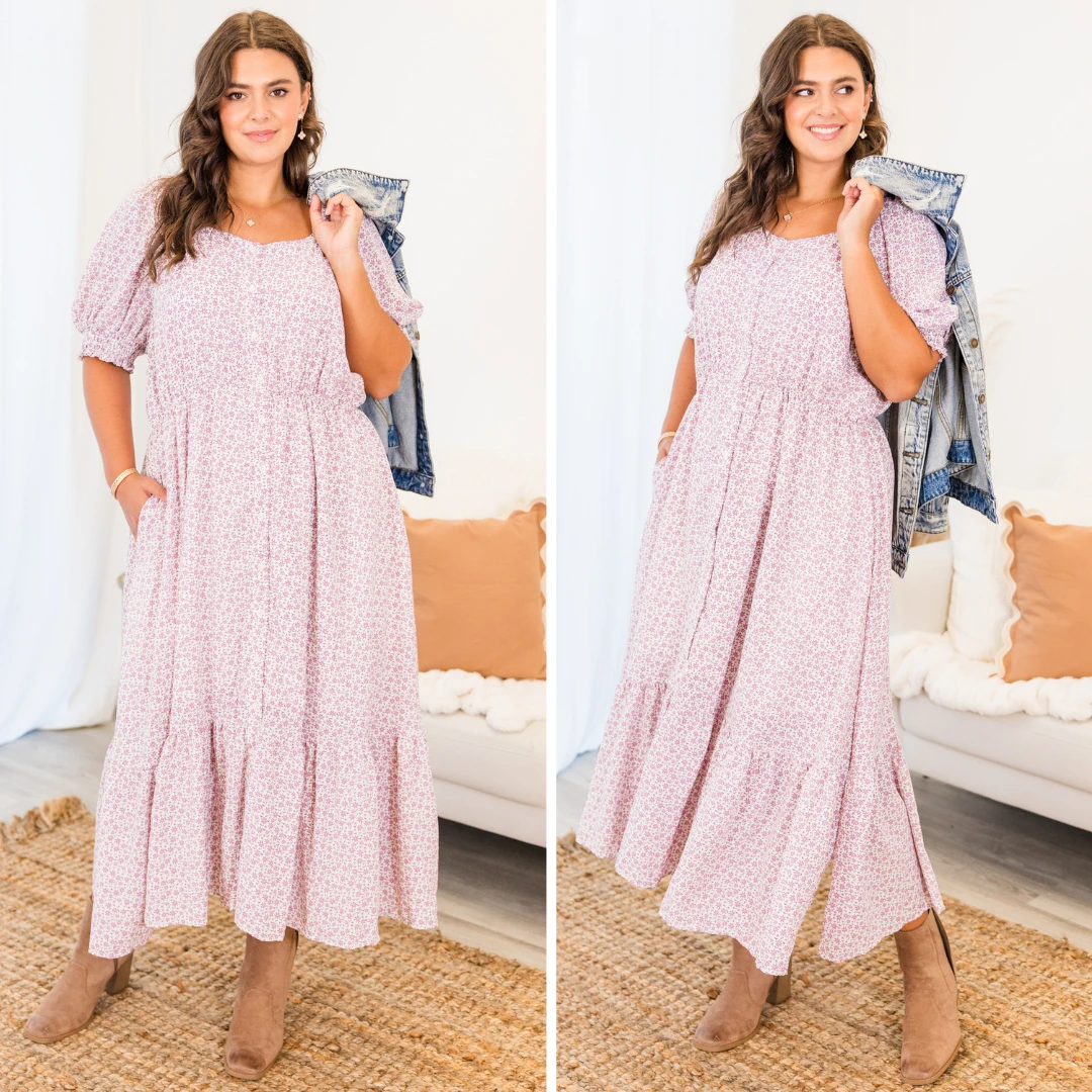 Unleash your inner flower power with this dress in lavender! Adorned with a delicate stemmed floral print, this dress features a charming curved square neckline and functional buttons down the front! Elastic and ruched hems on the short sleeves add a touch of playful detail, while an elastic waistband and side pockets provide comfort and convenience! Plus, with a flirty slit along the bottom front, you’ll feel oh-so-stylish and carefree!
