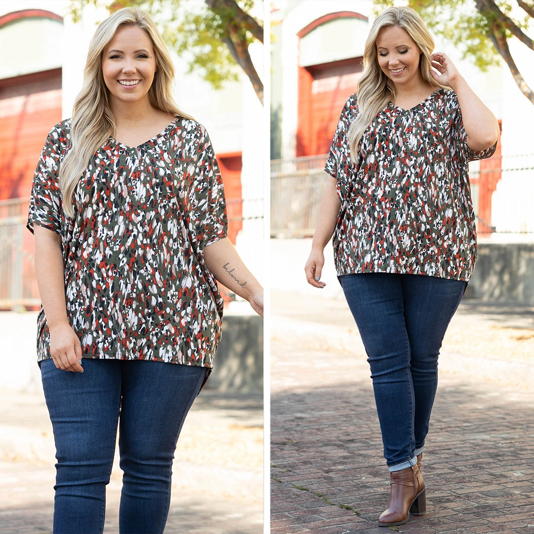 Add some color to your wardrobe with this chic top! The fun confetti print and stretchy fit are figure flattering and just what you need in this season! Style this with your favorite jeans and booties for a comfy, trendy look!