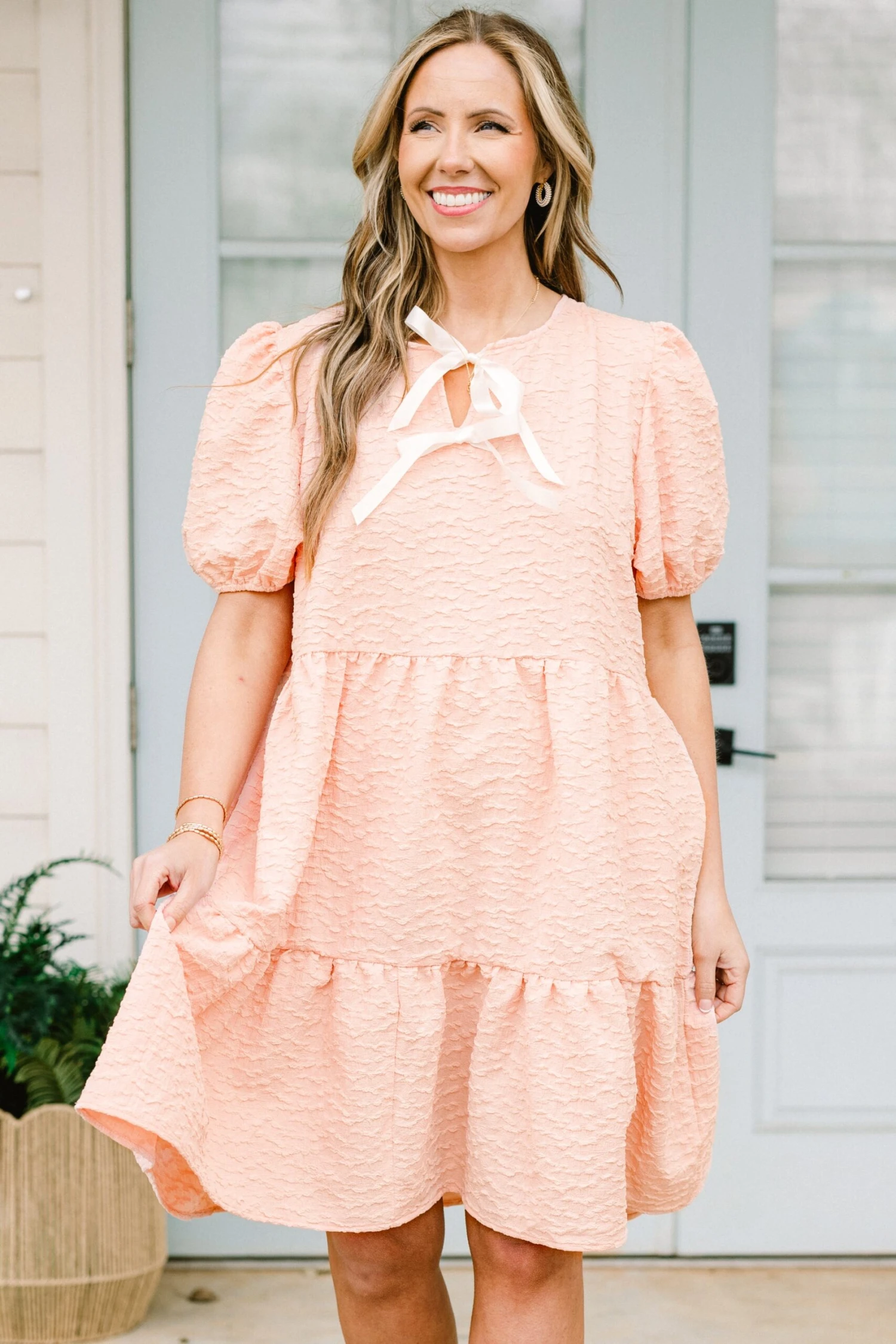 This Porcelain Bloom Dress in pink features elegant elastic puff sleeves, a textured fabric and charming bow details! Perfectly practical with functional pockets and a tiered skirt, this dress will elevate your wardrobe with style and versatility!