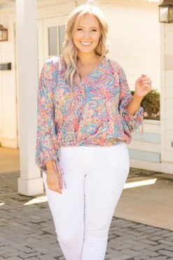 You will be so pretty in this paisley top! The jade color mix is so on trend right now! Plus we love those subtle bubble sleeves that tie on the end! Pair this cutie with a stunning pair of white jeans and heels for the perfect date night outfit!