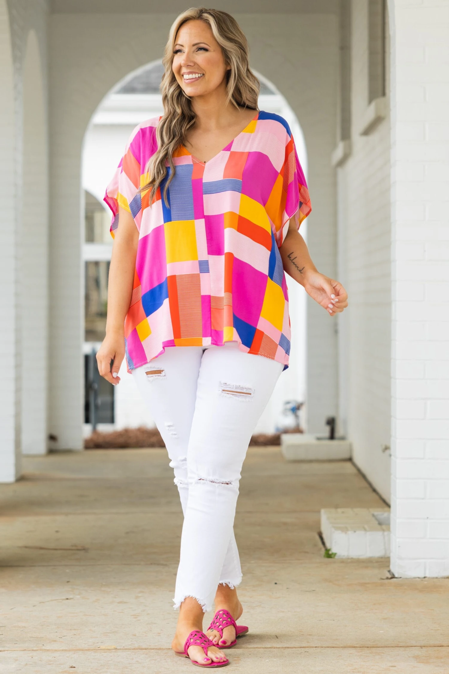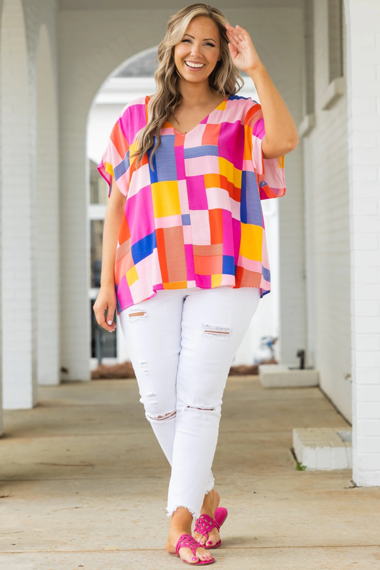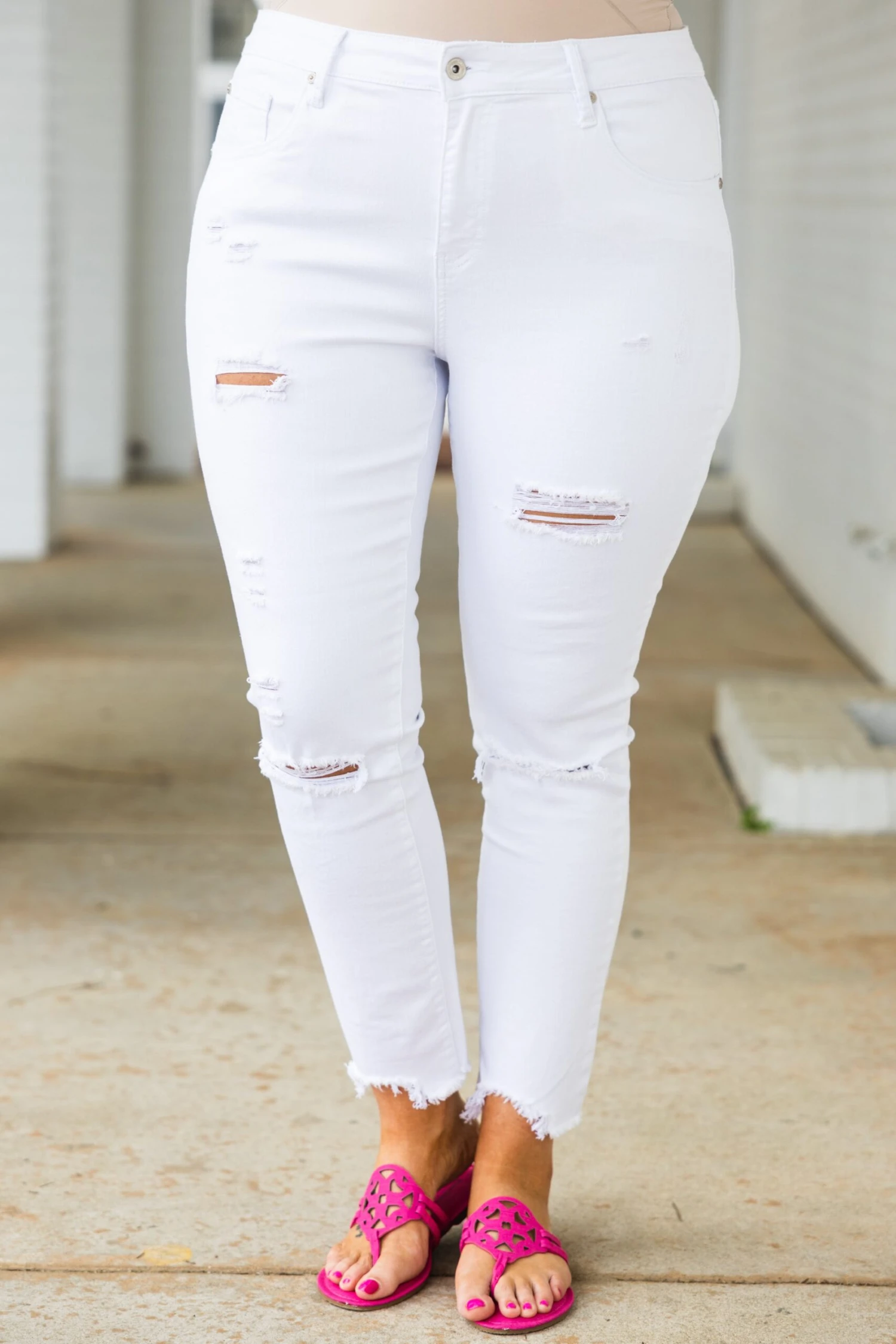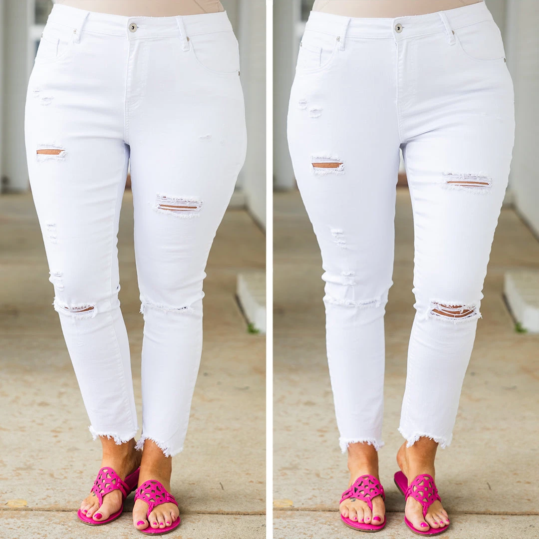 We are SO in love with these fab jeans! They have a classic white color with a trendy distressed design that is a season favorite! The stretchy, figure flattering fit is great for all day wear! Style these jeans with a cute top and sandals or wedges for an everyday chic look!