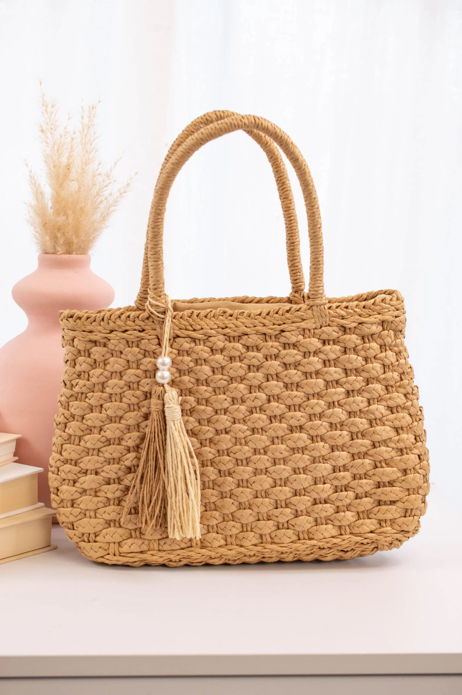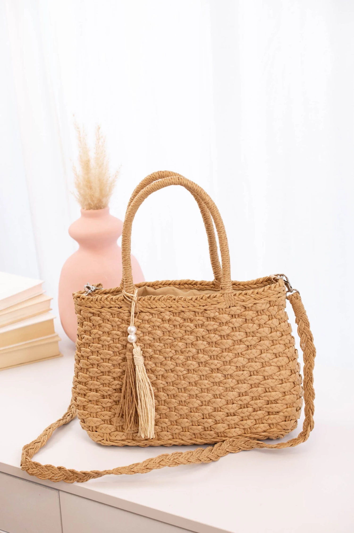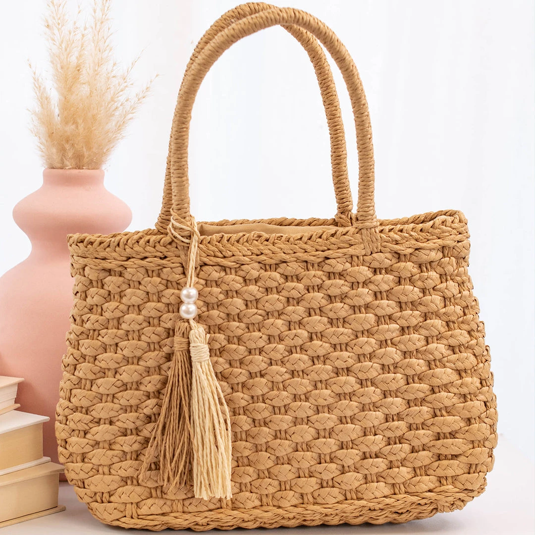 This purse has us dreaming of a tropical vacay! The braided look is so perfect for warm weather and the tassel with pearls is so beachy chic! This cutie has a shoulder strap included so you can wear it as a handbag or a over the shoulder purse! Style it with a flowy maxi and some beachy accessories for the perfect look!