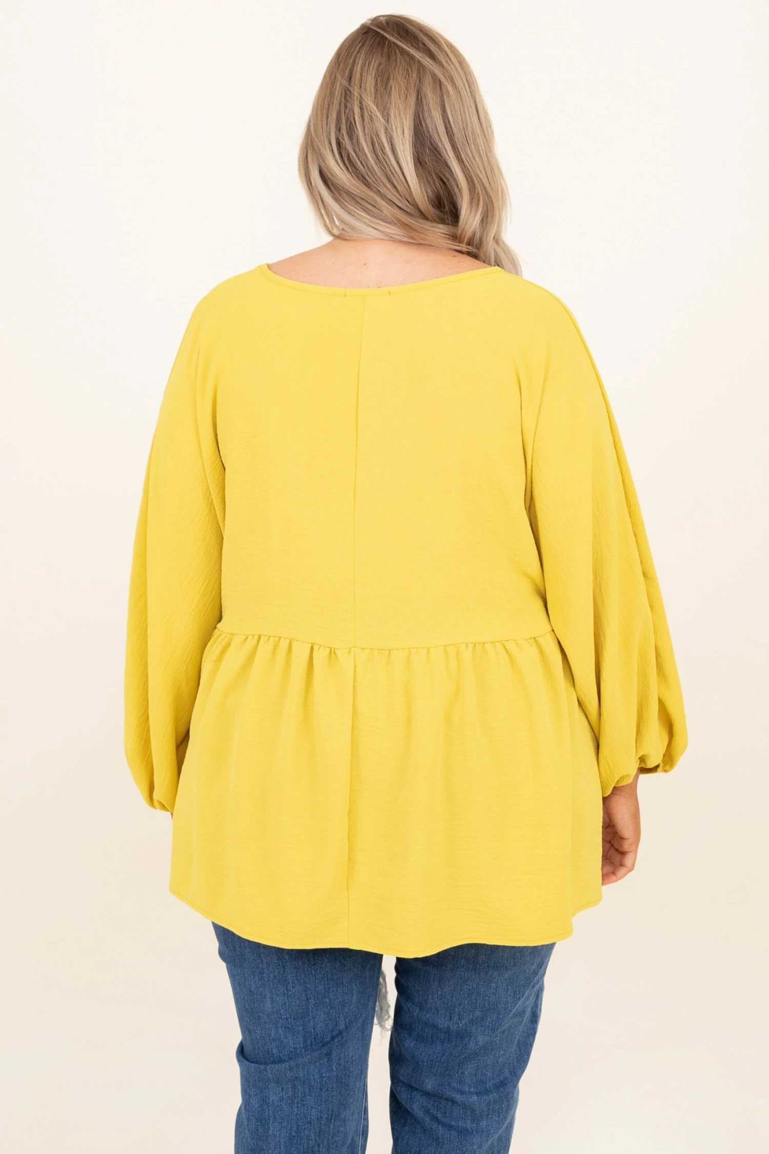 Be queen for a day in this regal top! The v-neck style is super flirty and the gold kiwi color is gorgeous! The loose babydoll style will look good on anyone and the bubble sleeves are so trendy! Style this with some white flares and wedges for an incredible look!