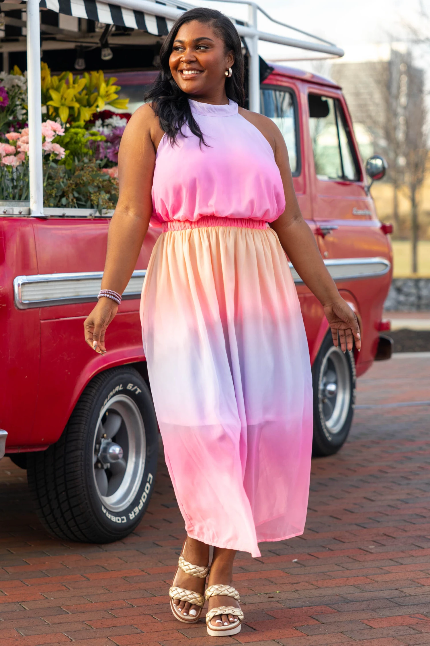 Let your beauty radiate in this beautiful dress! This dress has a bold color combo that is just in time for the season! The halter style and maxi length is perfect for any occasion! Pair this dress with some cute accessories and heels for a whimsical chic look!