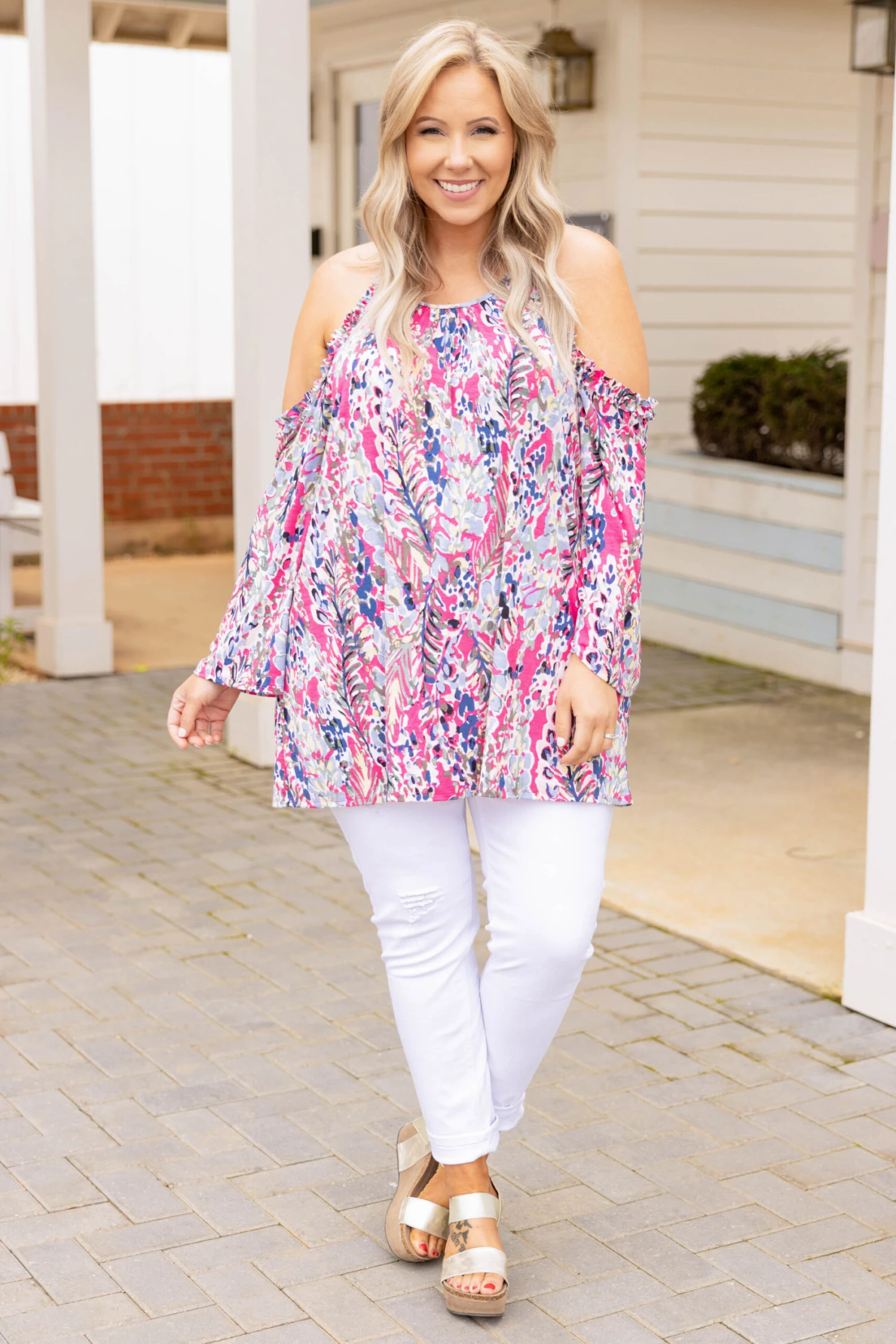 Follow the rainbow to find this stunning blouse! This top features a gorgeous hot pink print color combo we just adore! It’s appropriate for every occasion, whether going to work or dinner with the girls, and is comfortable enough for all-day wear! We love the off shoulder design too. Simply pair this beauty with your favorite skinny jeans and wedges for your next get together!