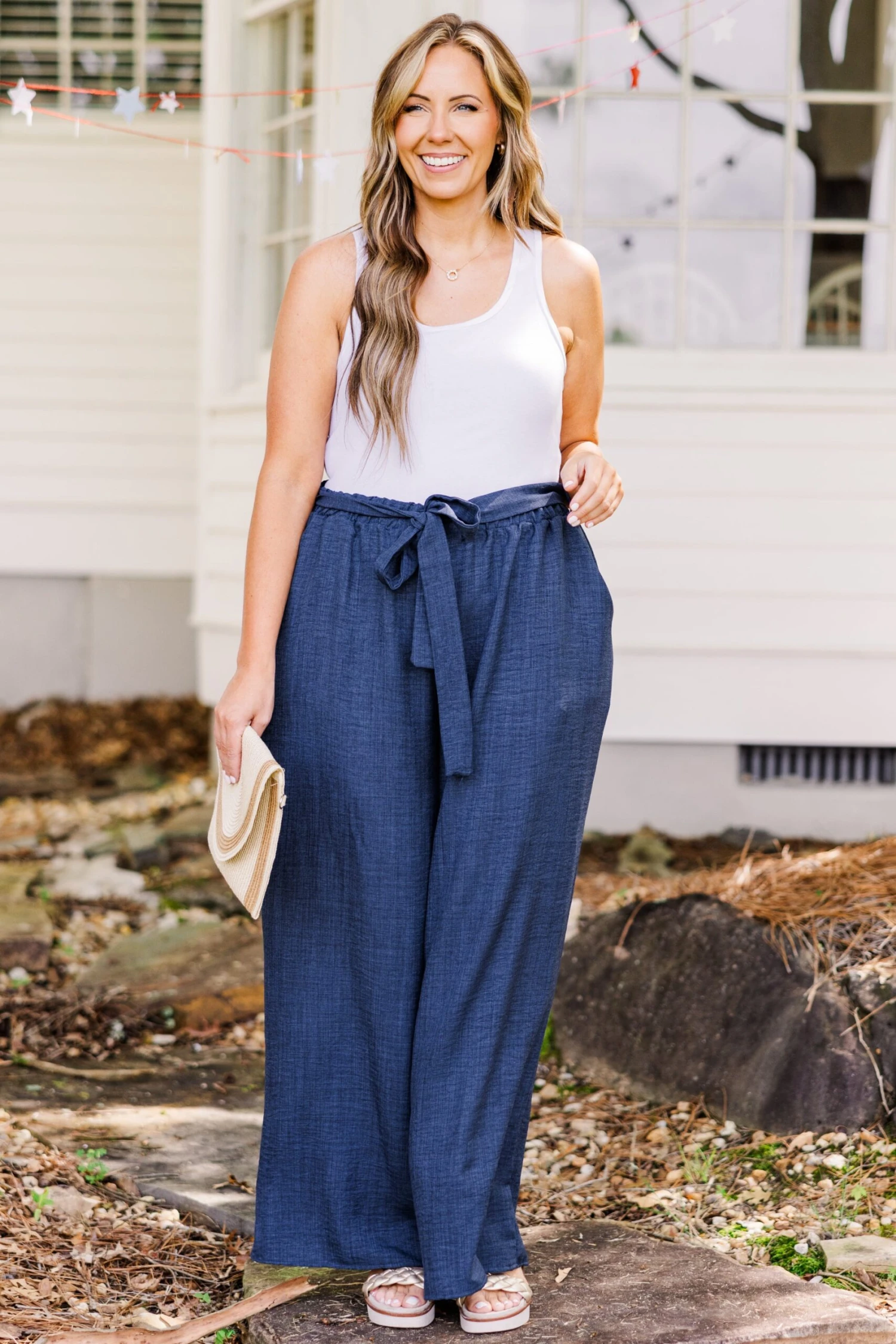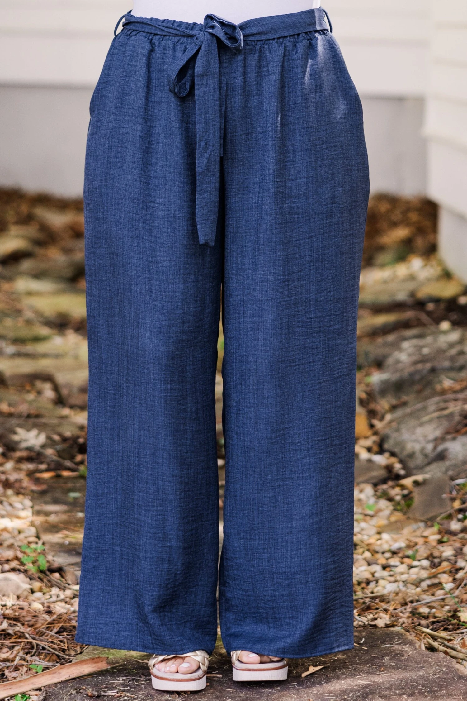 Upgrade your summer wardrobe with our Sandy Shoreline pants! These navy pants feature an elastic waistband and removable sash, effortlessly combining comfort and style! Mix and match with a white bodysuit or our Easy Breezy Top, Navy Blue for endless outfit options! Perfect for a day at the beach or a night out!