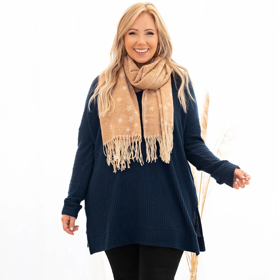 Save some style for everyone else! This scarf is super trendy and features the cutest star print and tassel ends. Style this with all your solid tops this season for a fun outfit!
