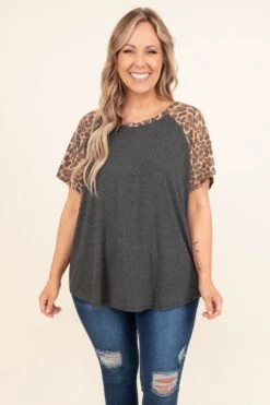 This is sure to be your newest staple piece in your closet! The neutral charcoal color can be paired with so many things and the super soft material makes this perfect for all day wear! The leopard pattern on the sleeves gives this top a little something that we love! Pair this babe with skinnies and a cute cardi for a super stylish look!