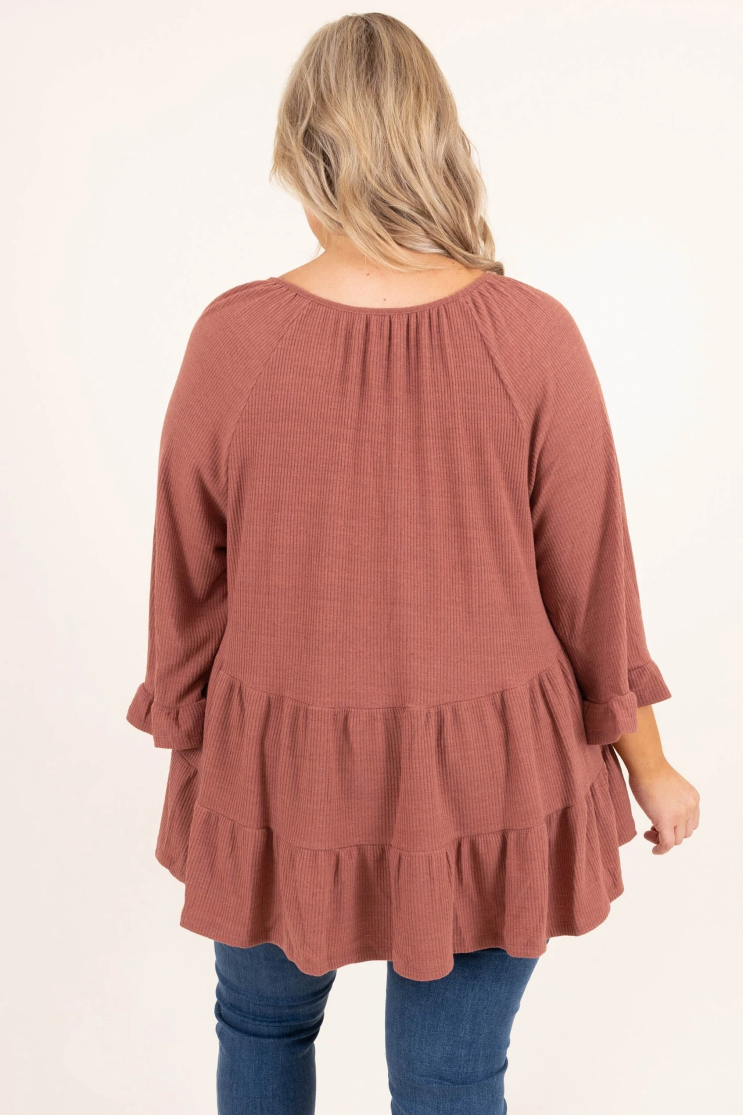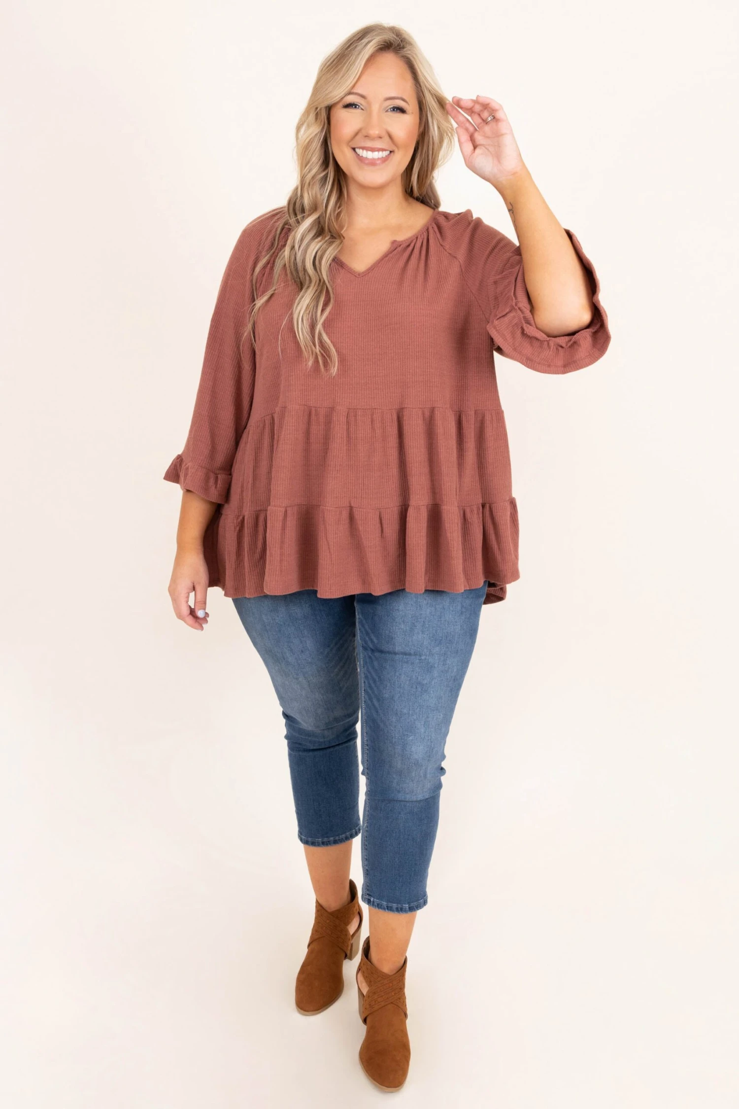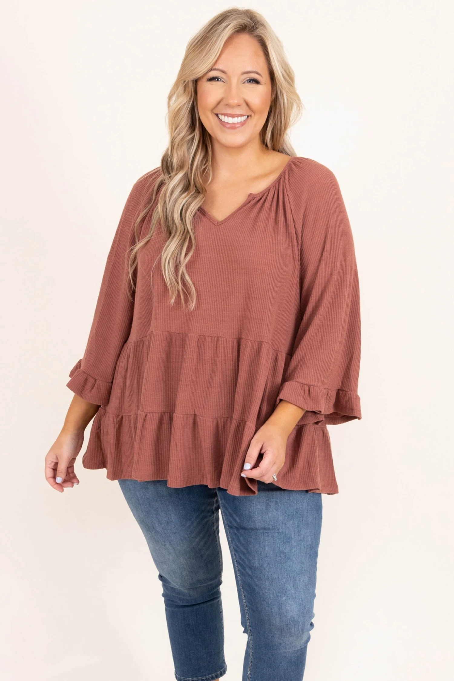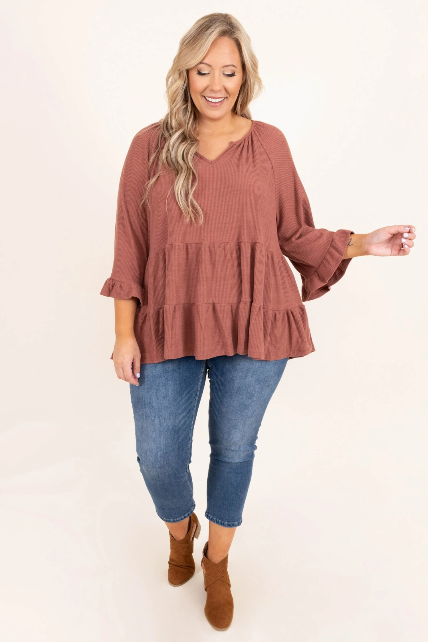 We would love to see you in this beautiful top! This top has a flowy, figure flattering style and soft rust color that are perfect for the season! Style this top with some skinnies and booties for a classic, trendy look!Â