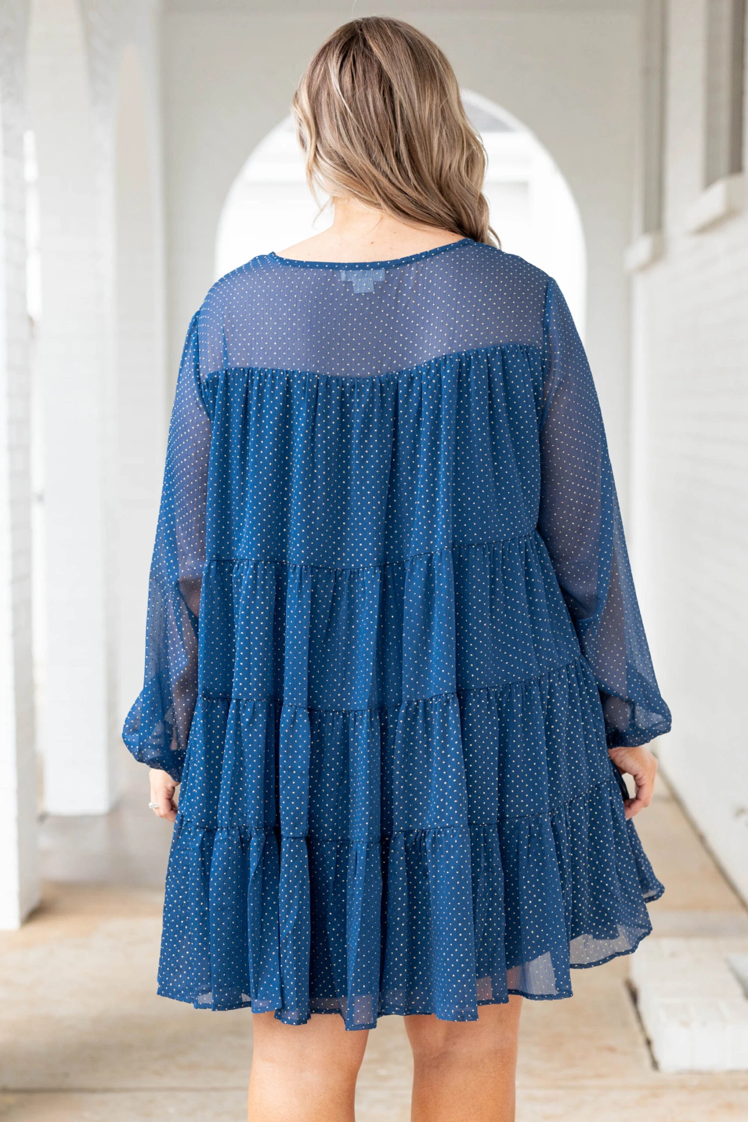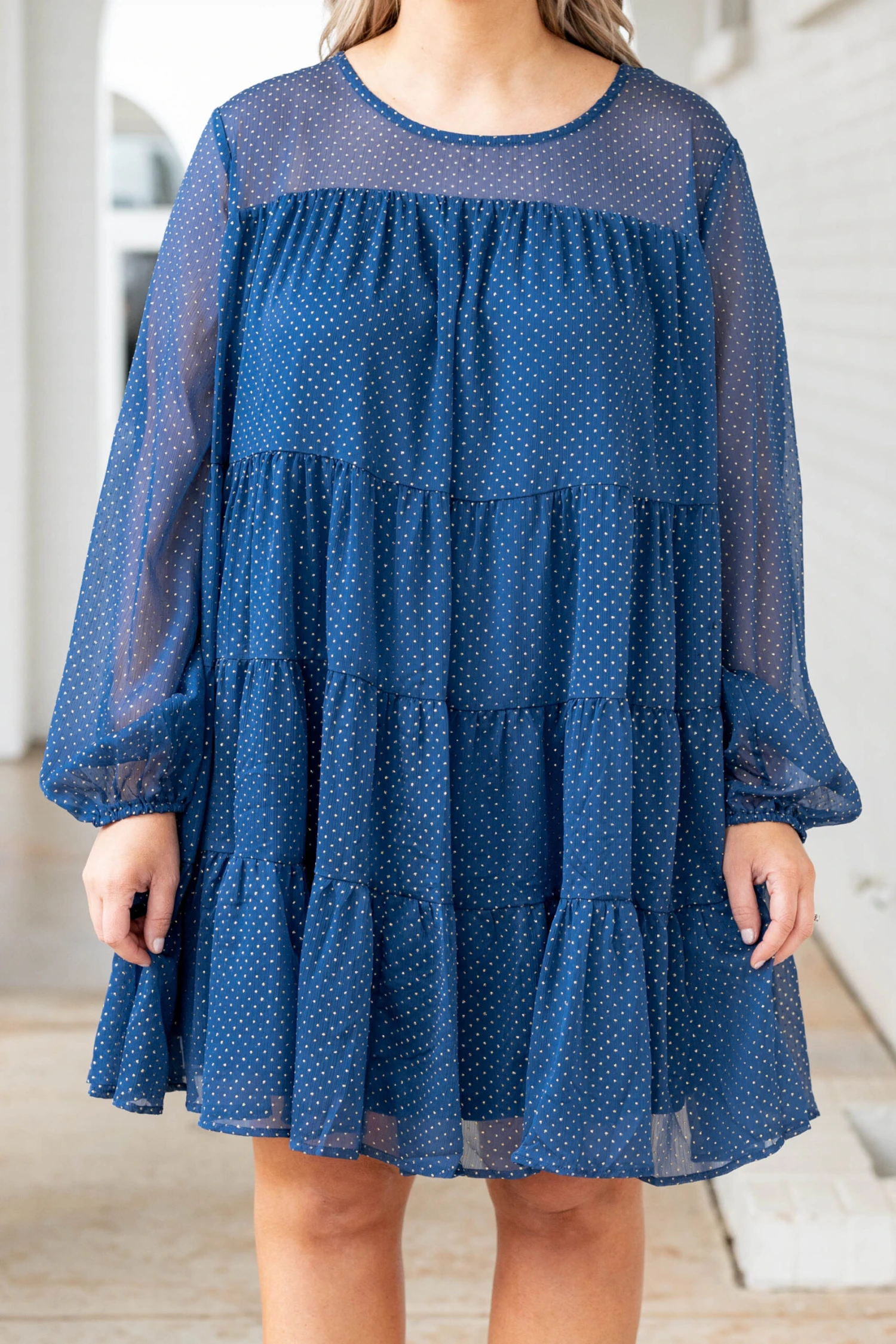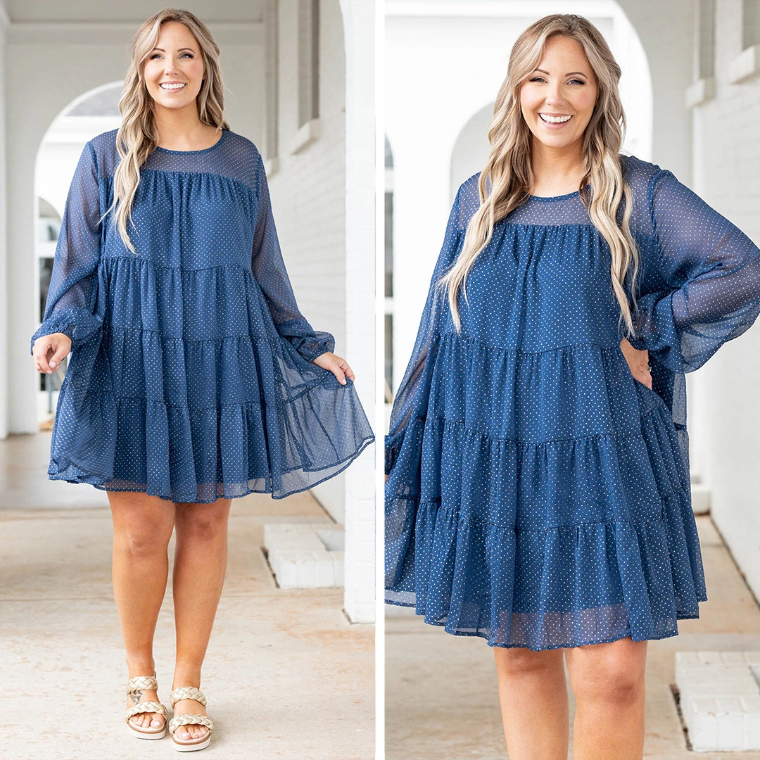 We seem to have fallen in love with this beauty! This dress has a mesmerizing navy color with a trendy layered look that is just in time for the season! The sheer sleeves and flowy fit are perfect for any occasion! Throw this cutie on with some cute accessories and heels for an unforgettable look!