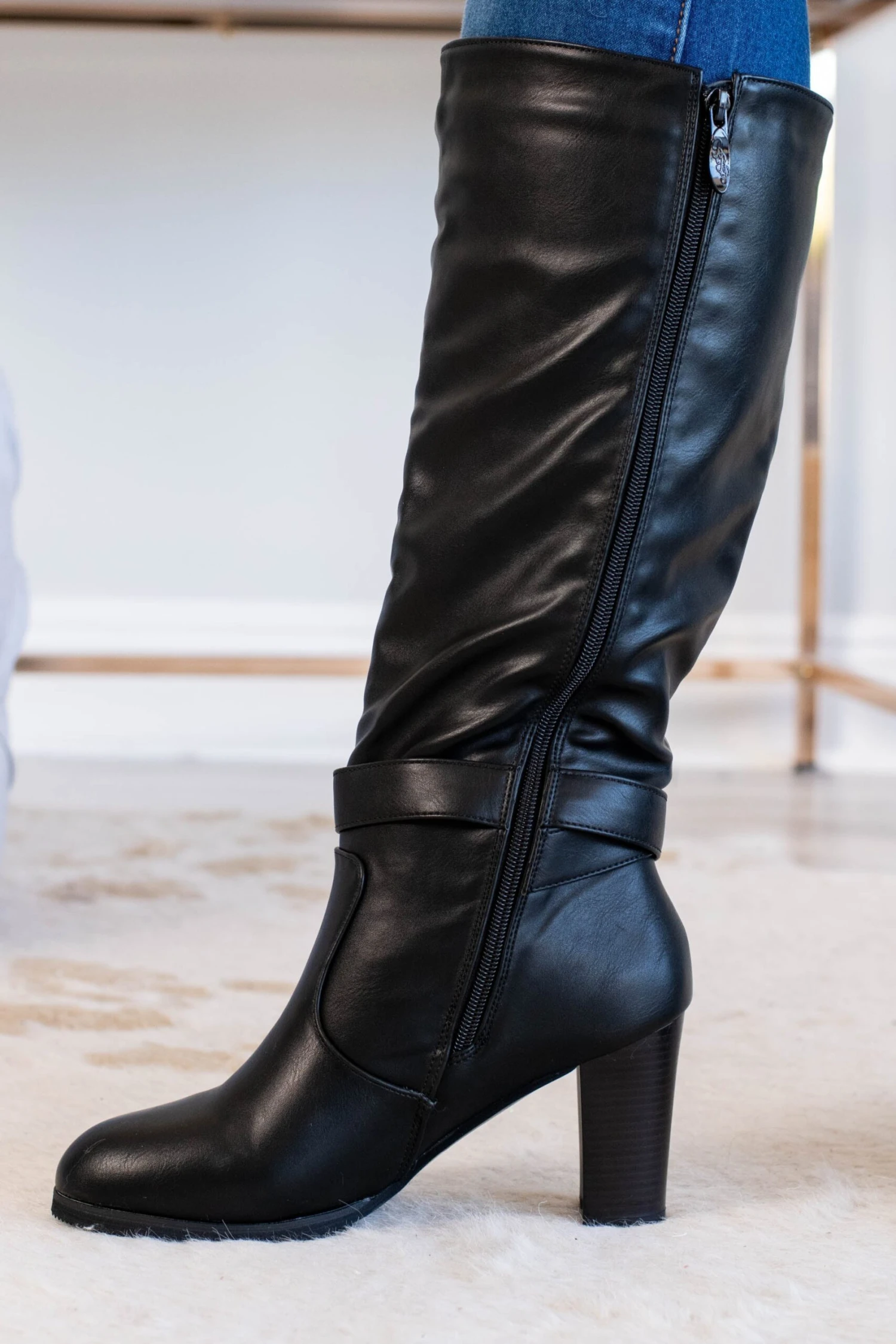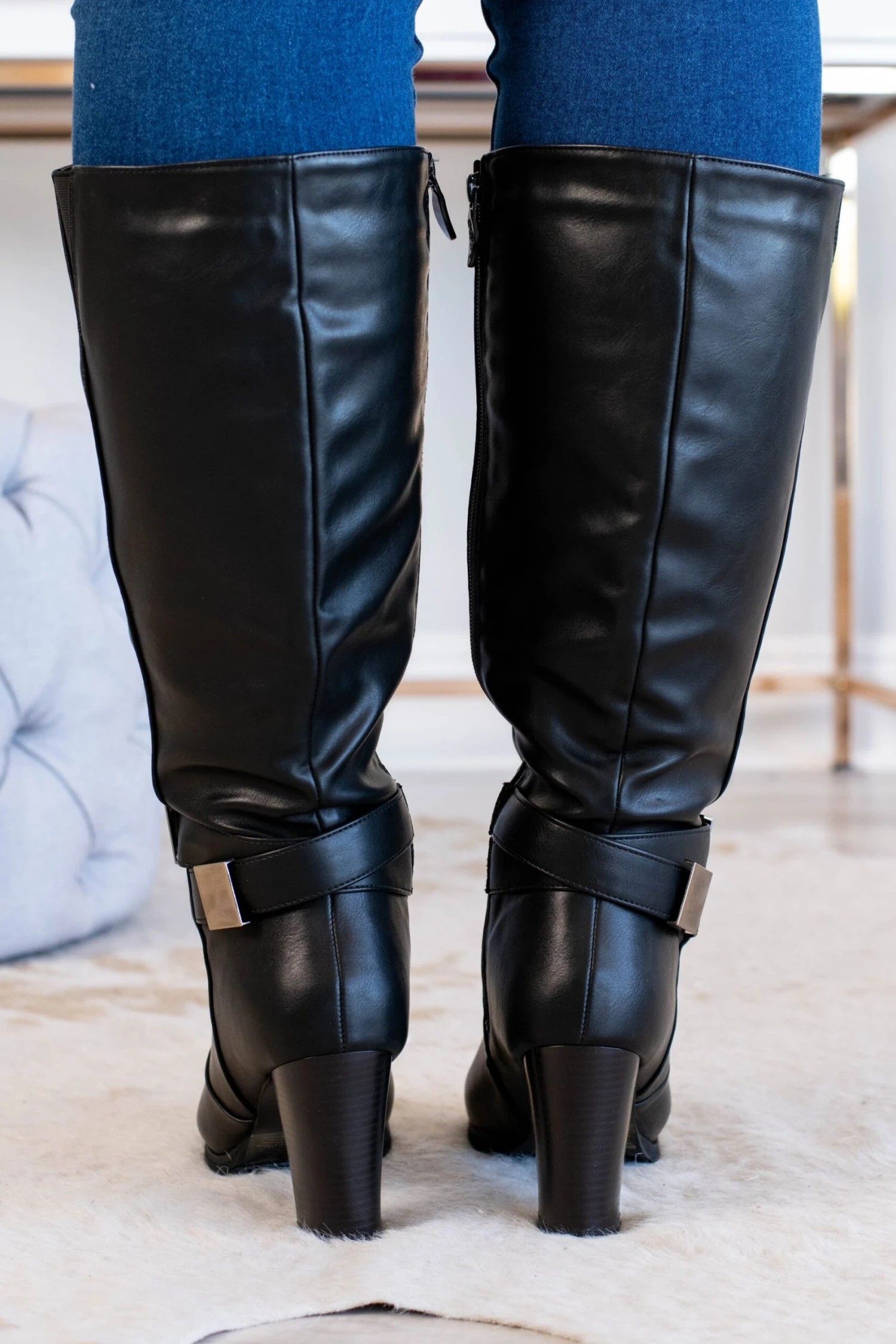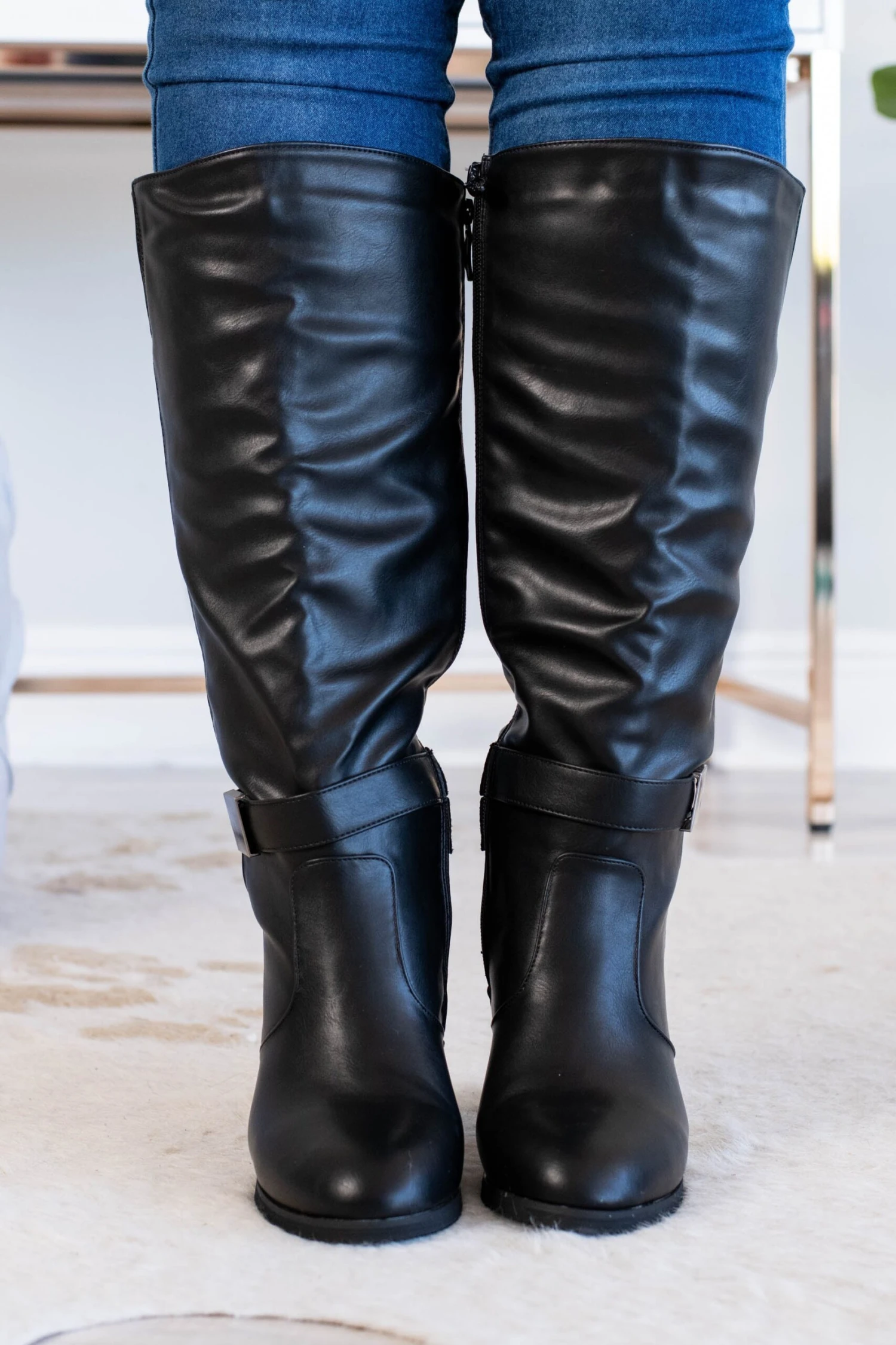 You’ll never want to take these boots off! These boots have a sleek black color you can pair with everything in your wardrobe and a trendy heel you can dress up any outfit with! They have a tall design, a wide calf fit featuring an expandable gusset, and the cutest buckle detail! Simply, style these boots with a flowy dress for an effortlessly chic look this season!