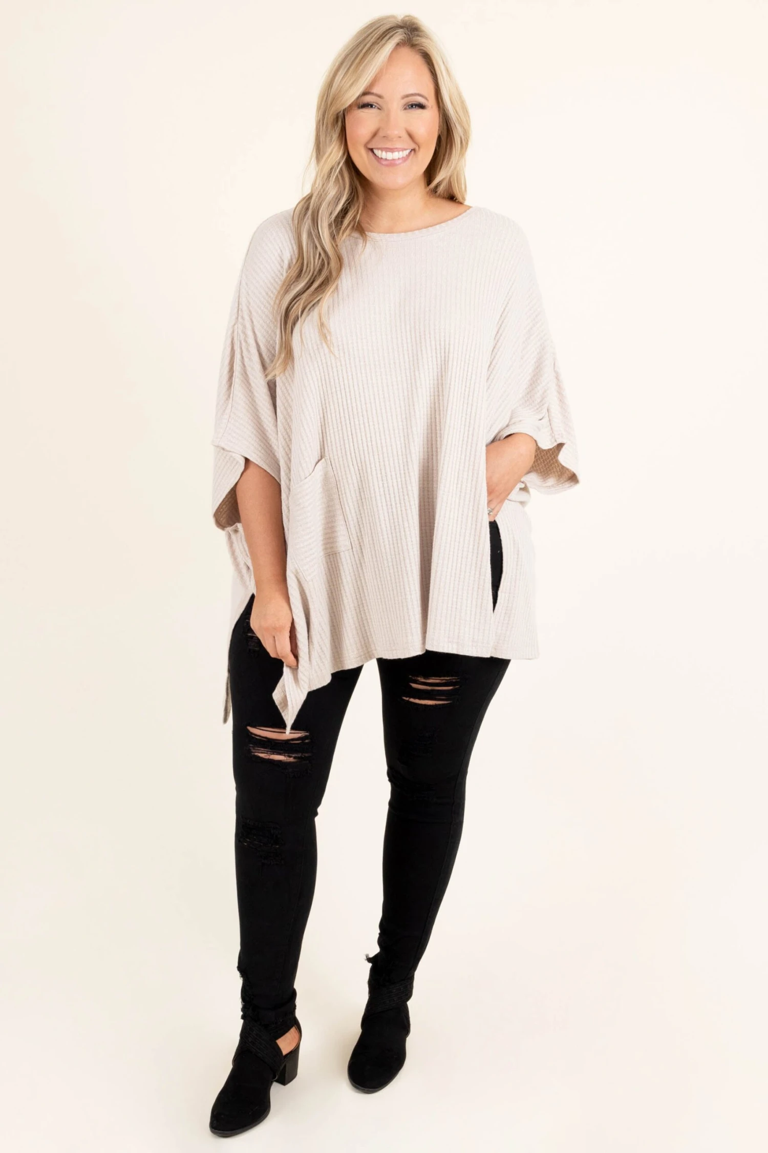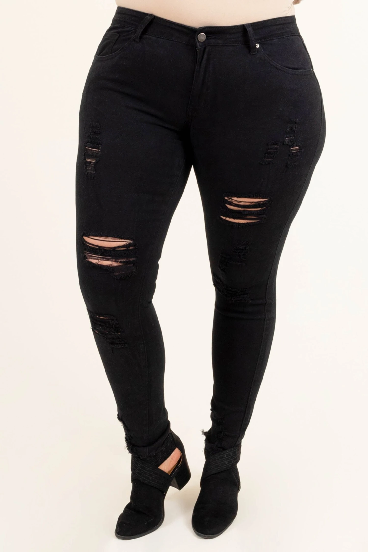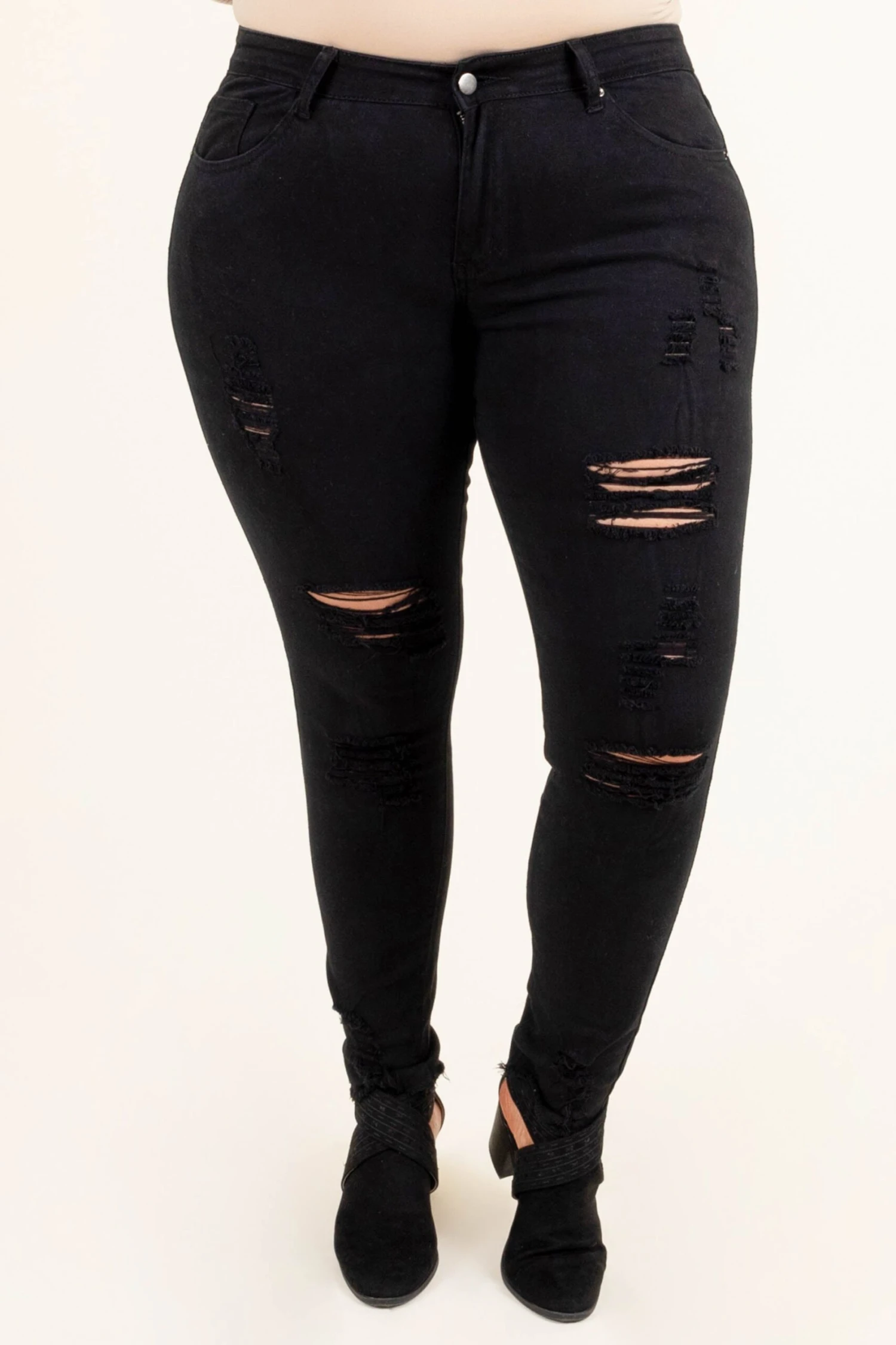 Be ready for anything in these fabulous jeggings! The solid black color and distressed pattern are so chic and easy to pair with all your faves! Whether you’re going on a date or out with friends these are the perfect jeggings for you! Pair these jeggings with a flowy top and booties for a classic, trendy look!