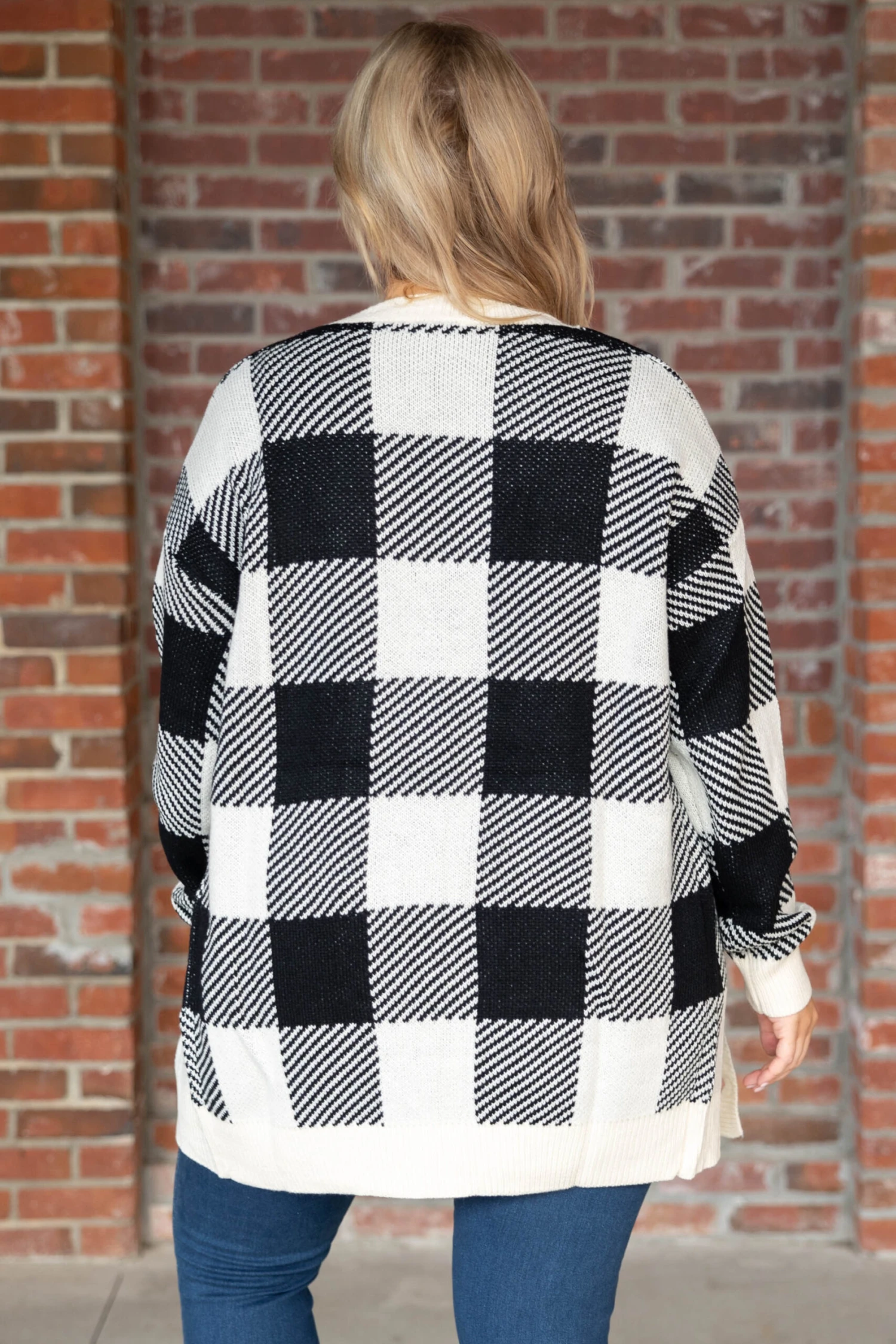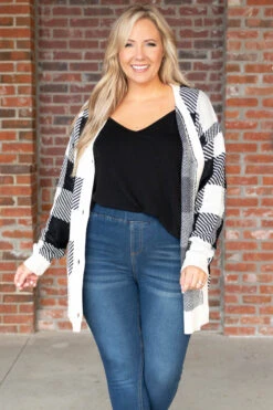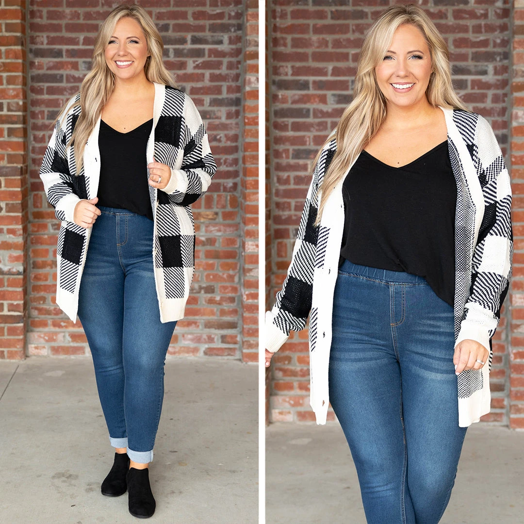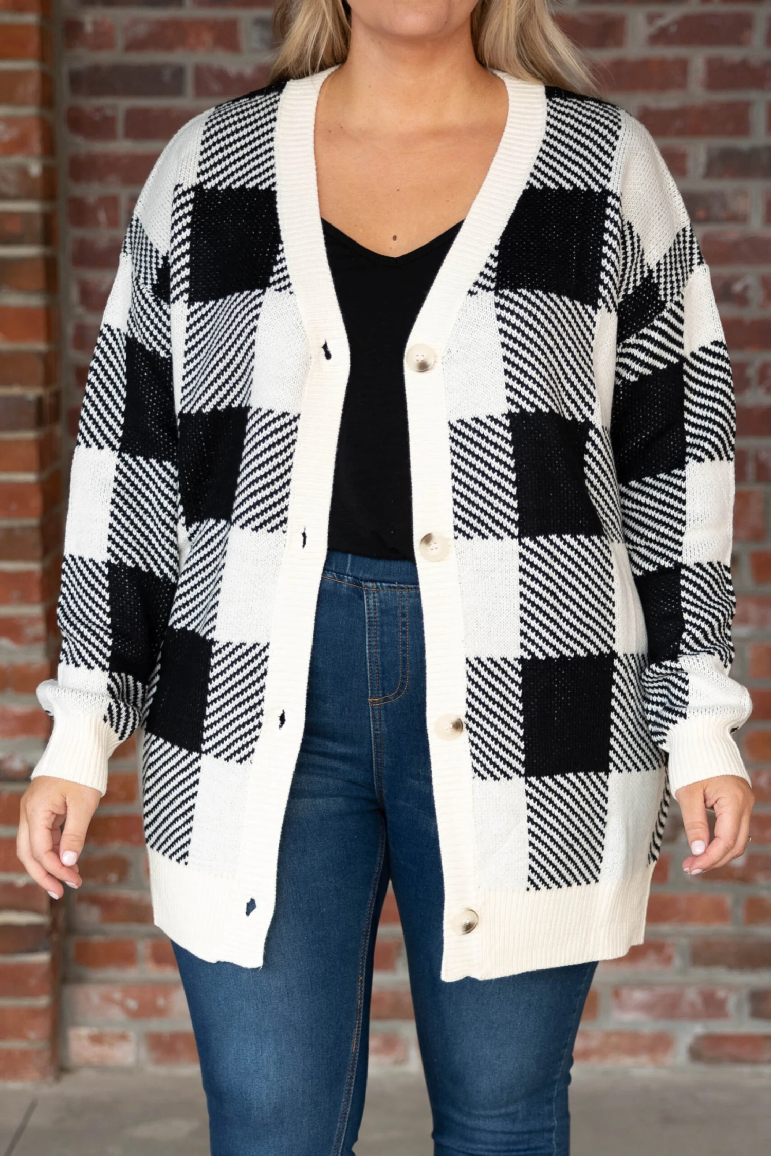 Stay cute and classy in this gorgeous cardigan! The neutral plaid pattern and figure flattering fit are perfect for pairing with all your favorite outfits! Style this cardigan with a cute top and accessories for a casual, comfy look!Â