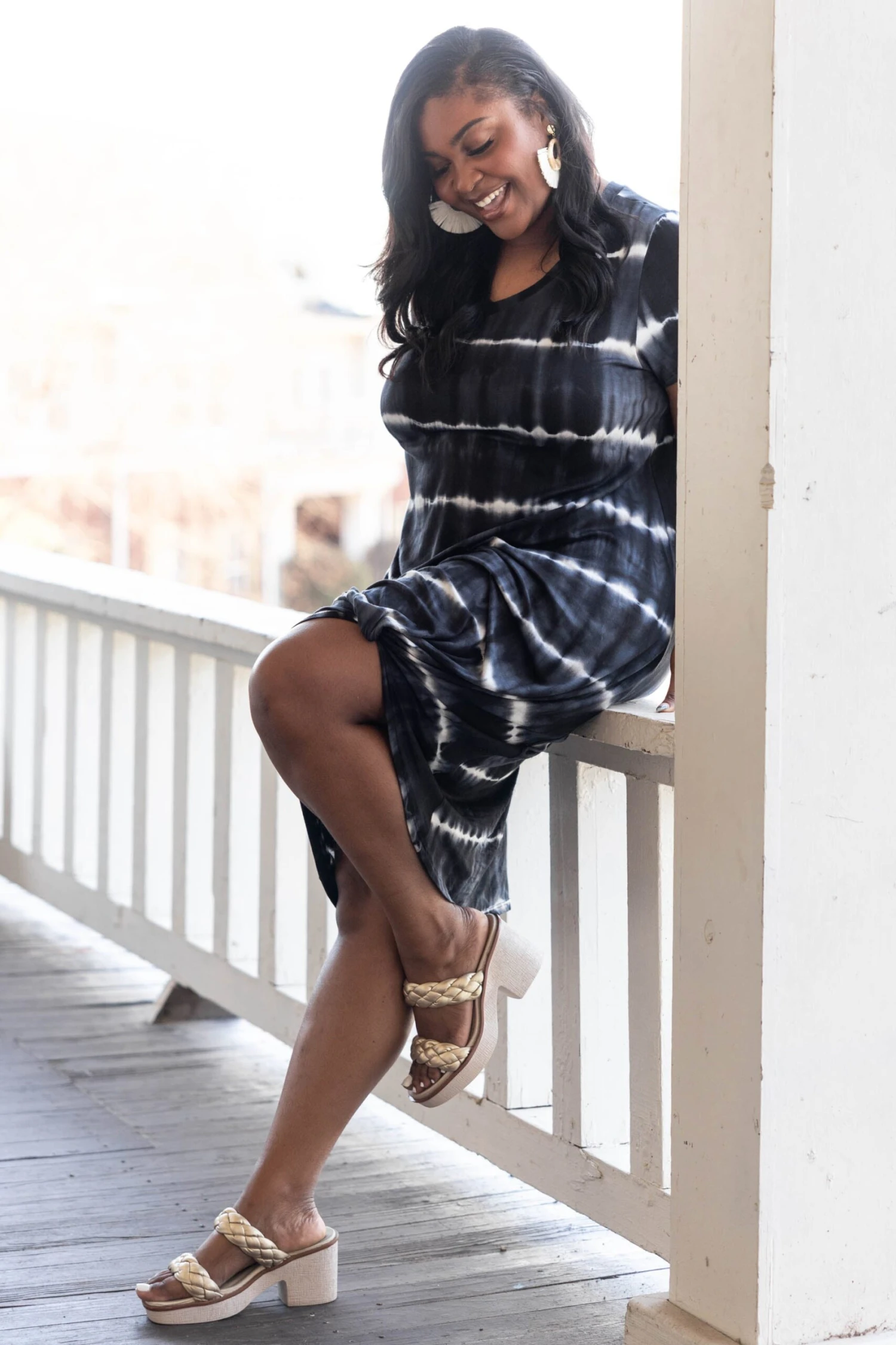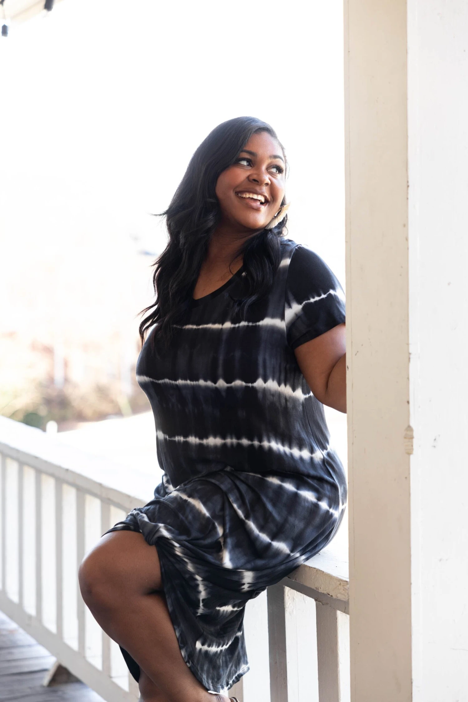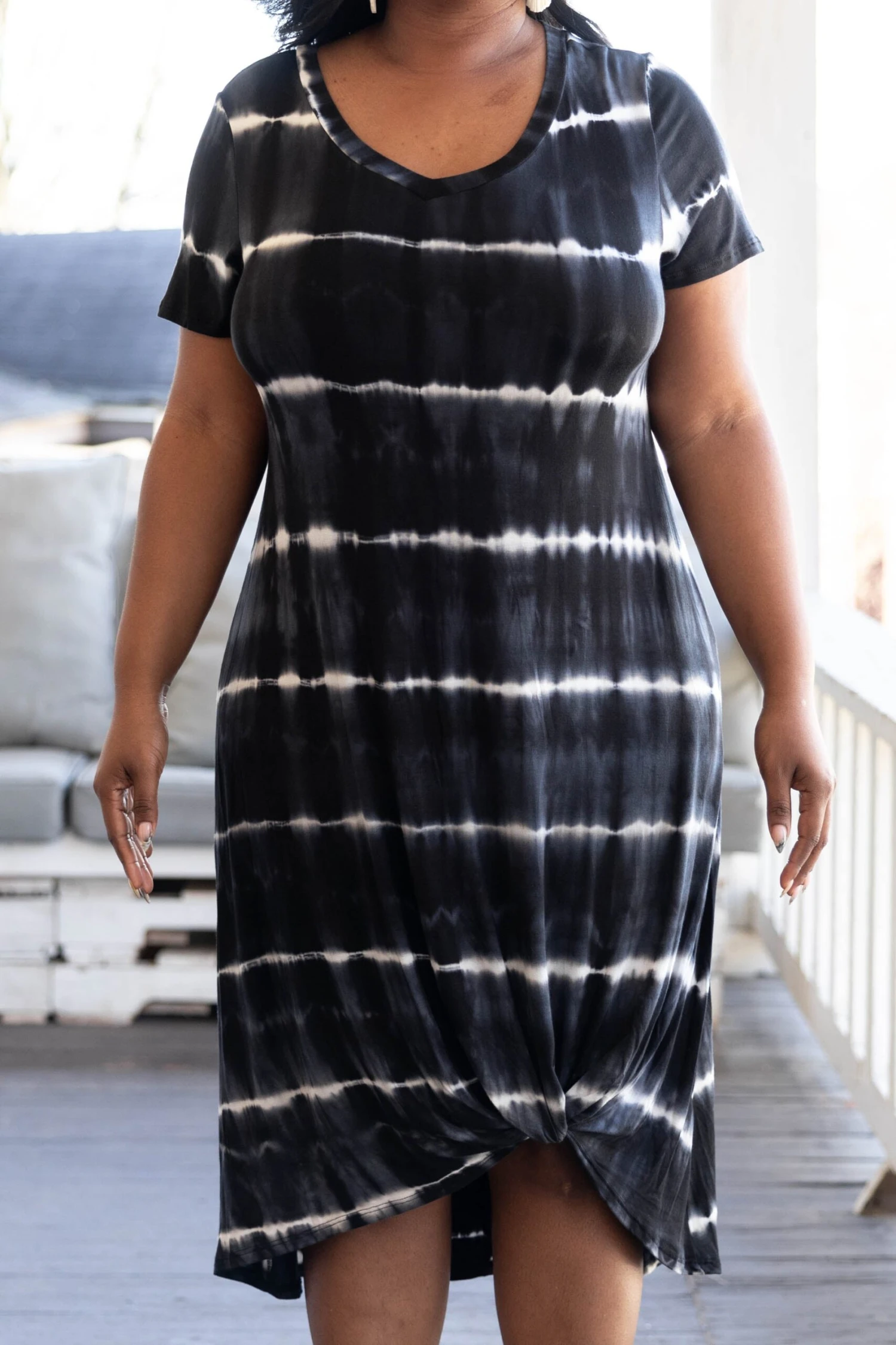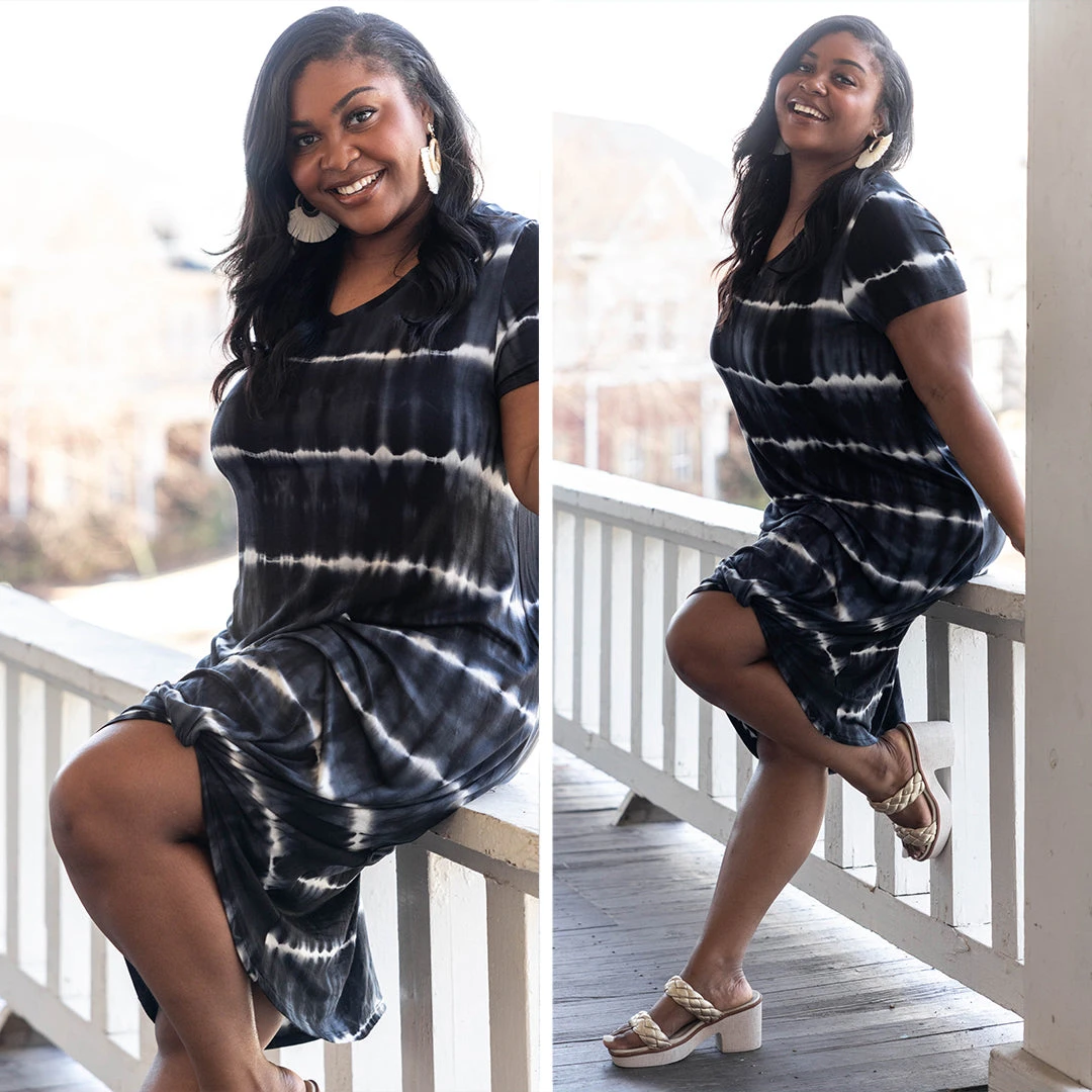 We are in love with this gorgeous dress! The black tie-dye design and knotted hemline is so sweet! The stretchy, figure flattering is so comfy and easy to pair with heels or sandals for an everyday chic look!