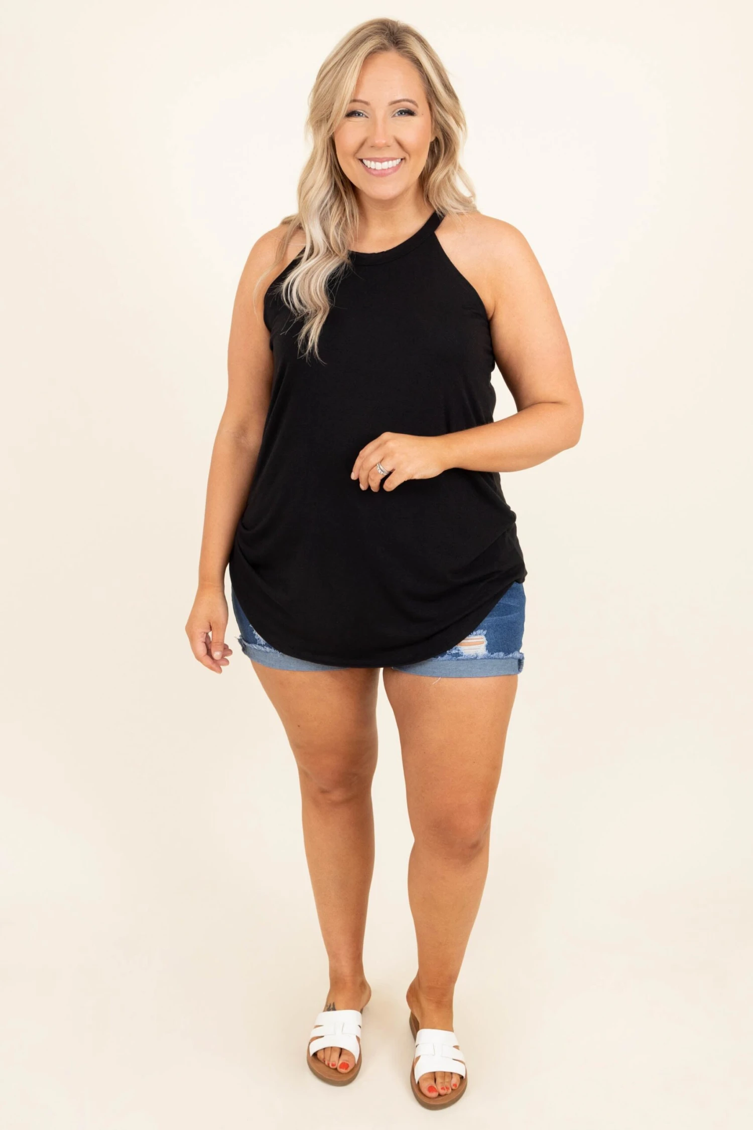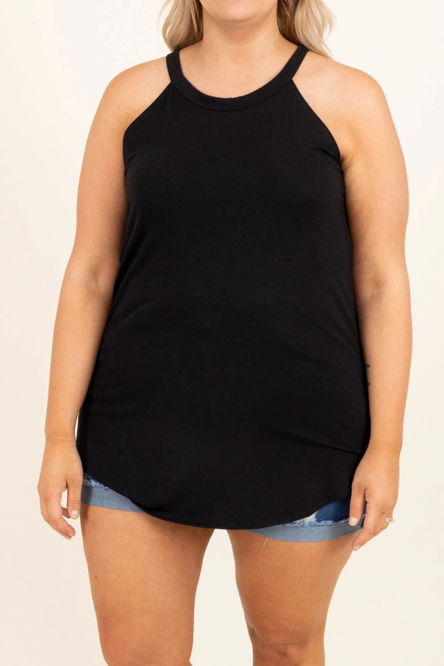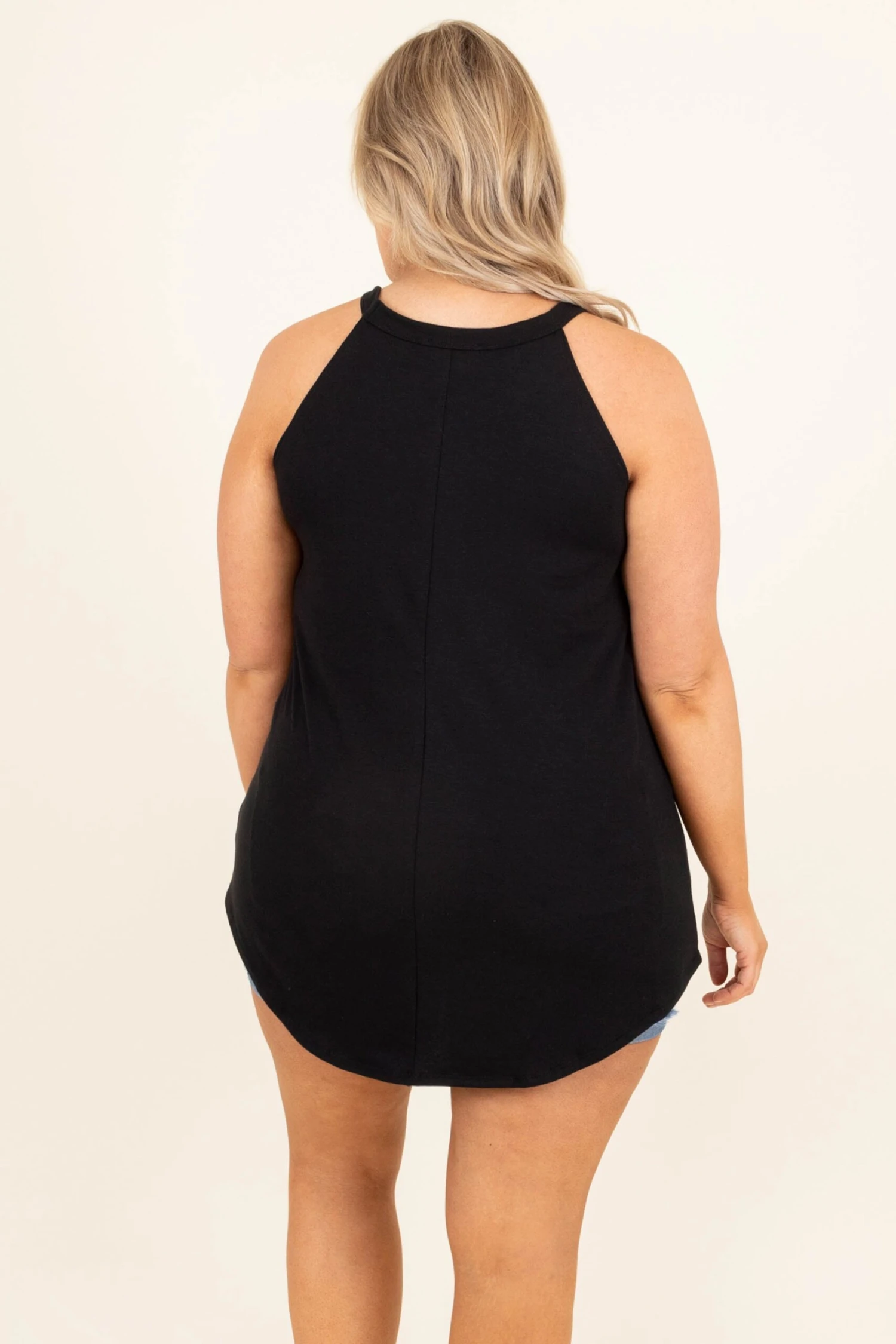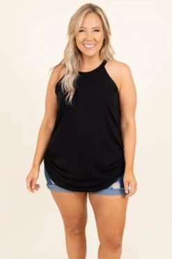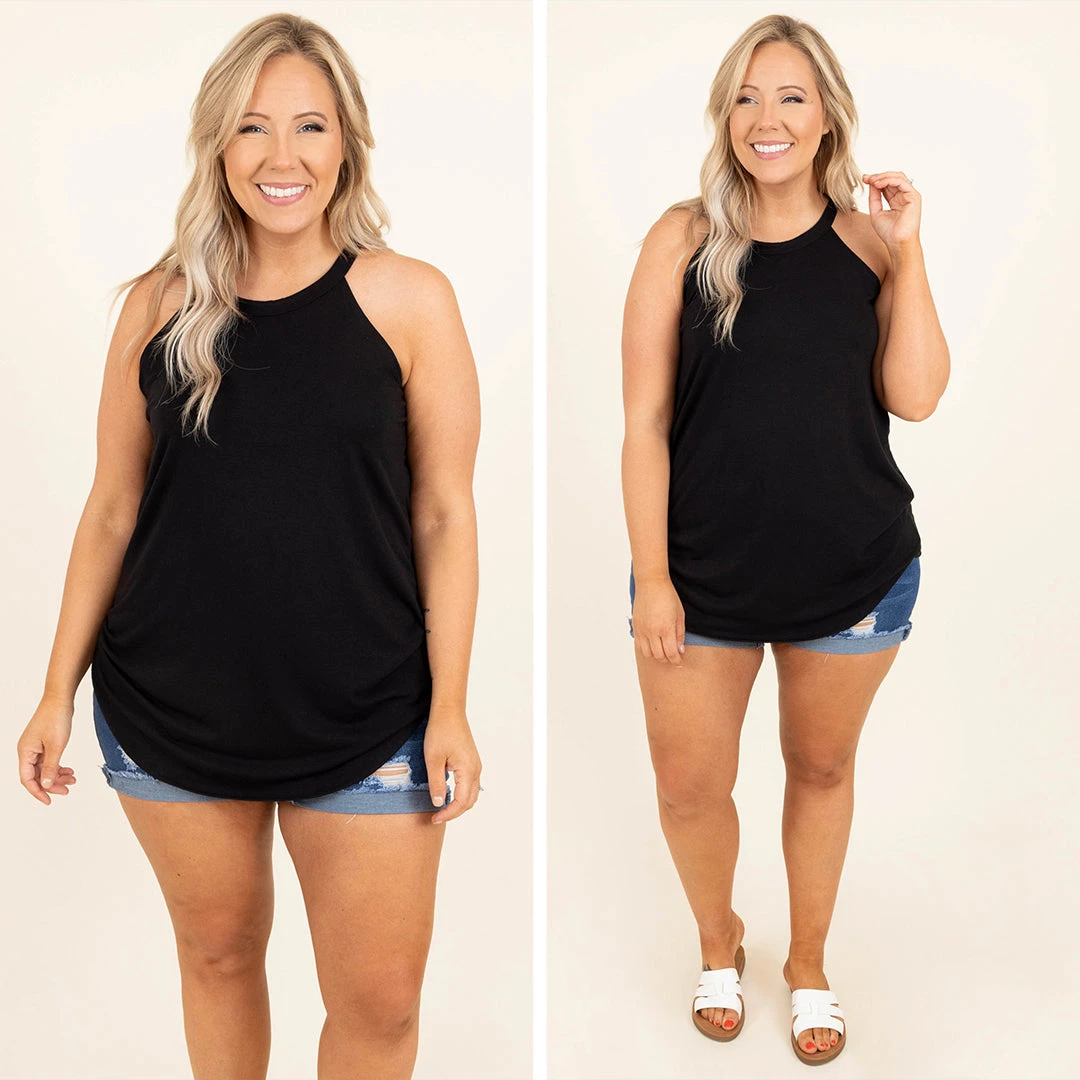 This tank is simply elegant! This piece is the perfect addition to any wardrobe, as the black color can be easily matched and the halter neckline is just so fun! Be sure to pair this top with your favorite denim and sandals for the perfect look!Â