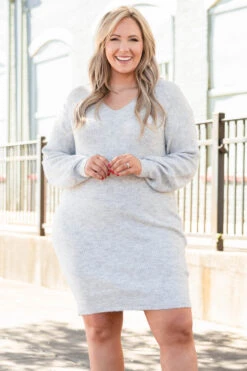 We are simply overjoyed about how gorgeous this dress is! This dress has a soft gray color with with a knitted design that is perfect for a date night or a casual holiday party! The flirty, figure flattering fit is super sweet! Style this dress with boots and cute accessories for an effortlessly chic look!
