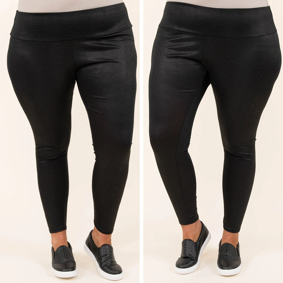 Day or night this leggings are perfect for the occasion! These trendy black leggings have a chic solid color you can dress up or down with a trendy snakeskin print that you can wear with everything! They’re comfortable and figure-flattering. Style these leggings with a tee and slides for an easy everyday outfit!