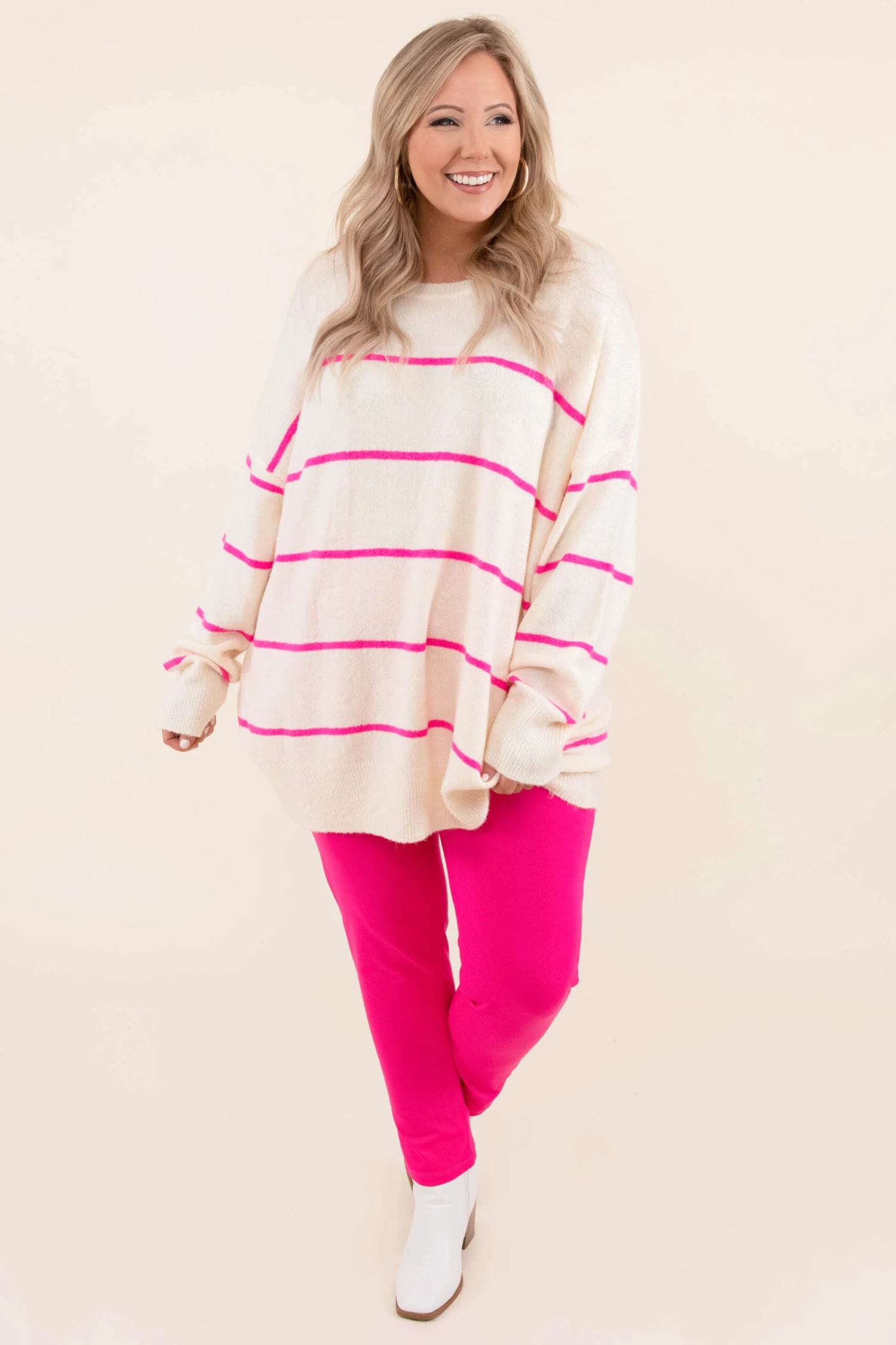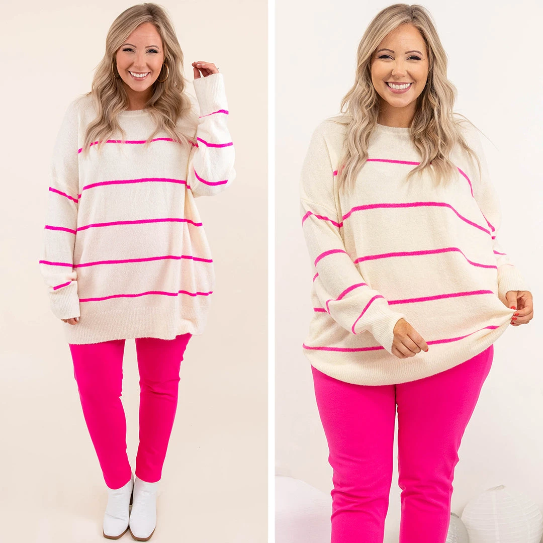 We wanna snuggle up and have a fun night with friends in this sweater! It has a cute stripe pattern, relaxed fit and the softest fabric! It’s great for keeping warm on cold days and nights! Pair this white sweater with fun hot pink leggings and slides for an easy, stylish outfit!