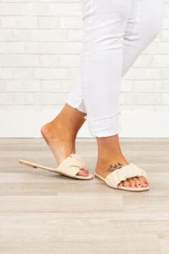 Slide these cuties on smooth like butter! The neutral beige color is so easy to pair with all of your favorite outfits for the season! We love the ruched look and comfy fit! Style these slides with a cute dress or sassy top and skinnies for a casual chic look!