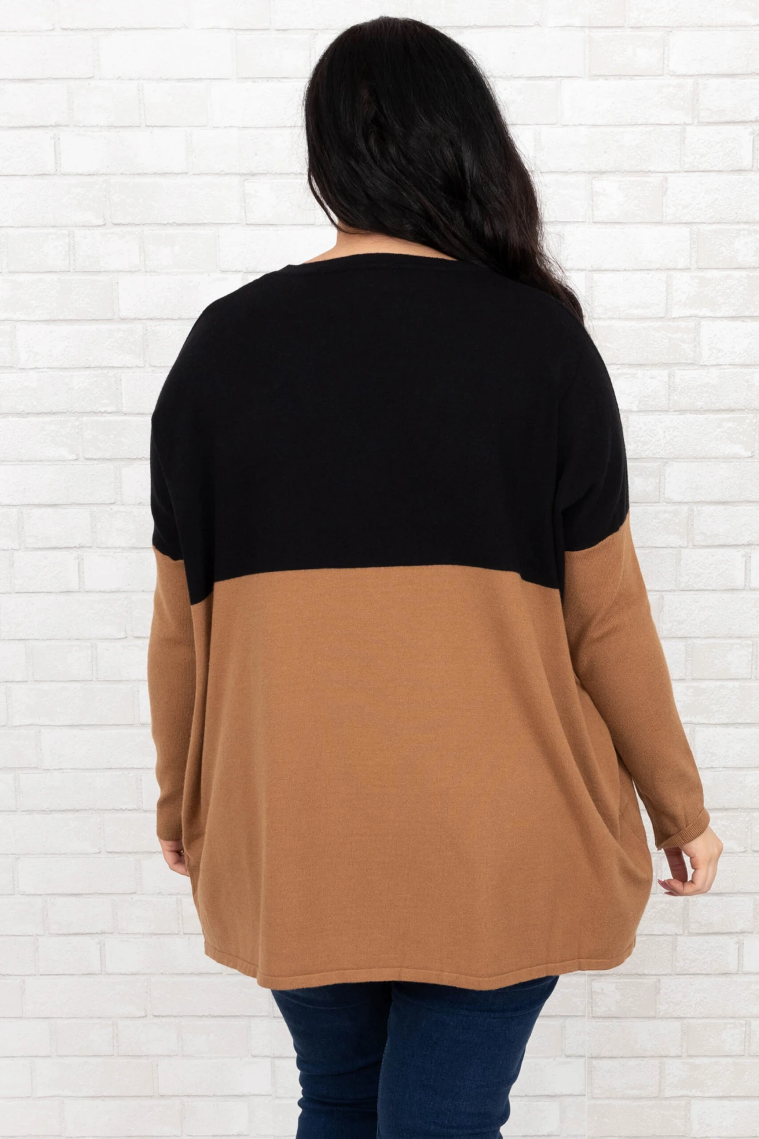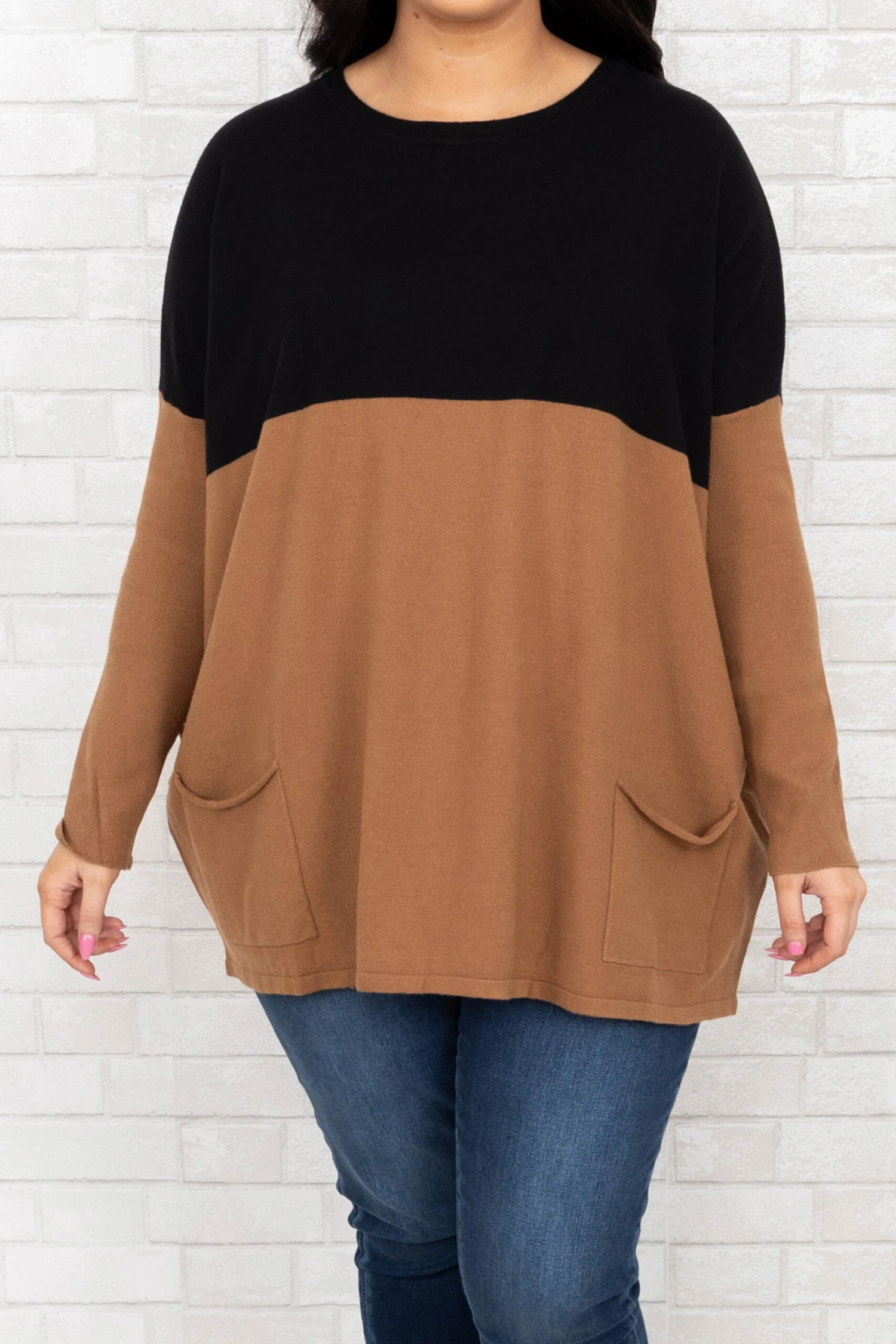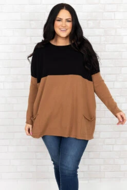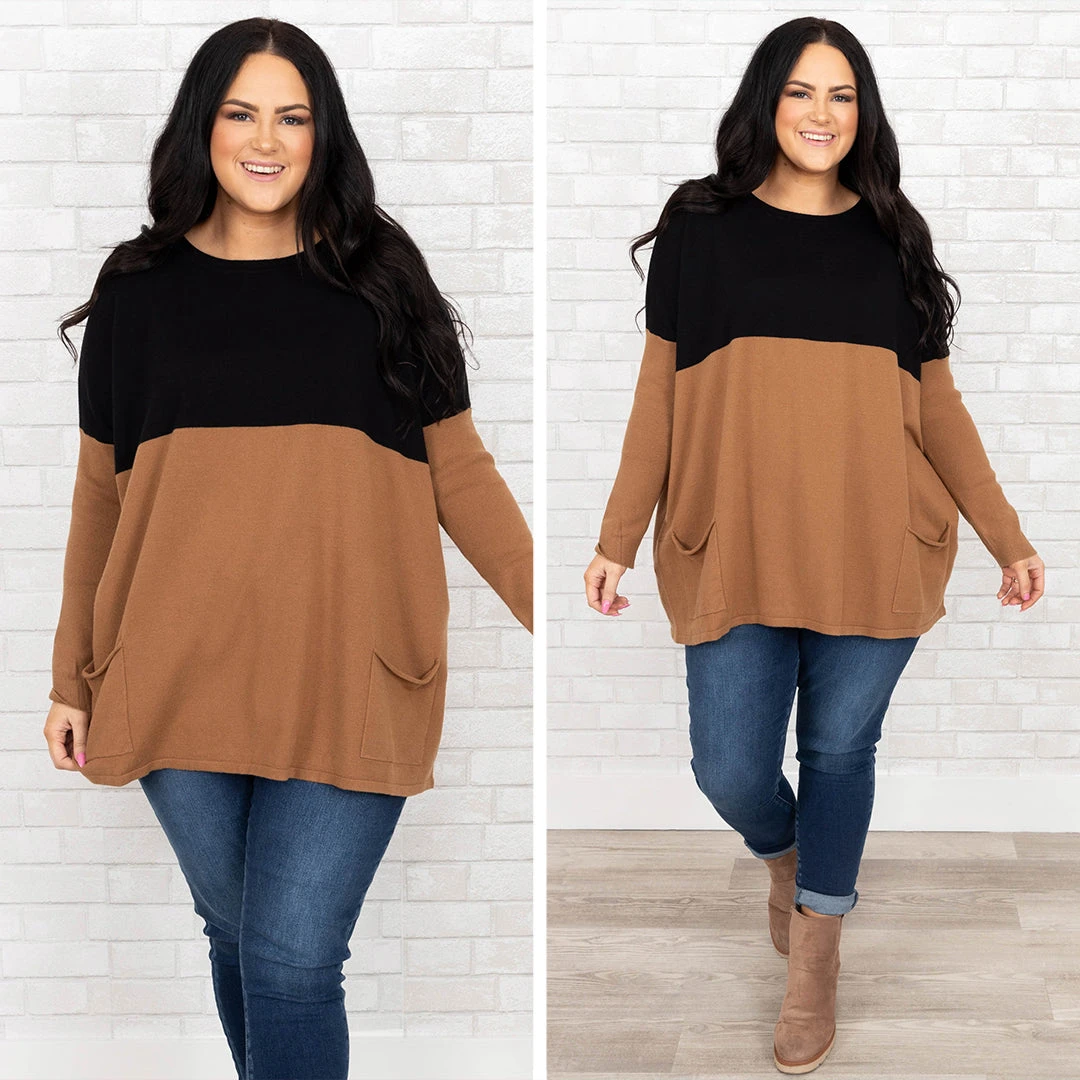 This sweater has everything we have been wanting!  It has the cutest color block print with beautiful neutral colors! You can dress this sweater up or down and pair it with everything in your wardrobe! It’s comfortable for all-day wear, and has a figure-flattering fit & pockets we love! Pair this sweater with cute skinnies and booties!