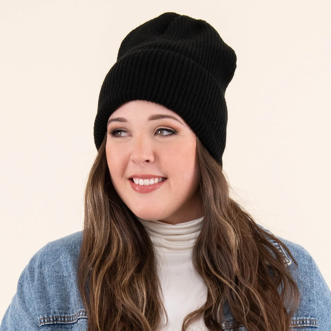 Stay warm and cozy in this beanie! It has the cutest solid black color, a trendy ribbed fabric, and a cozy feel that’s perfect for snow days! Style this beanie with a warm sweater and scarf for a fun cold weather look!