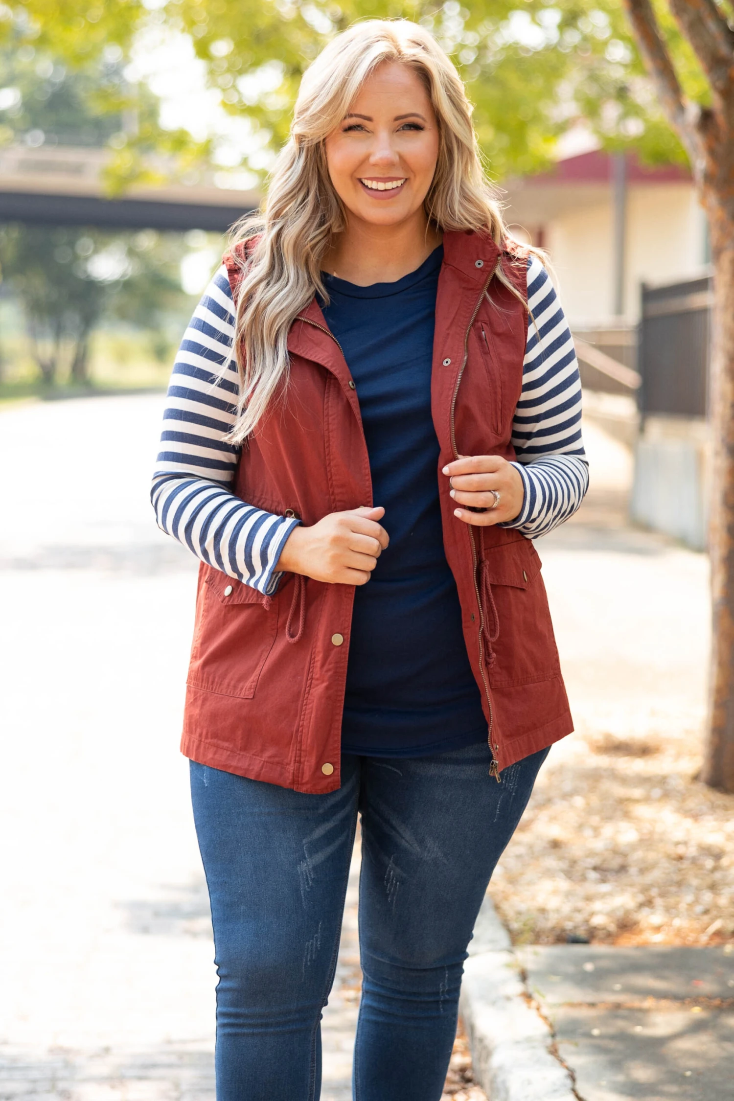Looking for a cool and carefree piece of clothing to add to your wardrobe? Look no further than this trendy vest! This vest has a bold rust color with a cargo-style fit for a look you can dress up or down and wear everywhere! It’s easy to style, looks good on every figure, and is perfect for the season! Simply style this vest with a patterned top and skinnies for an effortlessly chic look!