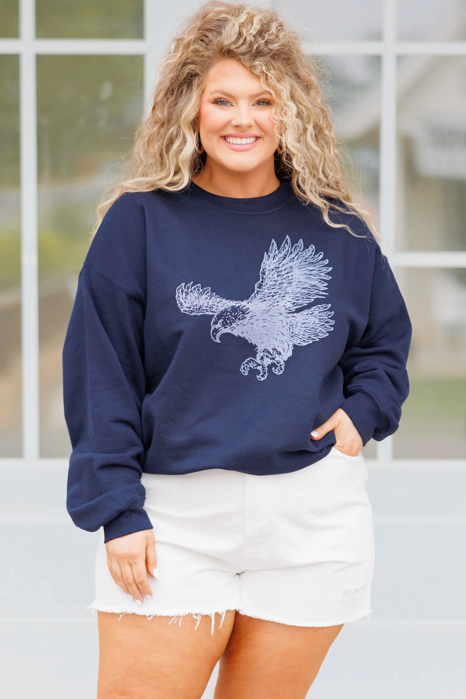 Soar high in this adorable sweatshirt! The eagle print is so cute and the navy color can be paired with anything! The tee style will keep you comfy all day long! Style this with jean shorts and sandals for a casual chic look!