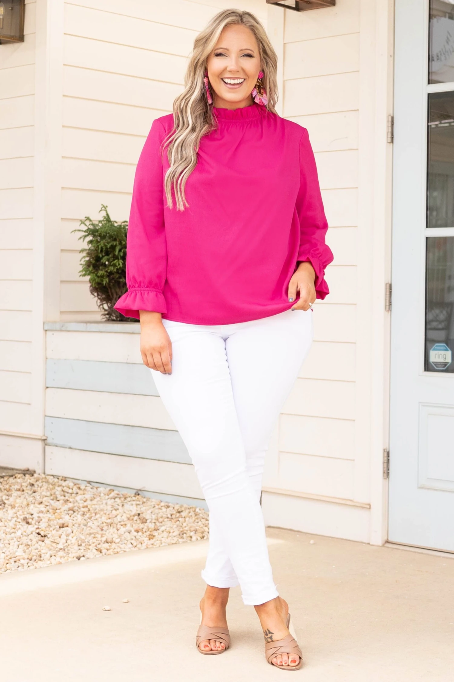 Go for a sweet look in this top! This cutie has a fuchsia color that you can dress up or down for any occasion! The high neck look is so fashionable and the long sleeves are so pretty! Pair this cutie with some white skinnies and heels for a statement-making look!