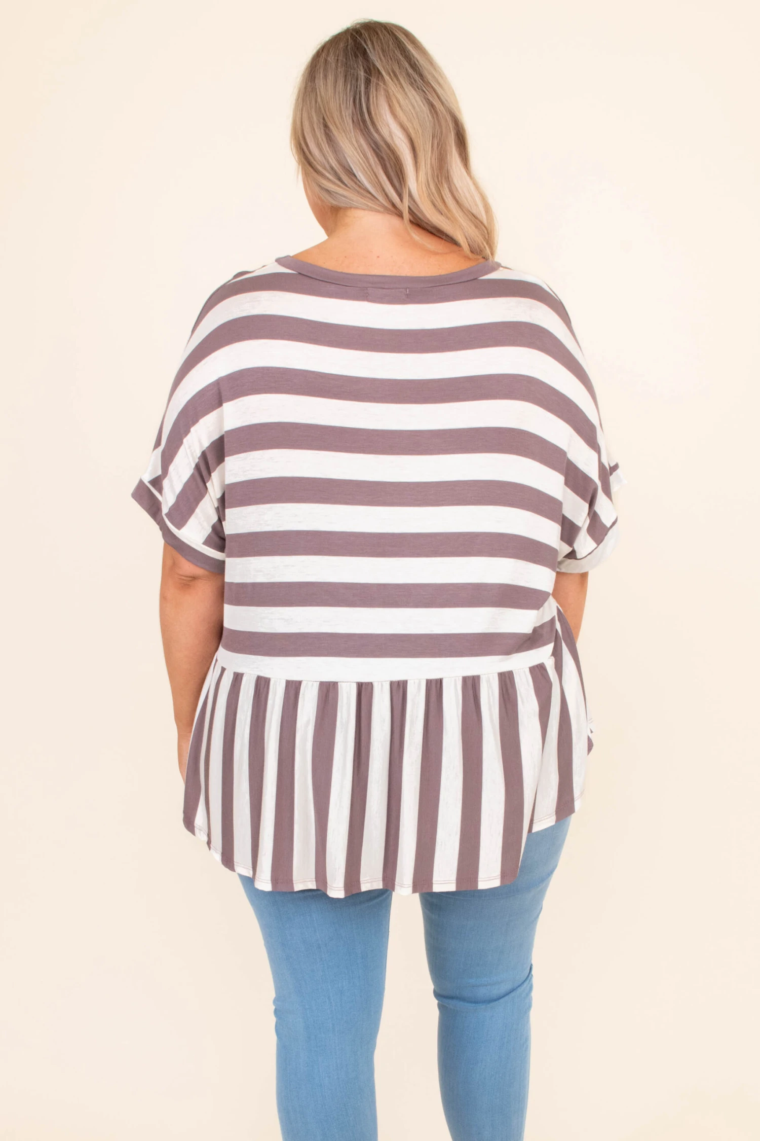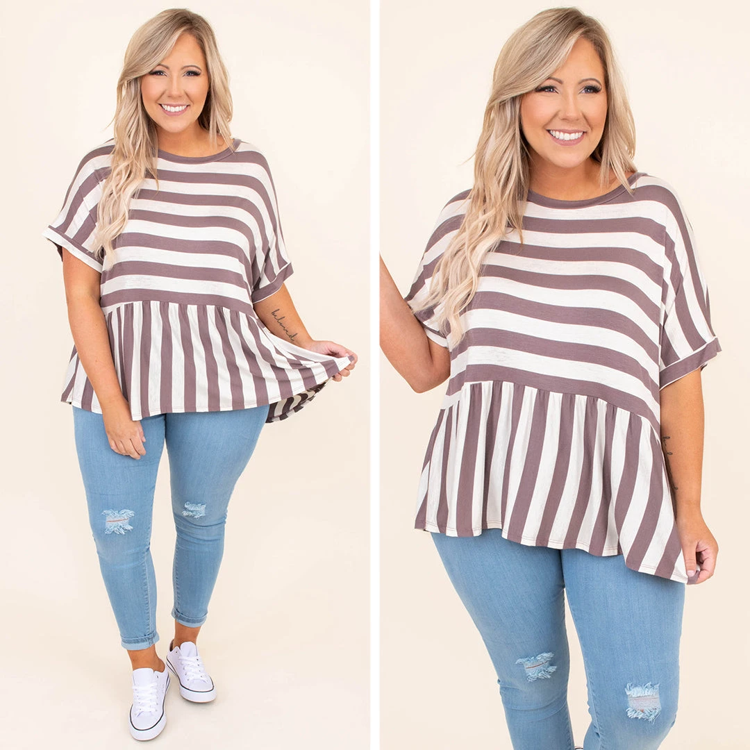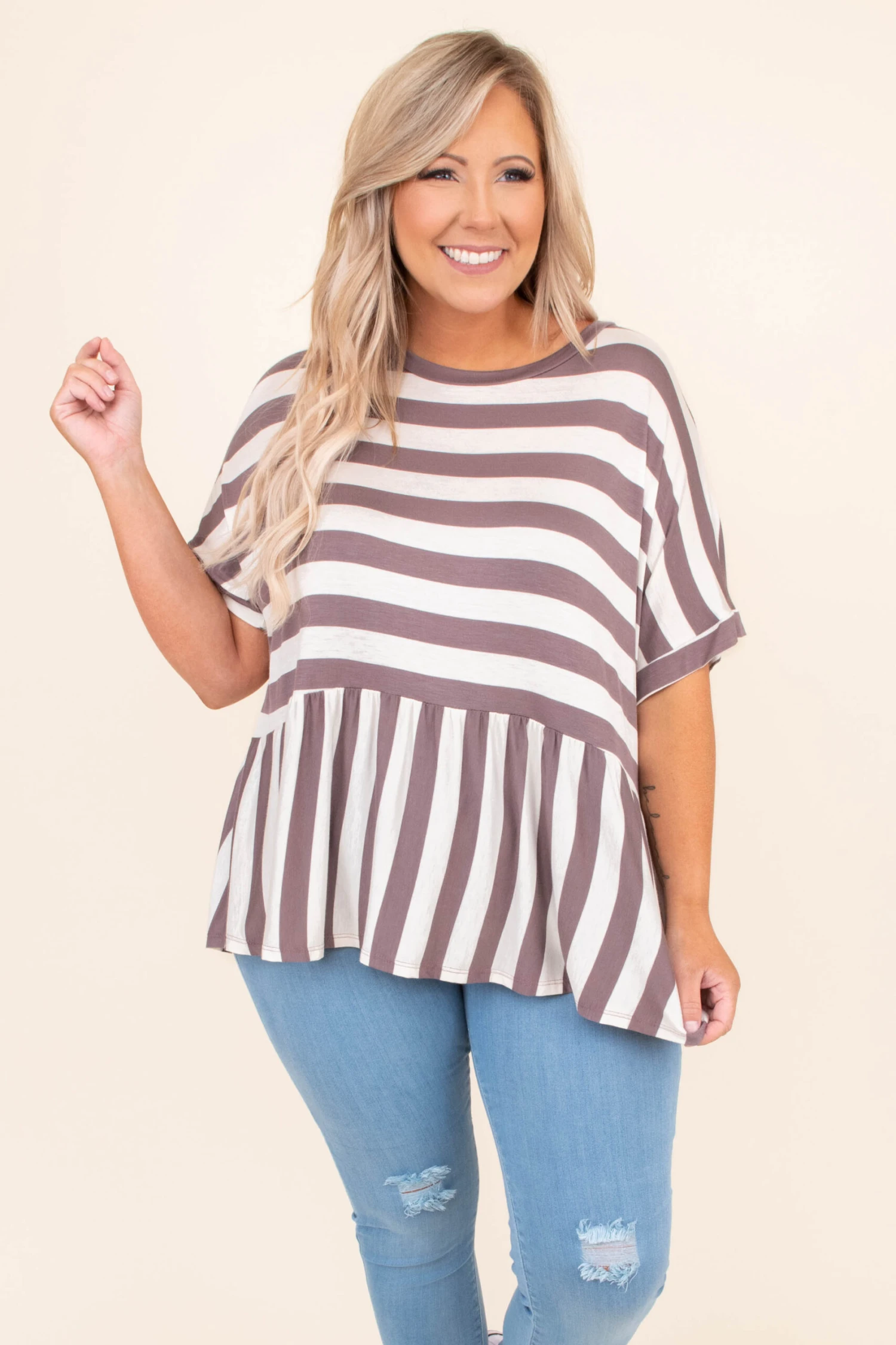 If this top has been on your mind, then it MUST be added to your cart! This top has a trendy stripe pattern with neutral colors you can style for every occasion! It’s comfortable for all day wear, has a flowy fit, and features a classic babydoll style to flatter your figure! Pair this top with skinnies and sandals for an easy everyday outfit!Â