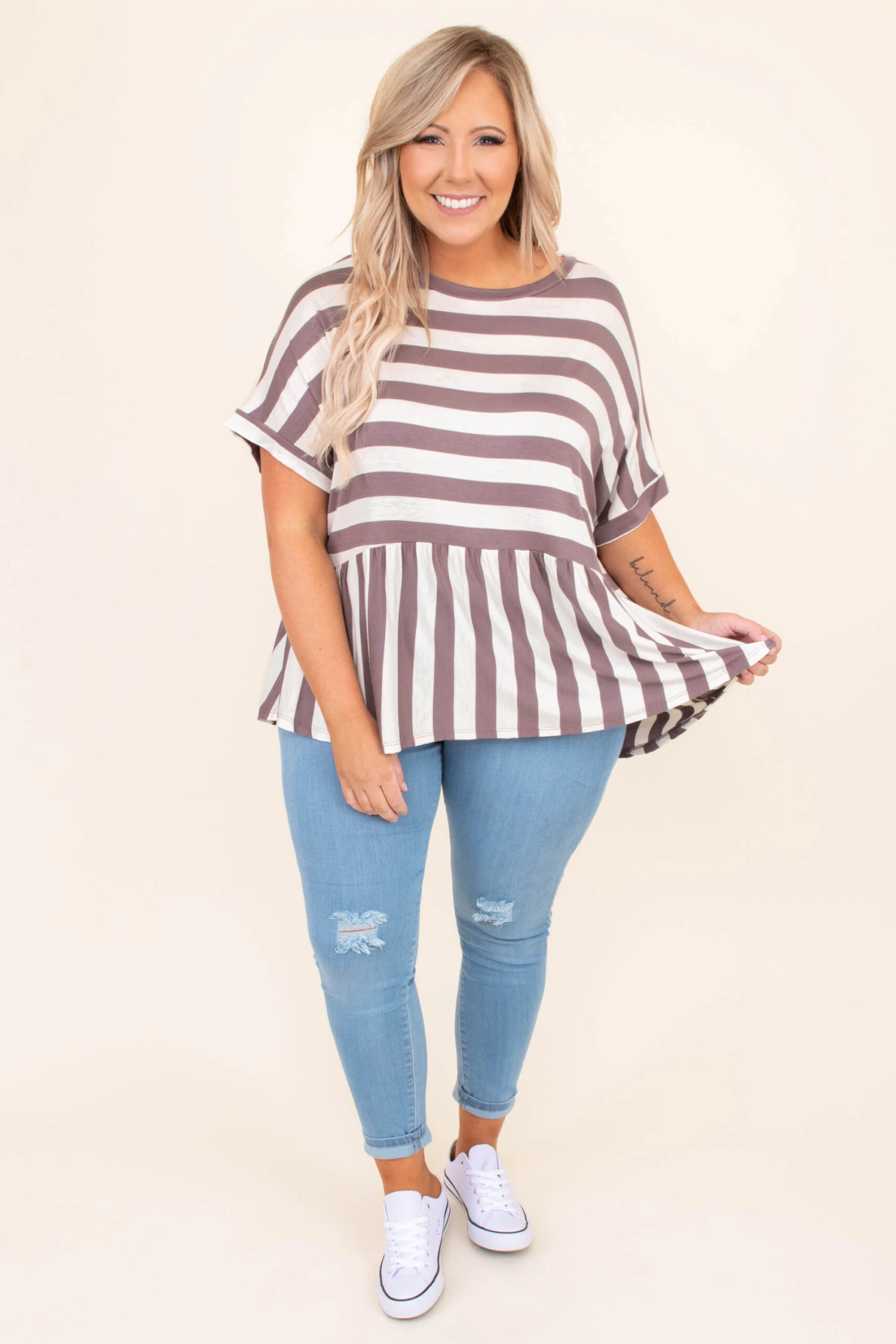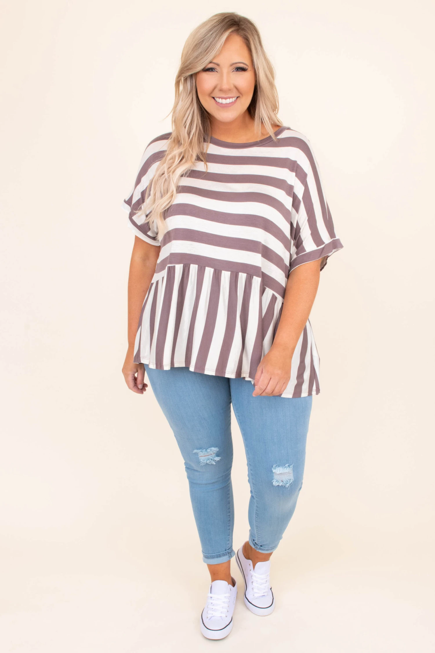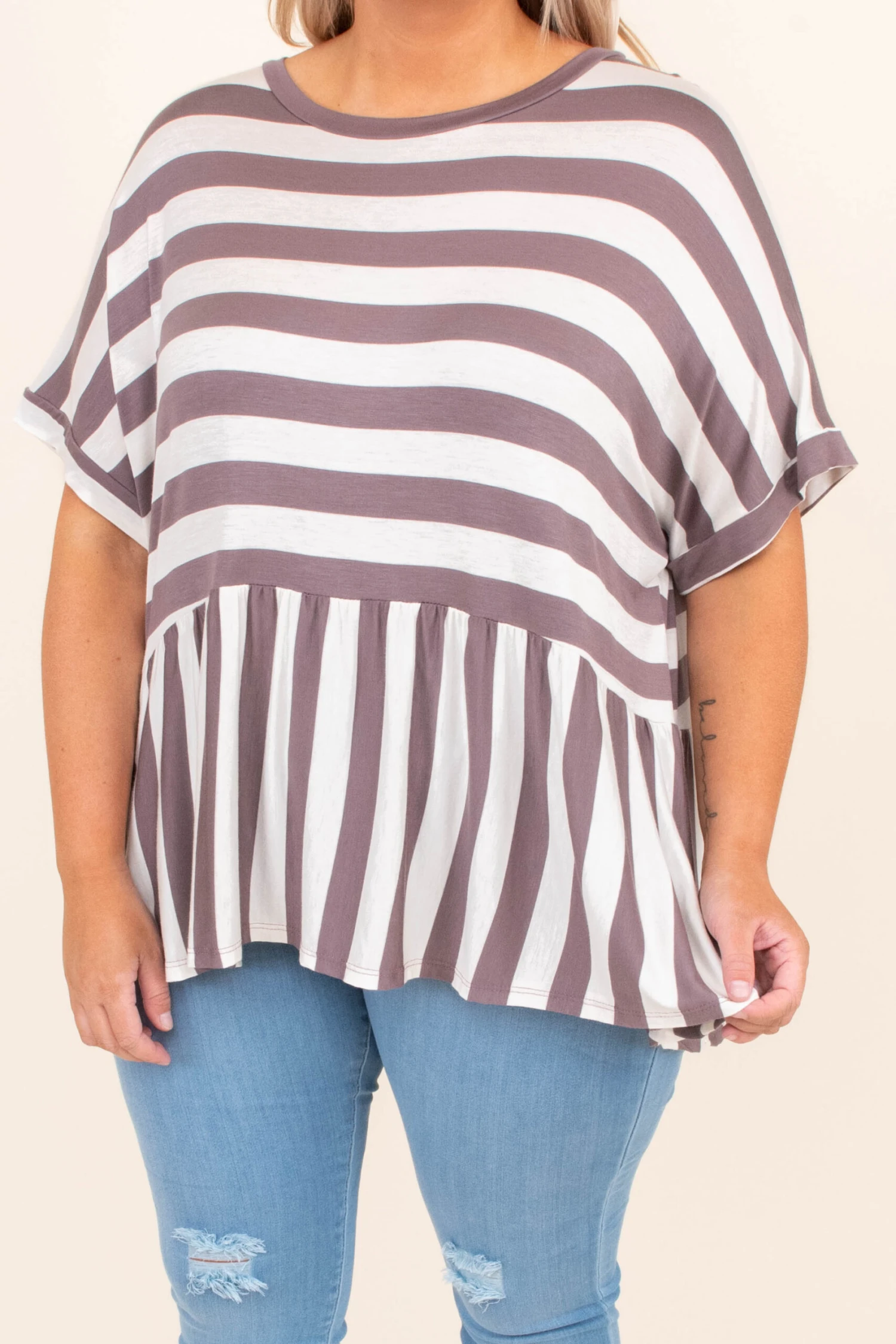 If this top has been on your mind, then it MUST be added to your cart! This top has a trendy stripe pattern with neutral colors you can style for every occasion! It’s comfortable for all day wear, has a flowy fit, and features a classic babydoll style to flatter your figure! Pair this top with skinnies and sandals for an easy everyday outfit!Â
