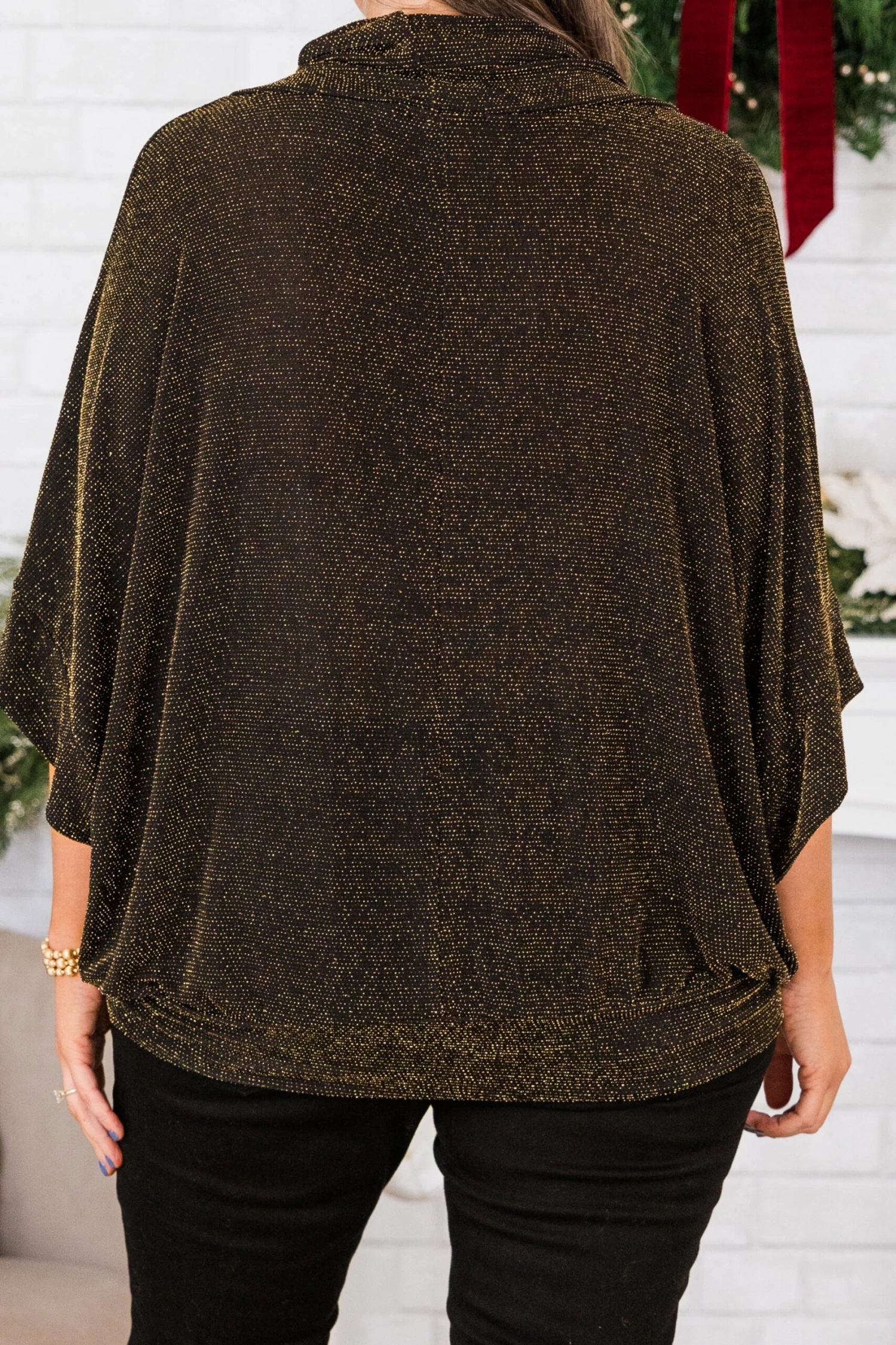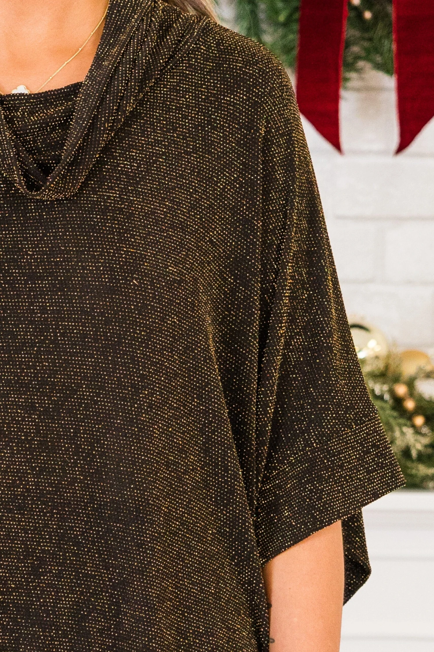 Indulge in sophistication with our Sparkle For Me Top! The black flowy fabric is elevated with a cowl neckline, accented with luxurious gold shimmer! The fitted band cinches at the waist for a flattering silhouette! Elevate your wardrobe with this exclusive piece!