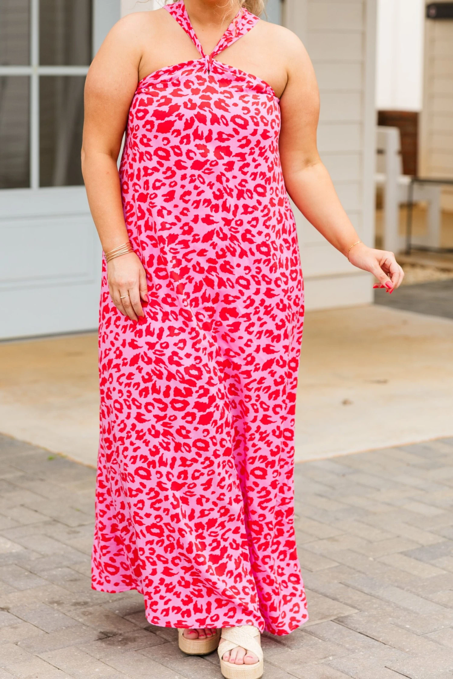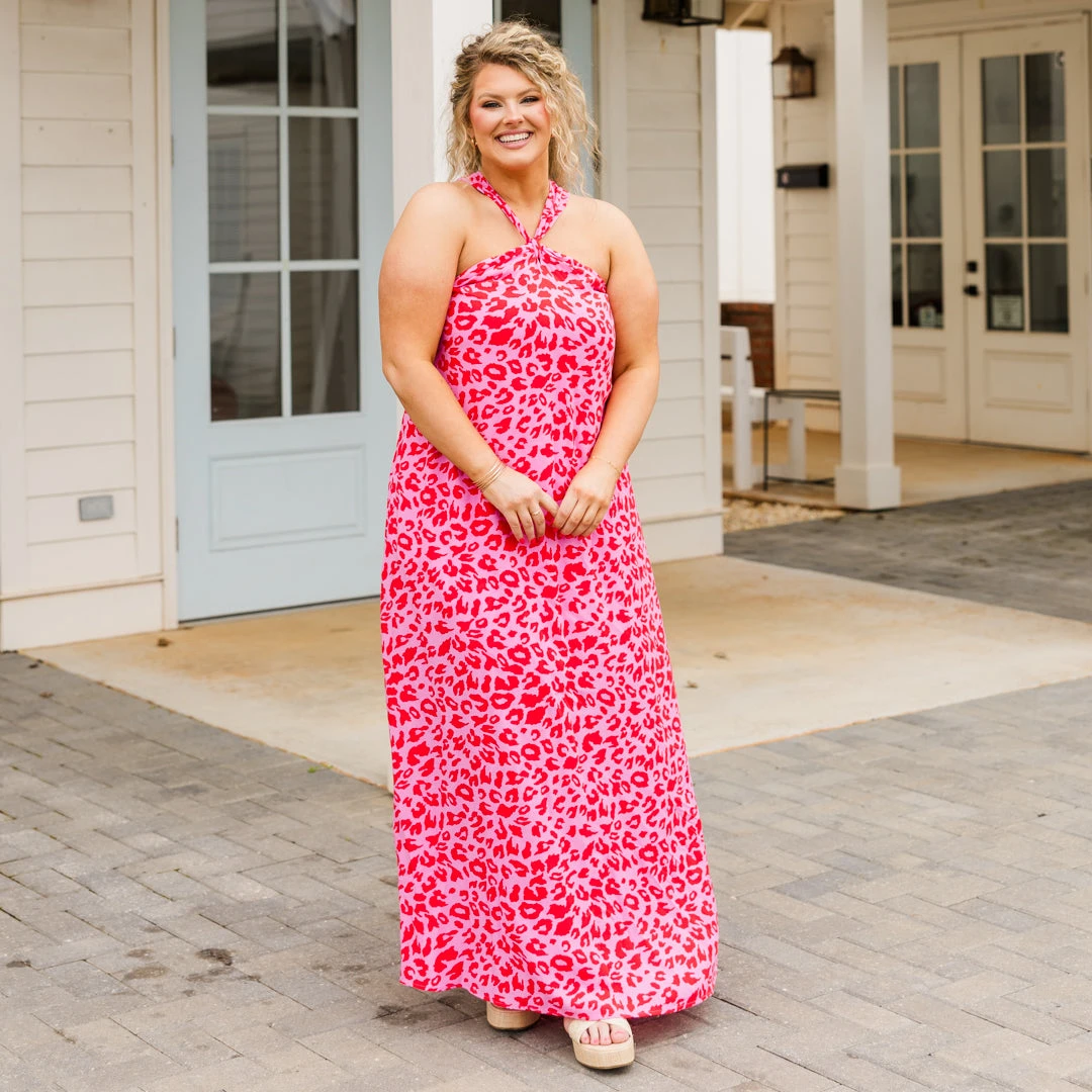 Spice up your wardrobe with this dress in hot pink! With a leopard print design and a playful halter neckline, this dress is perfect for adding some fun and flair to any outfit. So go ahead, add a little spice to your life with this must have dress of the summer!