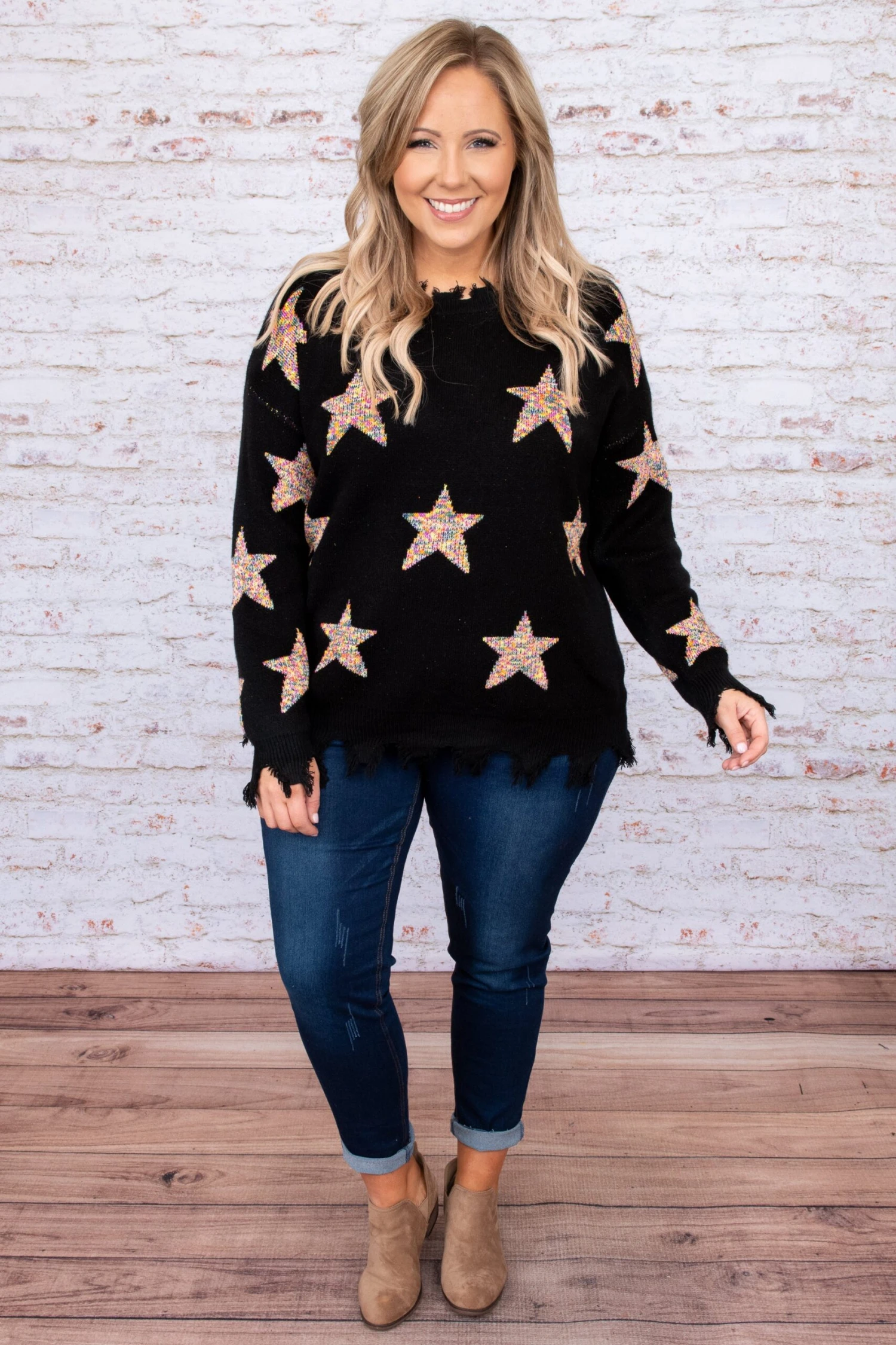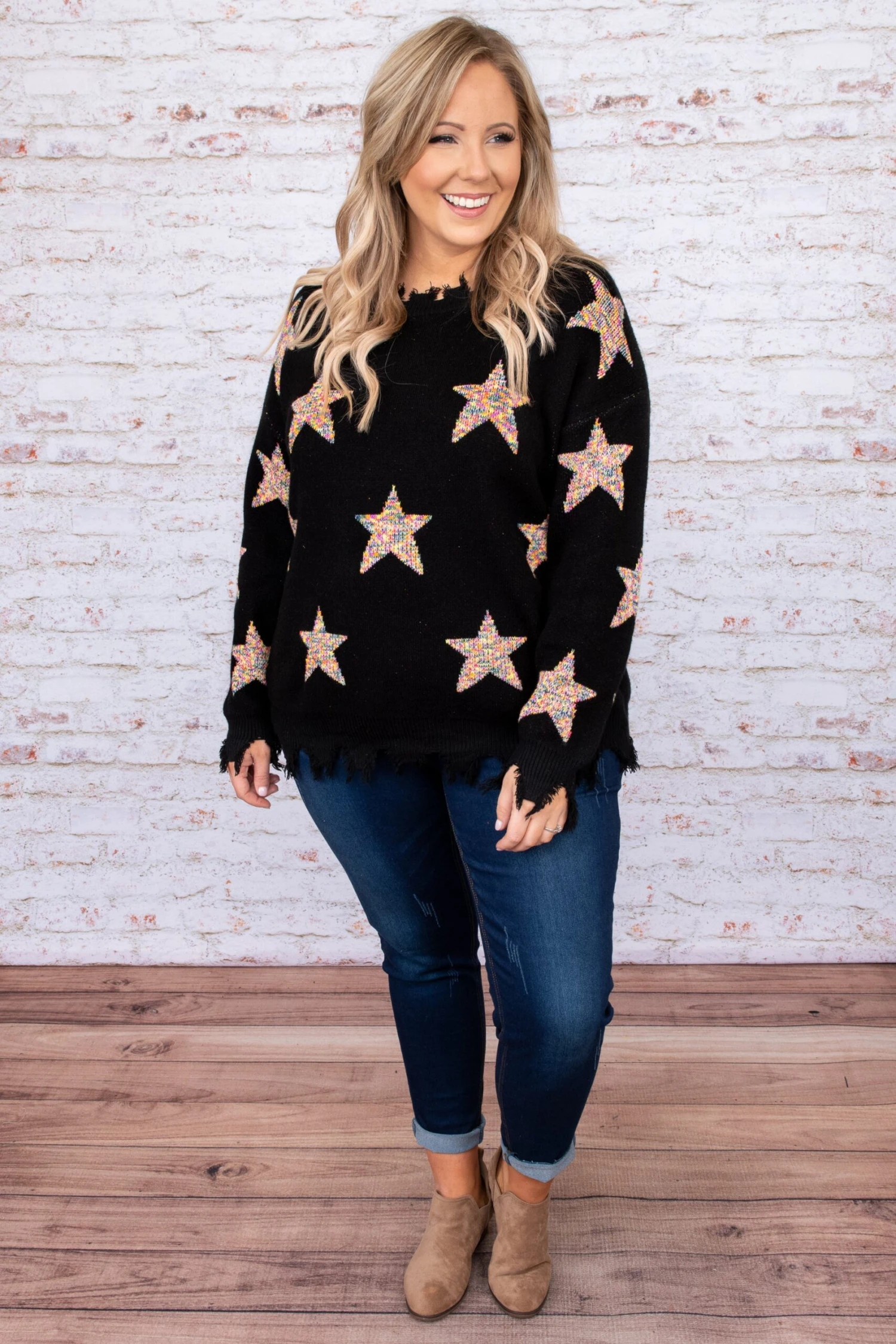 You’ll be swooning over this top! We are in love with the star print design and love how versatile this top is! It is so comfortable, figure-flattering, and perfect for dressing up or down! We see this paired with jeans and booties! Add a pop of gold jewelry to complete the look!Â