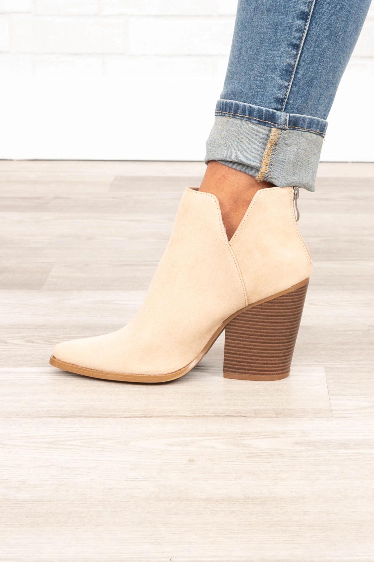 Stay on the right track with these lovely booties! They have a neutral toast color with a block heel and functional zipper that ensures the perfect fit! The sleek design and comfy fit are great for all day wear! Pair these booties with a flirty top and skinnies for a trendy chic look!
