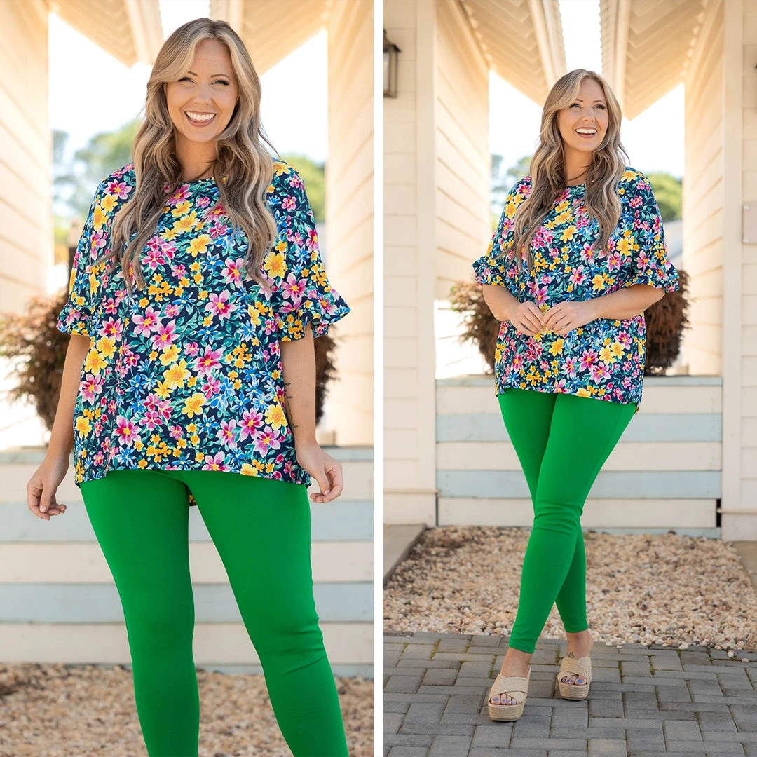 We are in LOVE with this beautiful top! It features a navy color and flutter sleeves for a romantic and girly look! Its flattering fit is sure to look and feel good! Style this top with some cute accessories and skinnies for an effortlessly chic look!