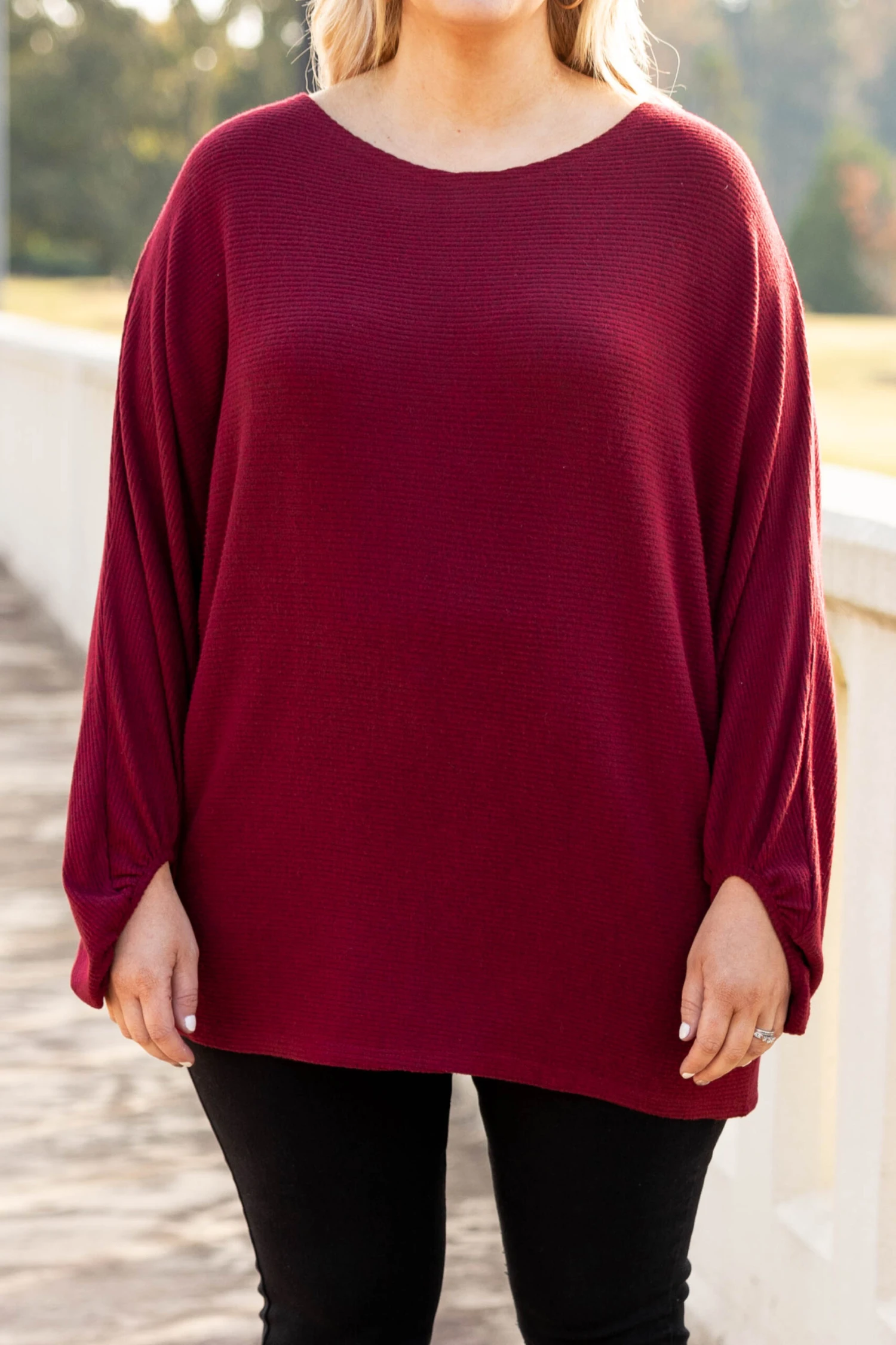 This tunic is the one that you need to add to your lineup! It has a super relaxed, oversized fit and a dreamy soft, ribbed fabric! We love the chic ruby color and how easy it is to wear casual or dressed up! Pair it with leggings and sneakers for a chill day or dress it up with a statement necklace and skinnies for a night out!