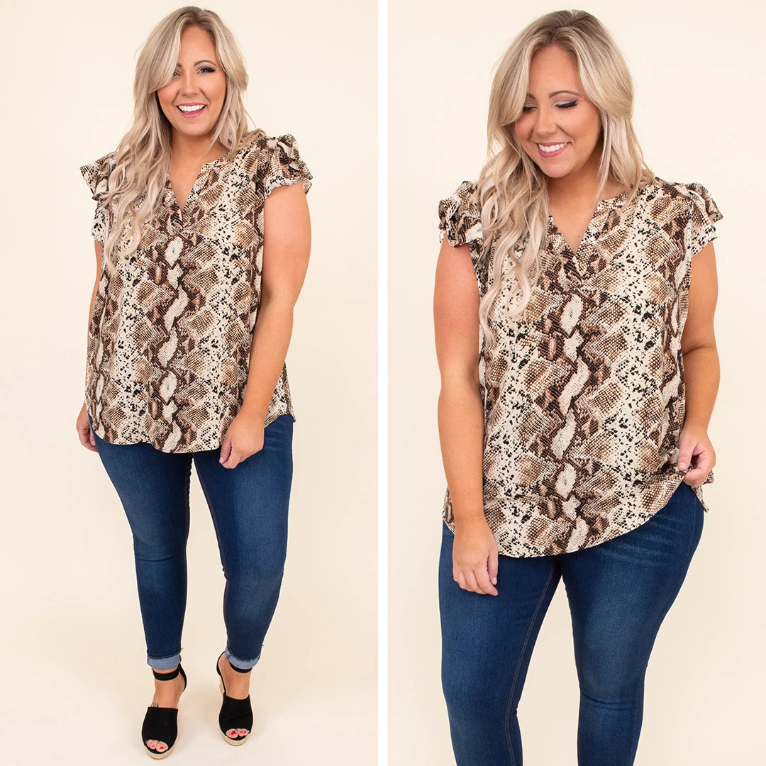 The truth is: we LOVE this top! This top has a trendy snakeskin pattern with neutral colors you can style for every occasion! It’s comfortable for all day wear, has a flowy fit, and features the cutest ruffled sleeves! Pair this top with skinnies and wedges for an effortlessly chic look!Â