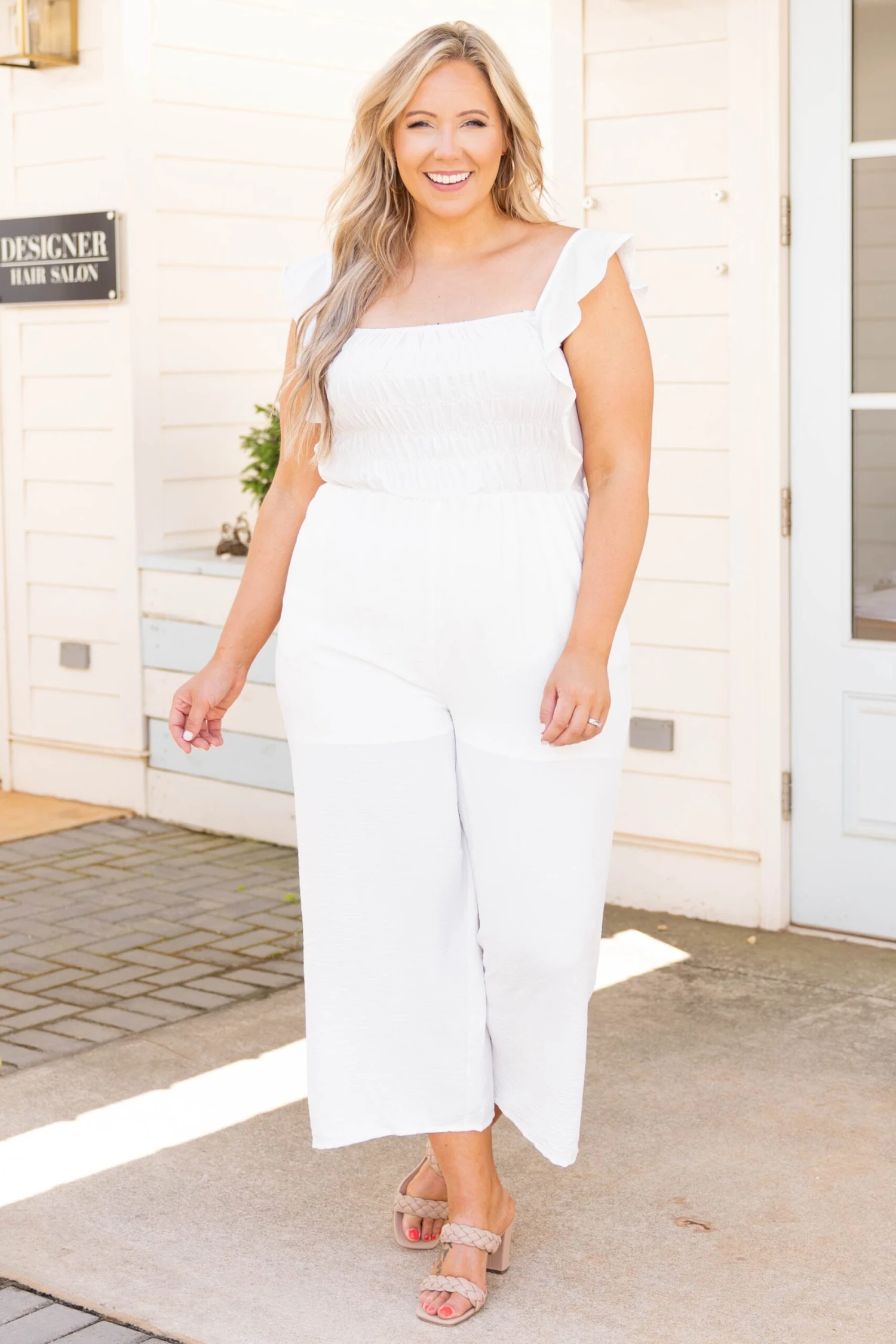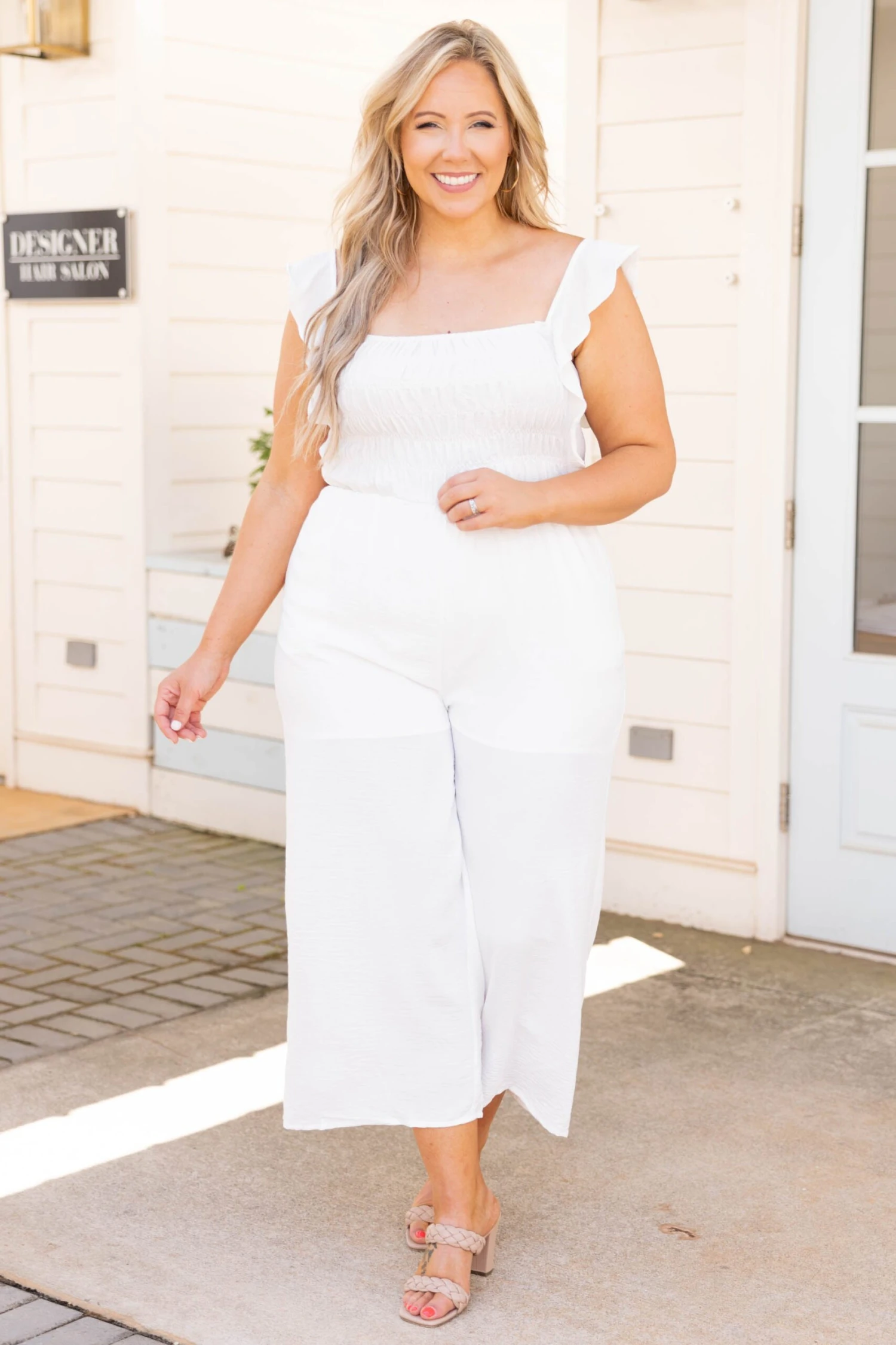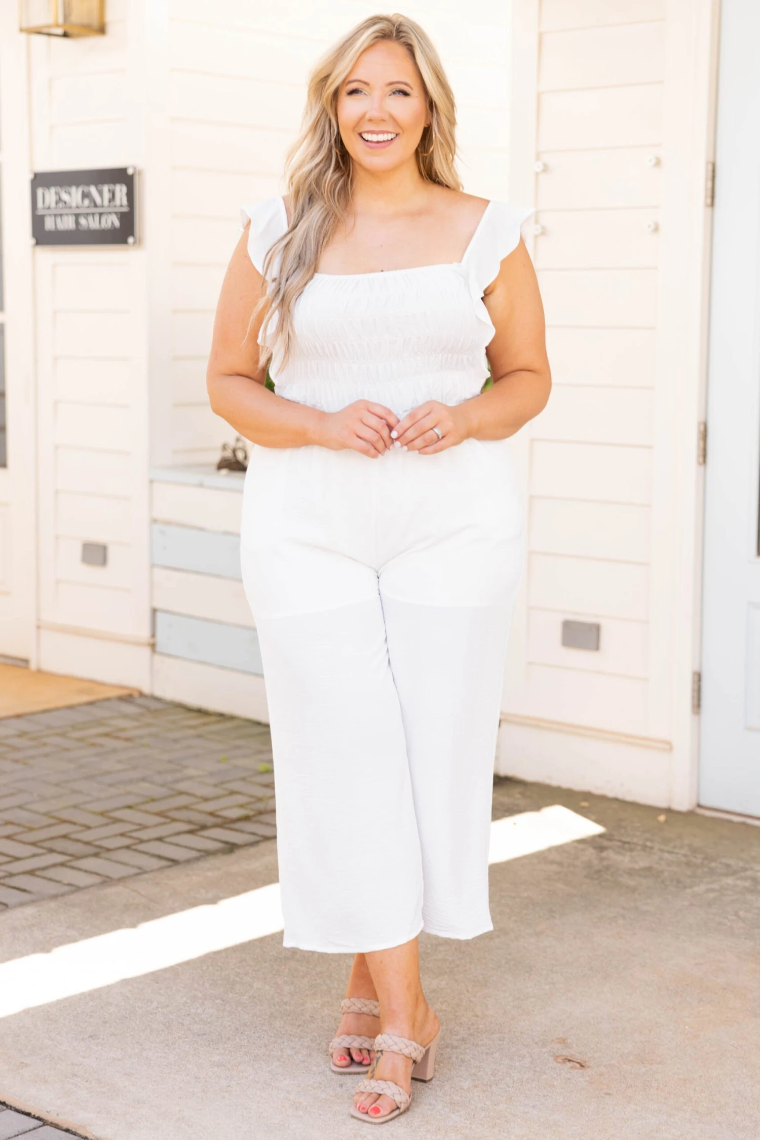 Look as stylish as a princess in this jumpsuit! The off white color is so chic and the ruffles on the sleeves are so sweet! We love the cropped style of the bottom that is trendy and the tie back is so fun! Style this with some heels or wedges for a chic look!