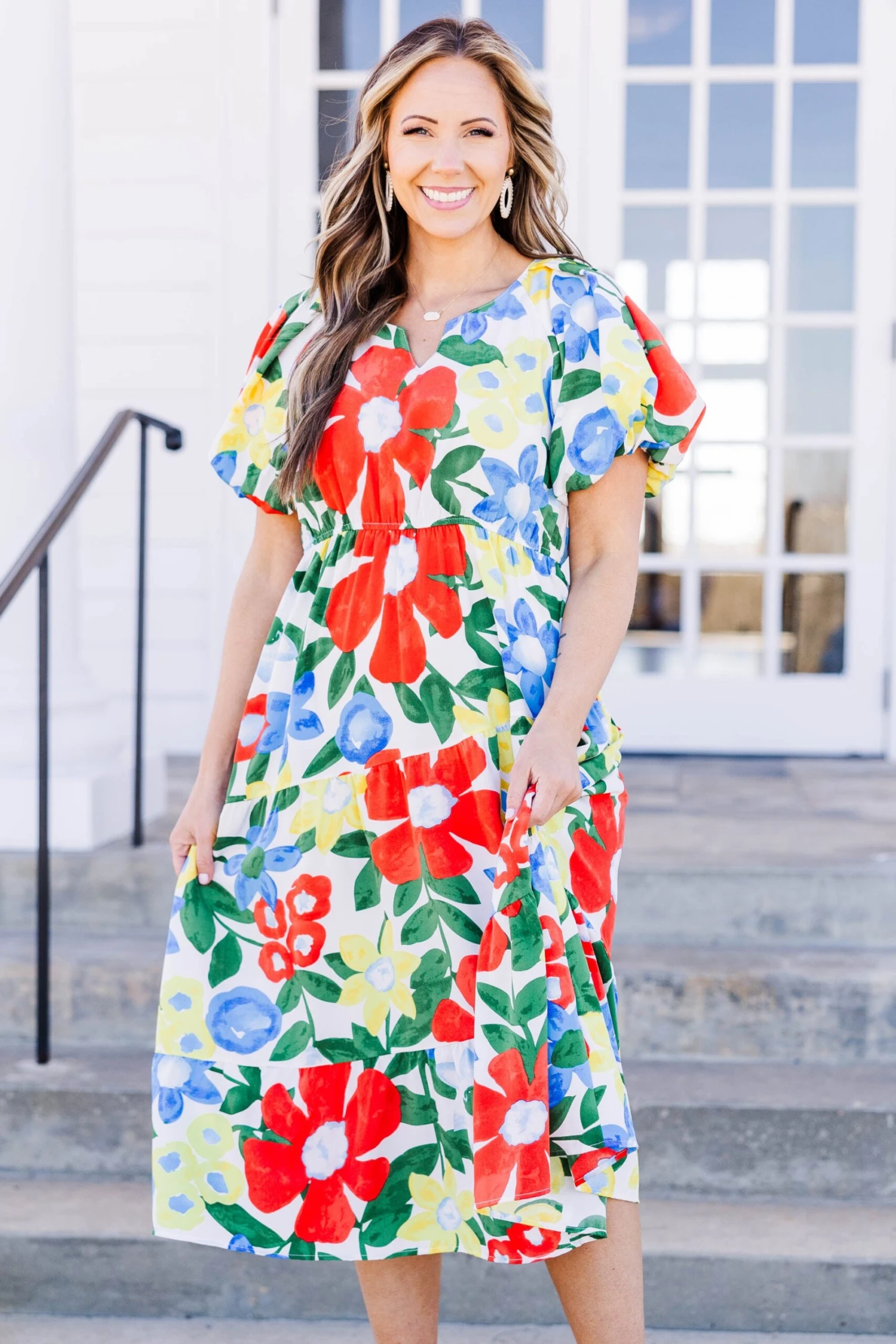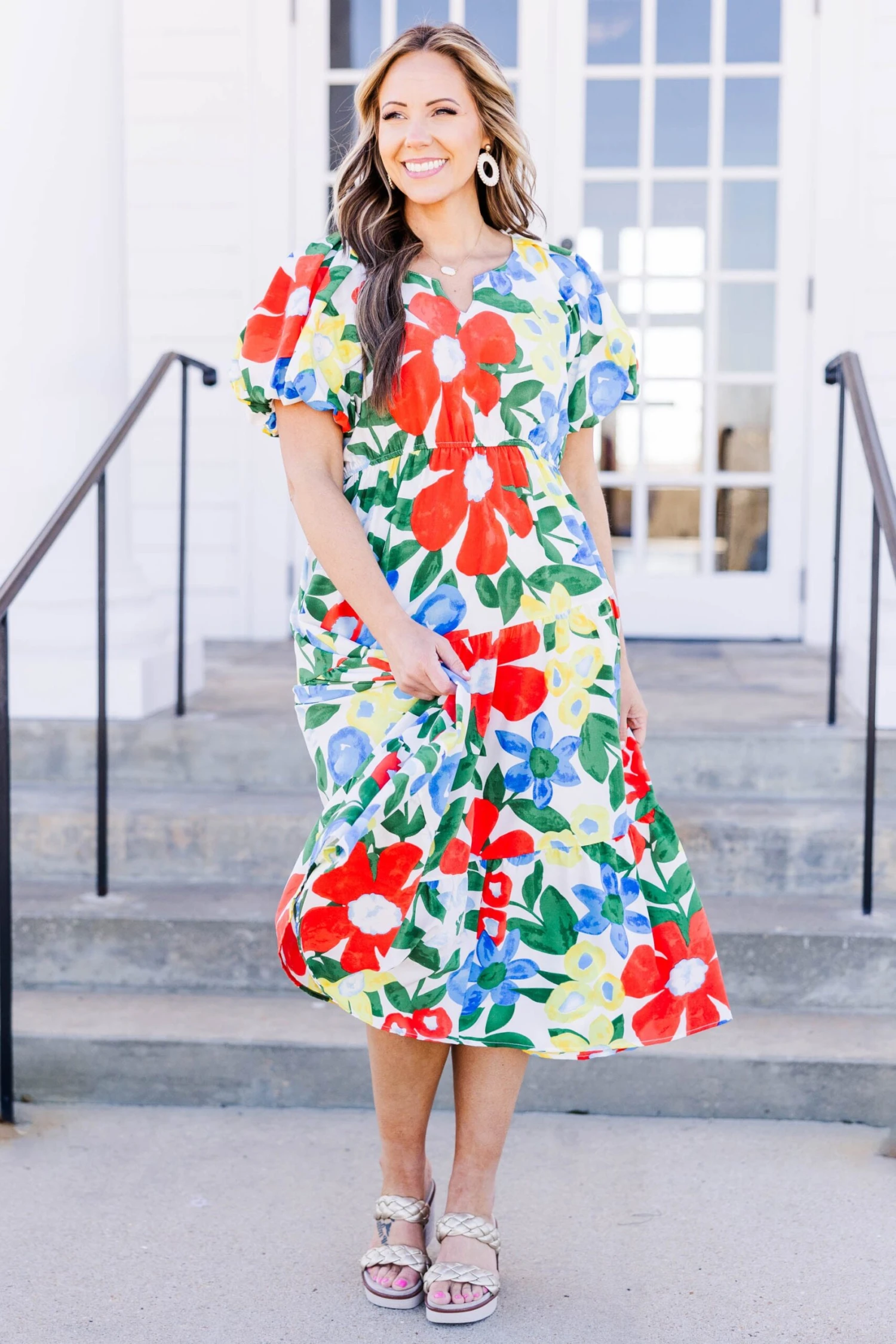 This dress will make an eye-catching statement with its off white color mix, beautiful floral pattern, and sassy midi length! The bubble sleeves add the perfect touch of sophistication and flair! Dress to impress in this stylish, sophisticated piece!