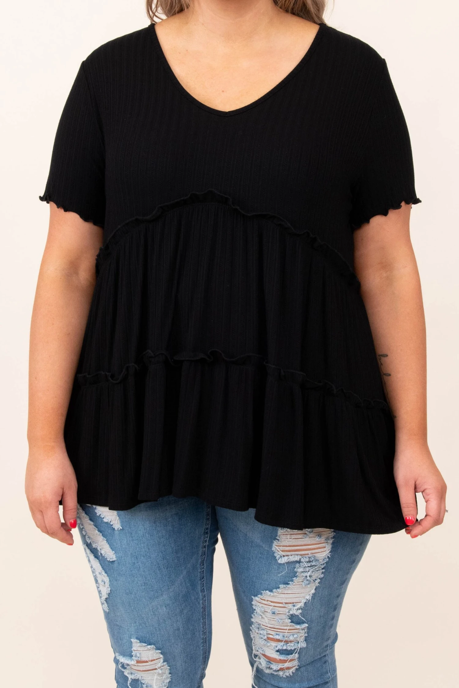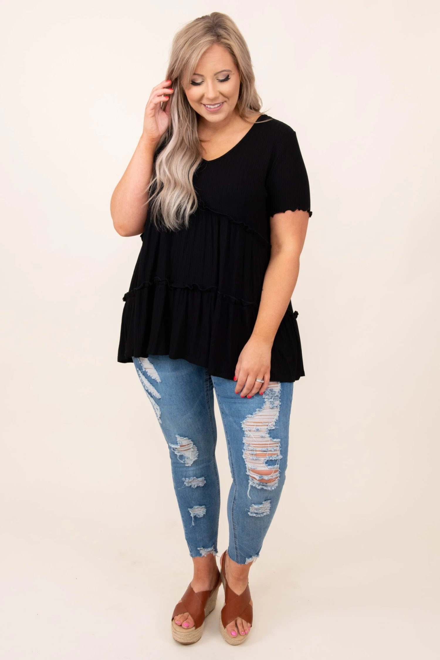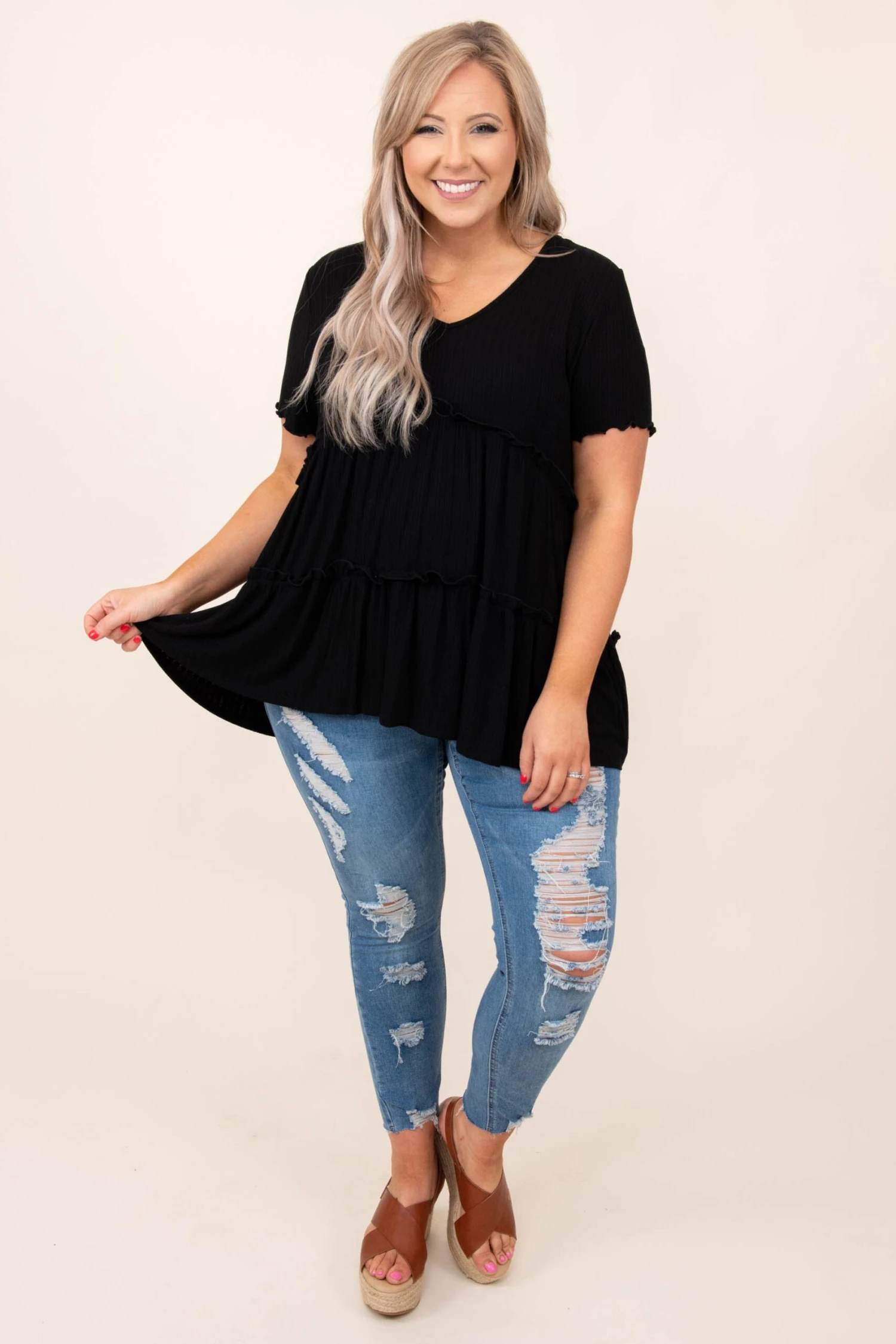 This flowy, ruffled beauty is SO soft and super easy to style. Plus, it can be worn during any season! Style it with distressed skinnies and sandals for a cute, casual look!