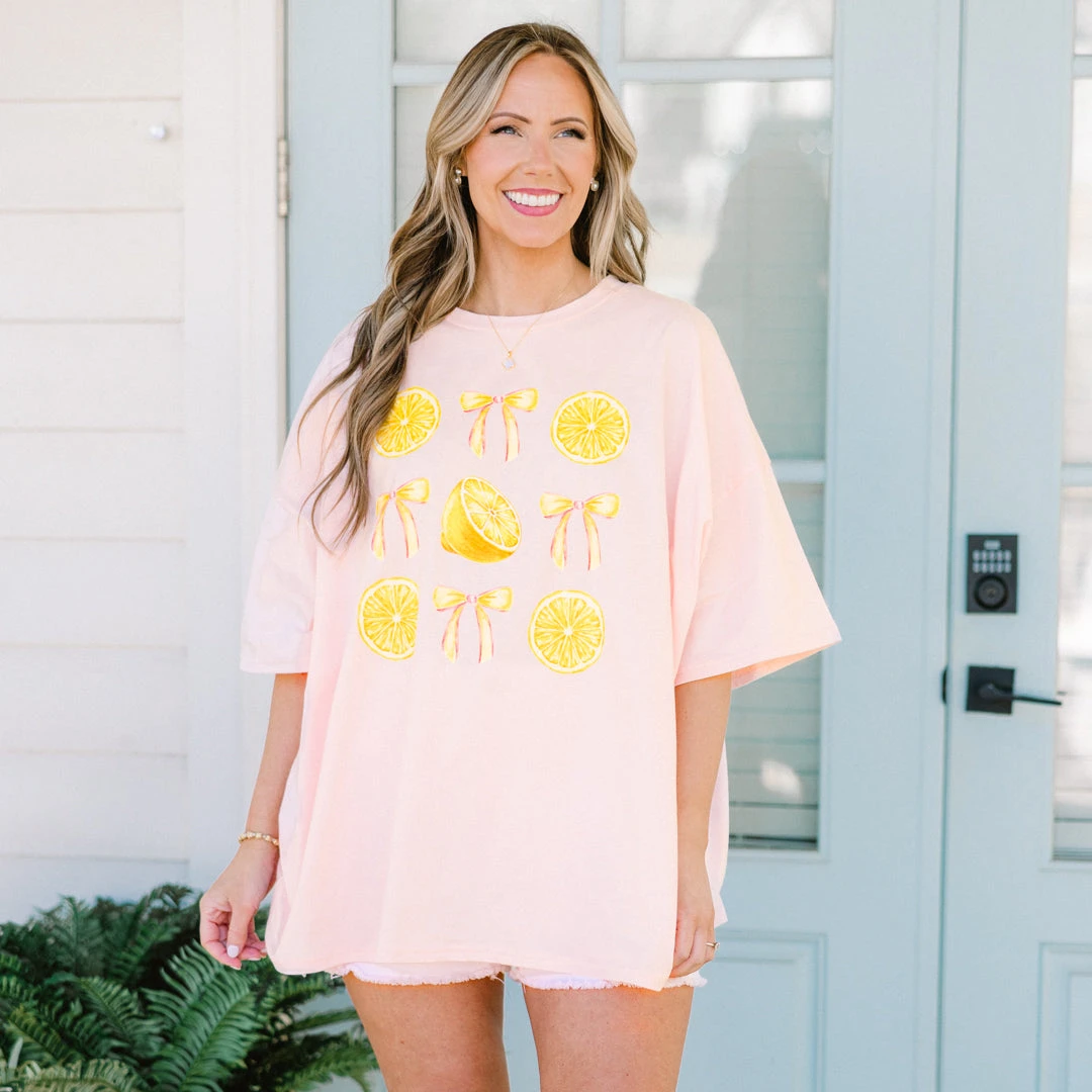 Introducing the Sunshine & Lemons Boyfriend Tee in cream pink! This oversized tee features a playful array of lemons and bows, adding a sweet touch to your everyday look! Perfect for a casual and comfy feel with a hint of charm! Get ready to brighten up your wardrobe with this must-have piece!
