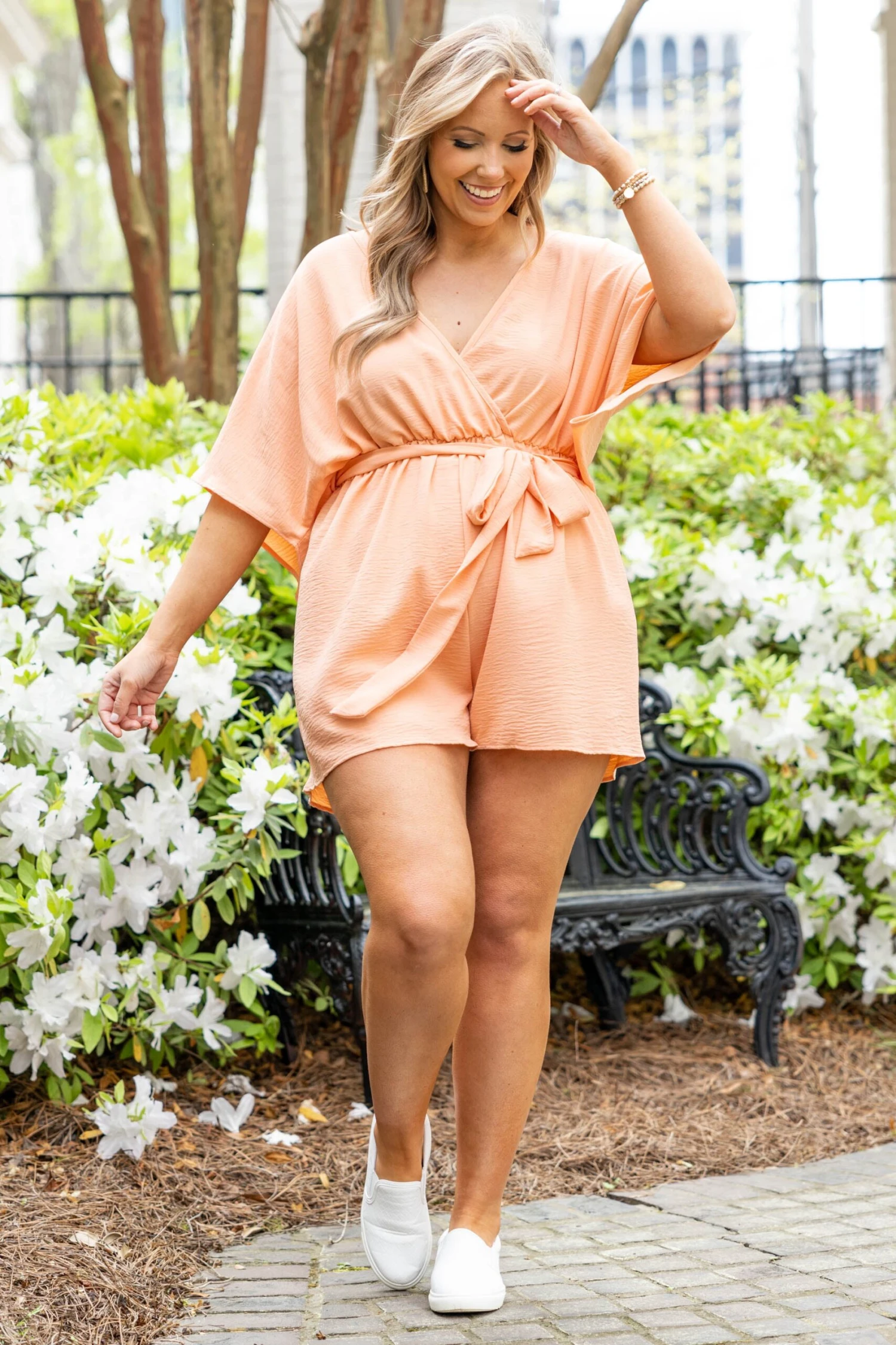 This romper is SUPER cute! It has a pretty peach color with a flirty crisscross neckline that is just in time for the season! The sassy, figure flattering fit is just what you need for your next event! Pair this cutie with some heels or sneakers for the ultimate chic look!