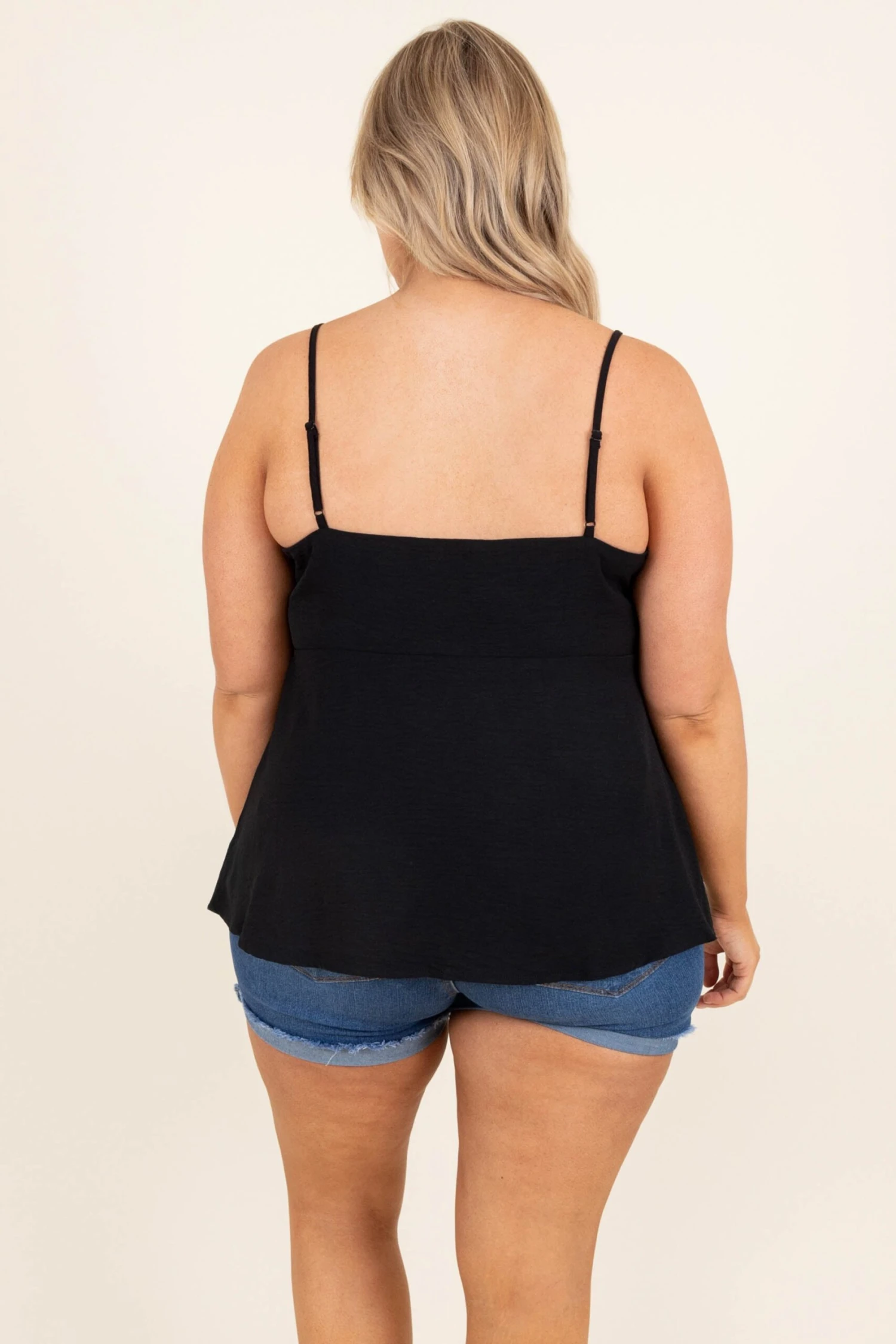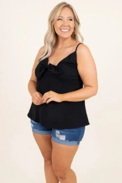 We are super obsessed with this tank! The black color is perfect to pair with anything and the knotted bust is so stylish! This cutie has adjustable straps so you can get the perfect fit and the satiny fabric is so luxe! Style these with some jean shorts and sandals for a chic look!