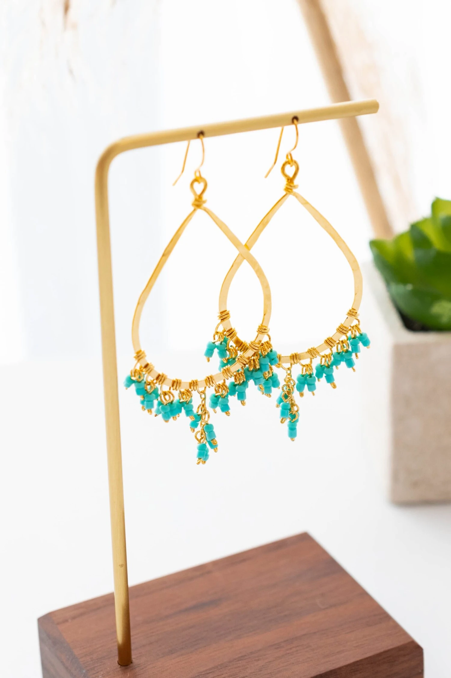 Every evening will be a sweet one wearing these earrings! They have a gold base color with a turquoise beaded design that is so elegant and sweet! The dangle style is perfect to pair with a classy dress or a cute blouse and skinnies for a look you’ll never forget!