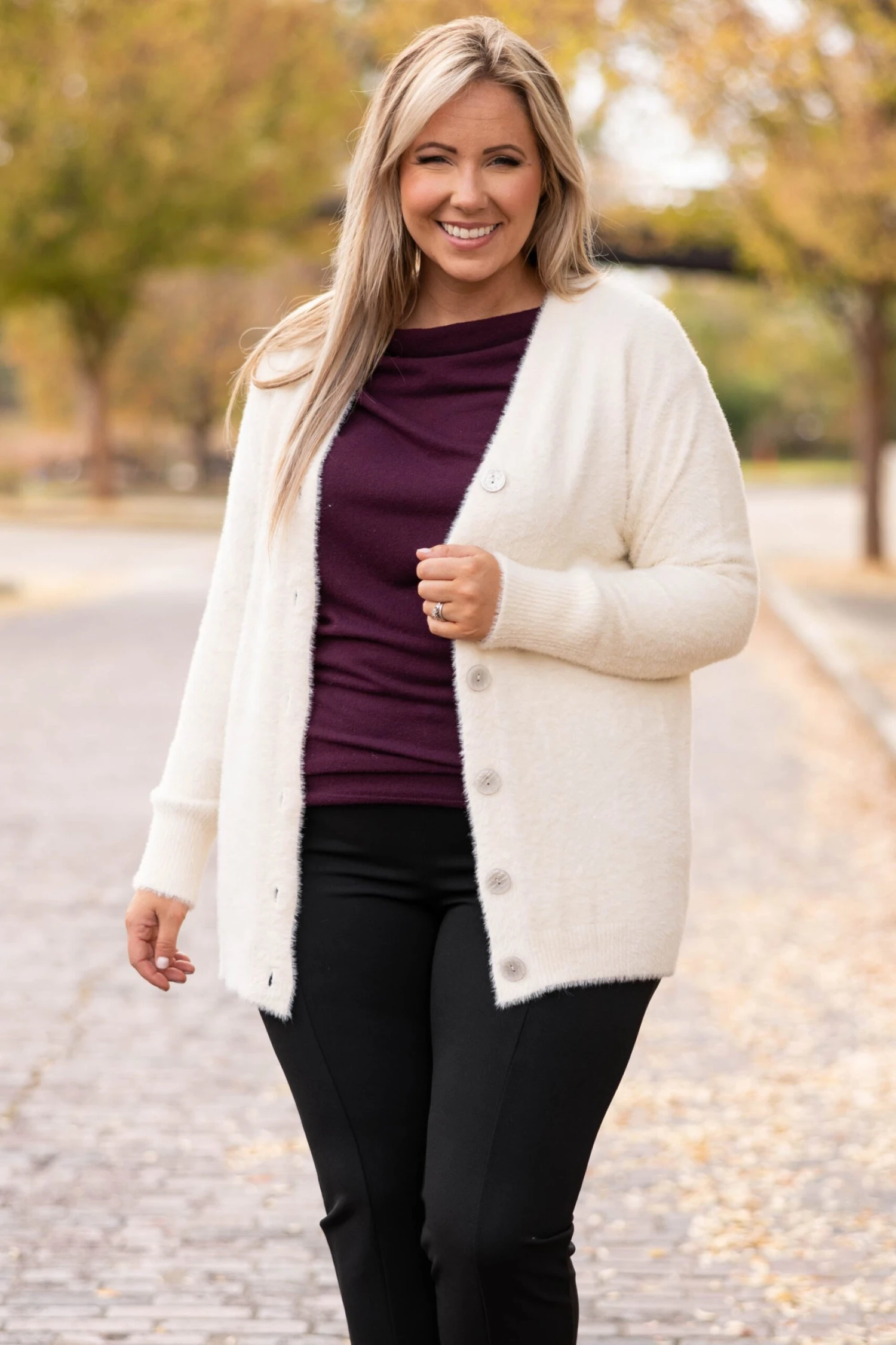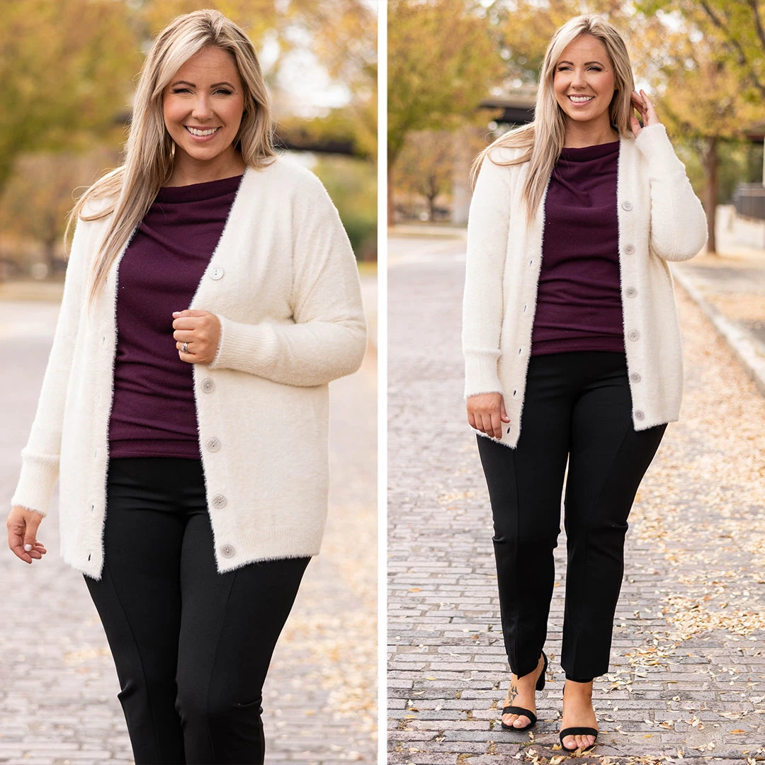 We are SO excited about this gorgeous cardi! This cardigan has a soft white color with a cozy, figure flattering fit that is super chic! We love this cardigan paired with a solid top and cute pants for an unforgettable chic look!