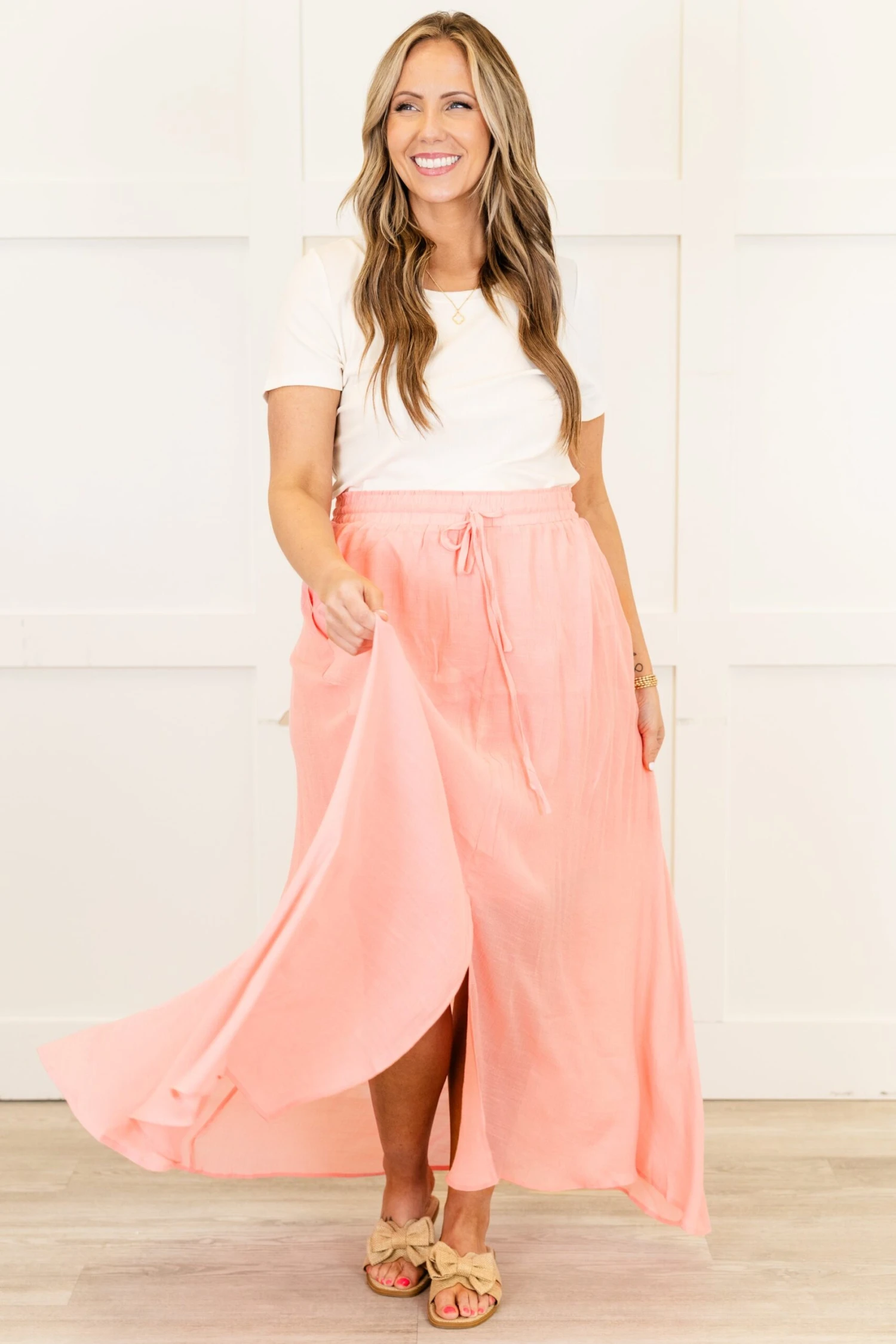 Take a break in this sweet skirt! The pastel pink color is so sweet and the front slit is so flirty! The adjustable tie on the elastic waist makes this cutie comfy for all day wear! Style it with a cute blouse and some sweet heels for a classy chic look!