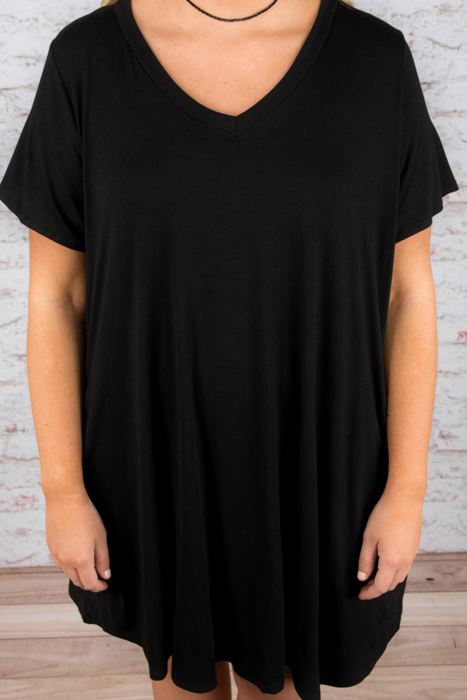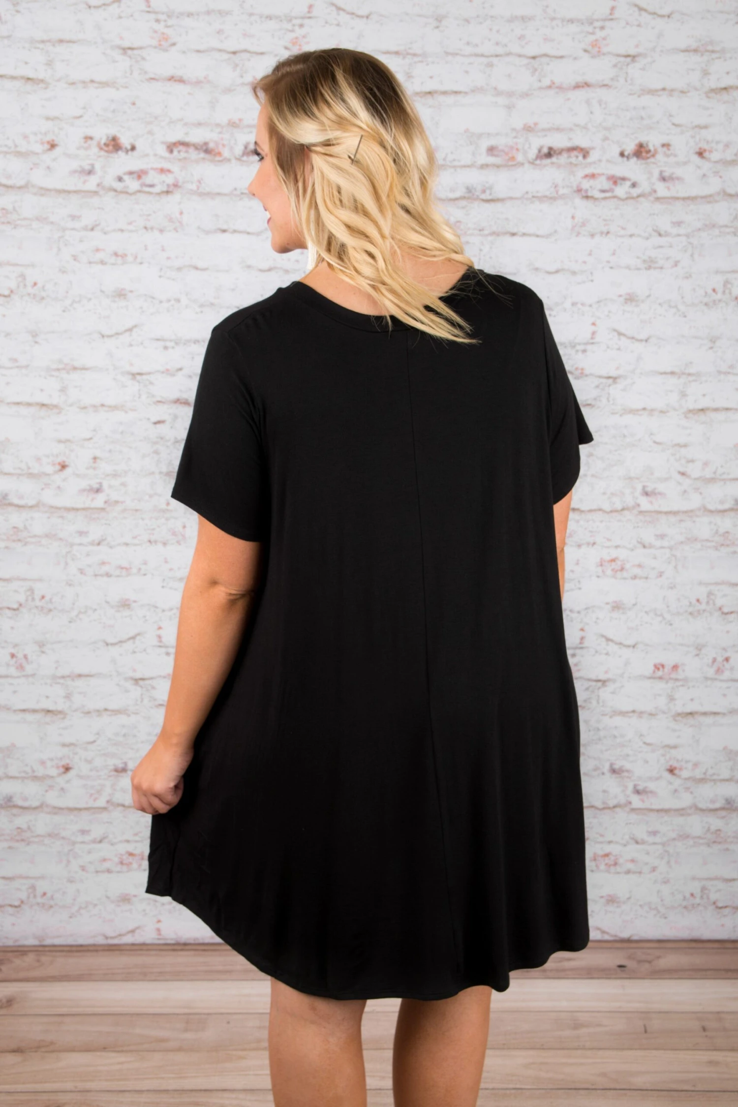 This casual t-shirt dress is everything you could want and more! This one looks great alone or with leggings for a more modest look! Plus, the black is ultra chic and makes it easy to dress this beauty up or down! It looks great with sneakers, sandals, or wedges, and the super soft jersey knit fabric will keep you nice and comfy!