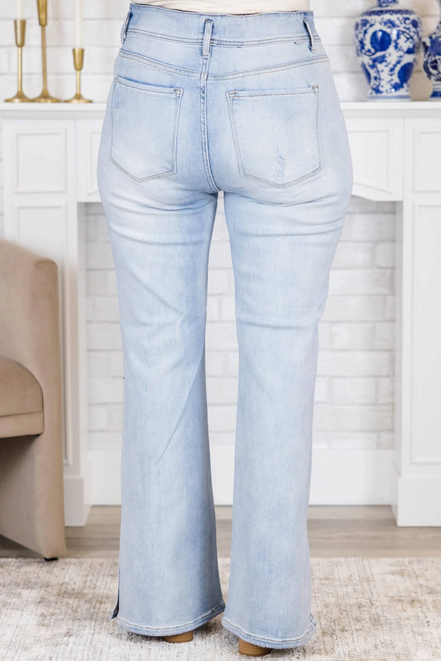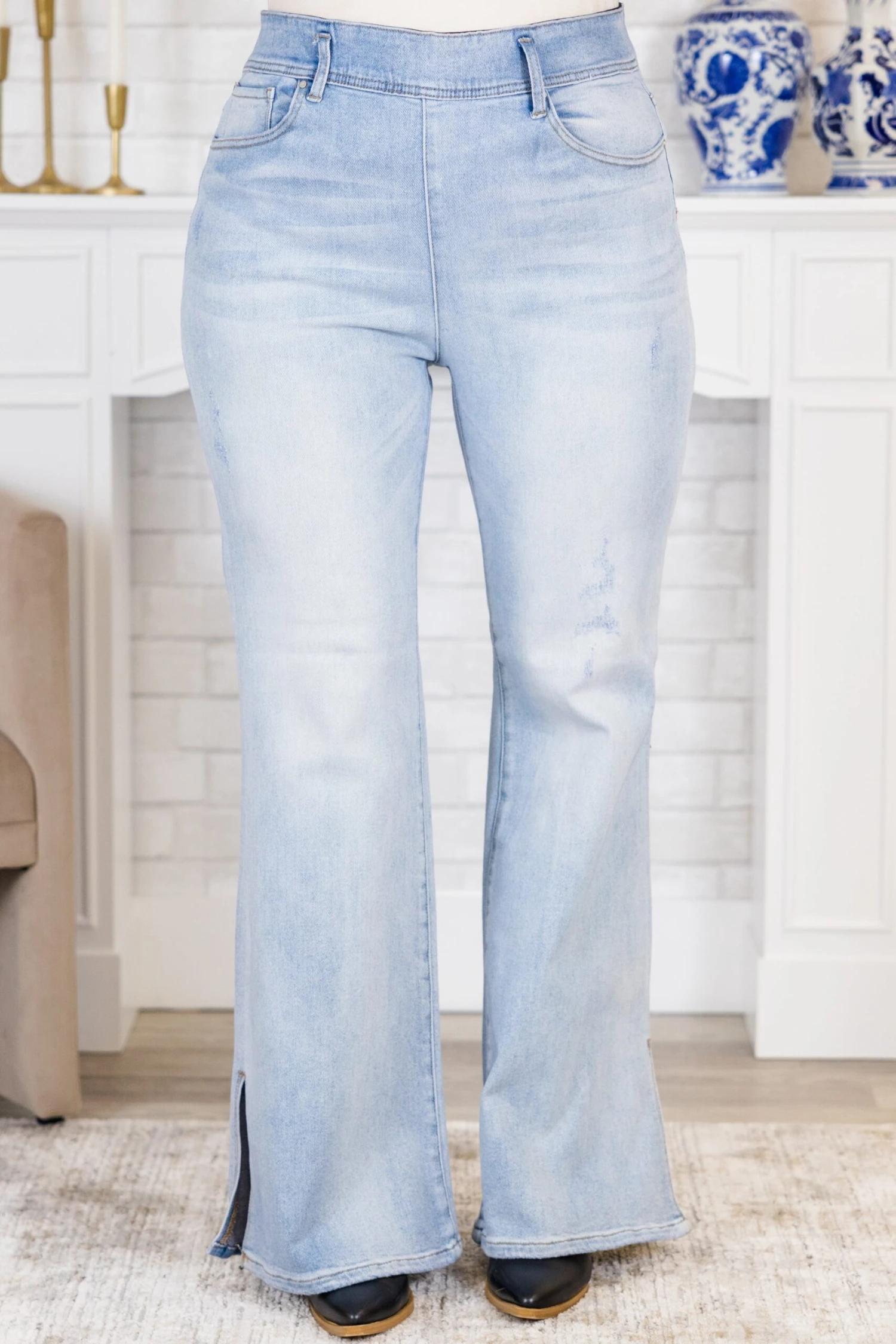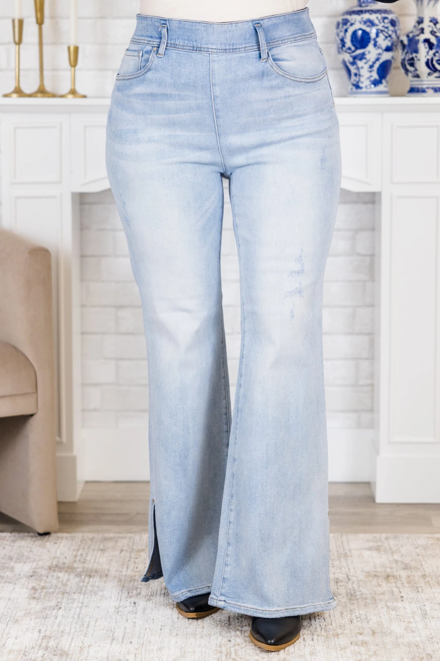 Get ready to rock and roll in our Perfect Balance Jeans! These high-rise flares give you a flattering silhouette while the side slits add a touch of edginess! Plus, the pull-on design makes them super easy to wear! Perfect for a casual day out or a night on the town!