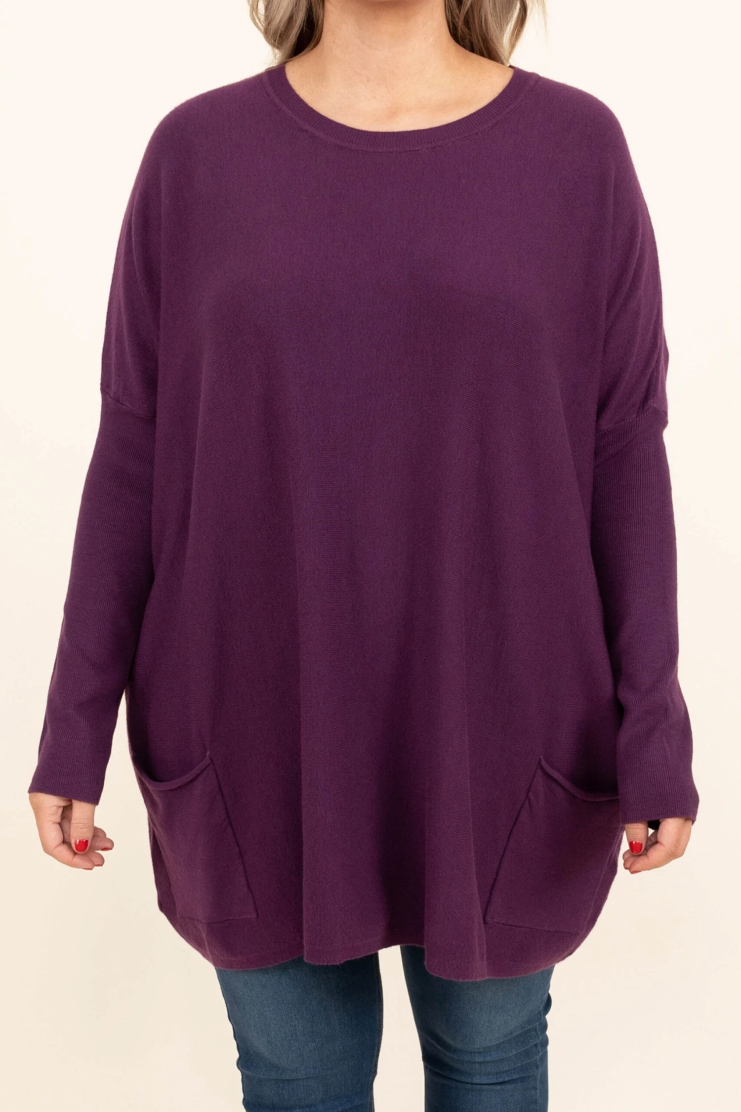 This sweater is thrilling! It serves as the perfect basic sweater to add fun accessories and even a cardigan! It has a figure-flattering and has a plum color to pair with all of your faves in your wardrobe! It features a soft material that will keep you warm for all of your outings! We see this paired with skinny jeans, booties, and a cute accessories!Â