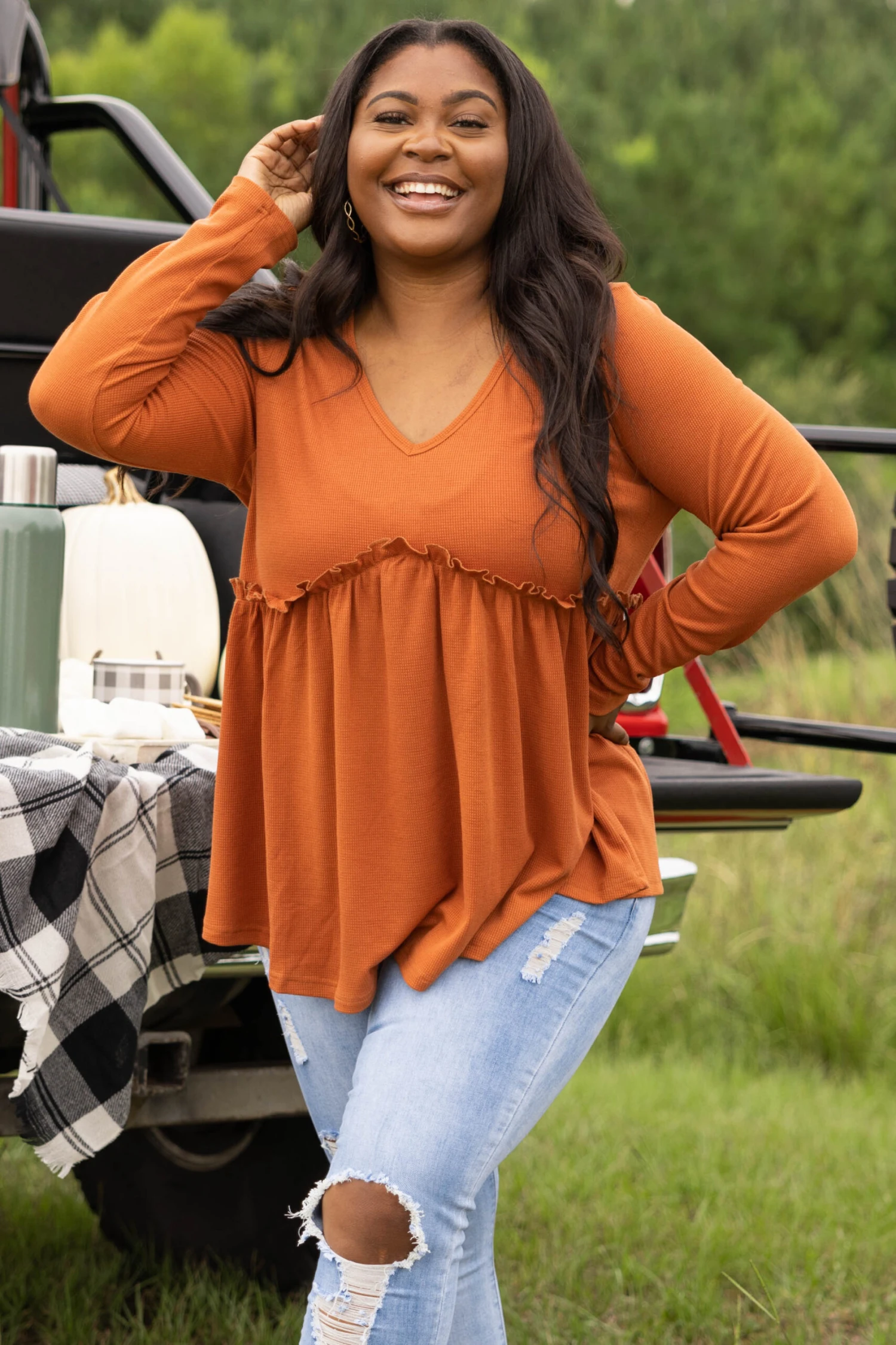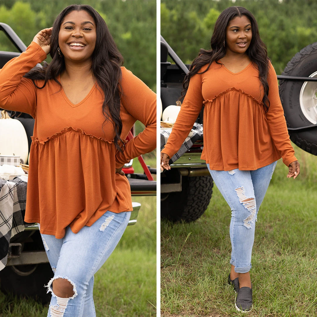 Don’t take a second thought about grabbing this cutie! This top has a beautiful babydoll design and bold rust color that is just in time for the season! The flowy fit is super sweet! Style this top with some cute skinnies and slides for a casual, chic look!